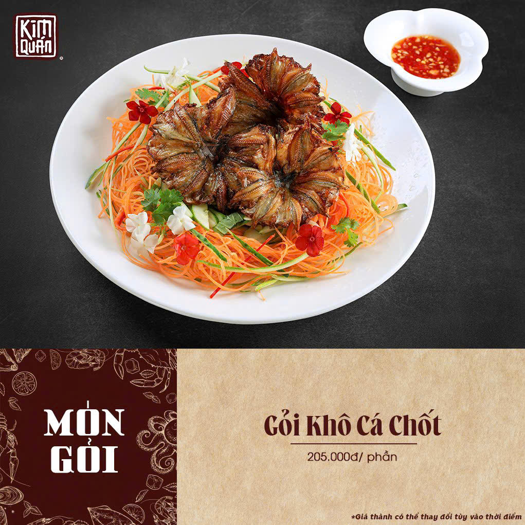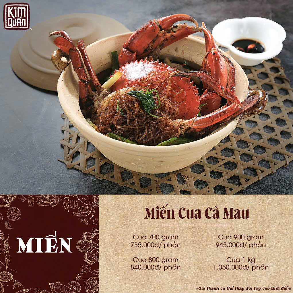 Dưới tay nghề của đội ngũ đầu bếp chuyên nghiệp, cùng sự sáng tạo trong phong cách nấu ăn. Những món ăn được bày ra trước mắt thực khách không khác gì một bàn tiệc hải sản sang trọng. Một trong những món được nhiều thực khách “chấm điểm 10” nhất tại Kim Quán phải kể đến miến cua. Từng sợi miến dai được xào thấm đẫm gia vị ăn cùng với thịt cua chắc nịch, tươi rói vị biển. Tất cả làm nên sự độc đáo, nét quyến rũ trong hương vị của món ăn tại Kim Quán.