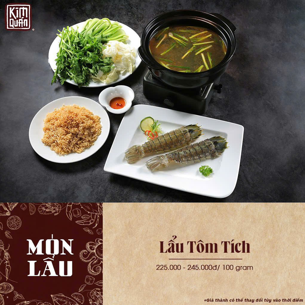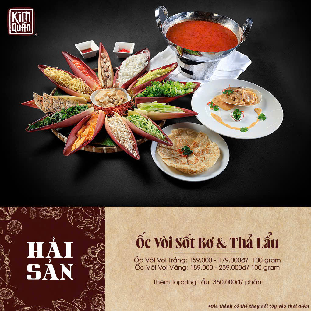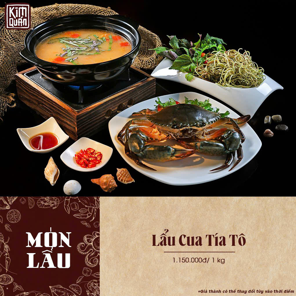Bên cạnh đó, Kim Quán còn phục vụ những loại hải sản cao cấp được nhập khẩu nguyên con tươi sống từ nước ngoài. Và được chế biến đa dạng. Như cua hoàng đế sốt tiêu đen, tôm hùm nấu lẩu Thái,…Sự kết hợp giữa không gian thoáng đãng cùng thực đơn hảo hàng đã khiến Kim Quán trở thành top nhà hàng hải sản tại TP.Hồ Chí Minh.