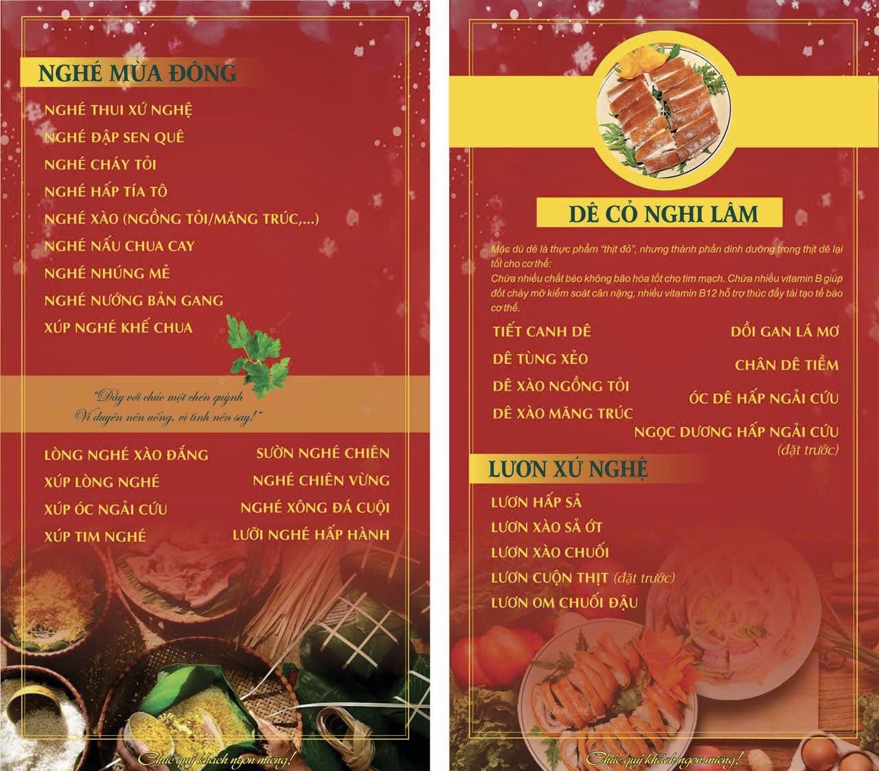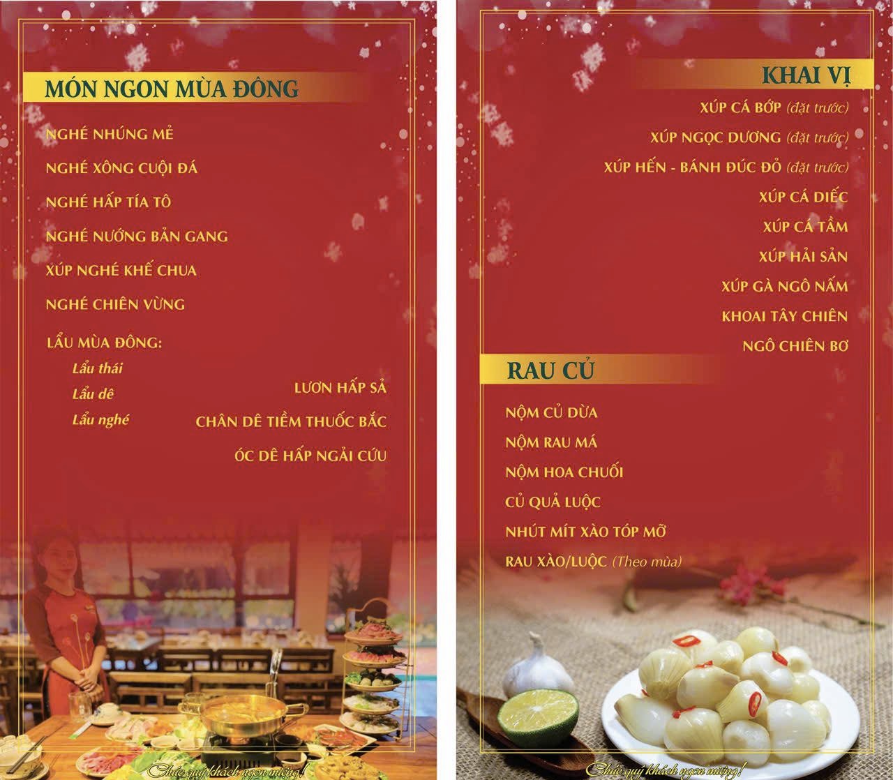 Nhà hàng phục vụ đa dạng các nhóm món như hải sản tươi sống, dê núi các món, gà quê, cá sông – cá đồng, lẩu đặc sản, món đồng quê xứ Nghệ, set cơm Việt, món nhậu truyền thống, đặc sản vùng miền và các món theo mùa. Sự phong phú này giúp thực khách dễ dàng lựa chọn món ăn phù hợp cho từng bữa tiệc hay mục đích sử dụng.