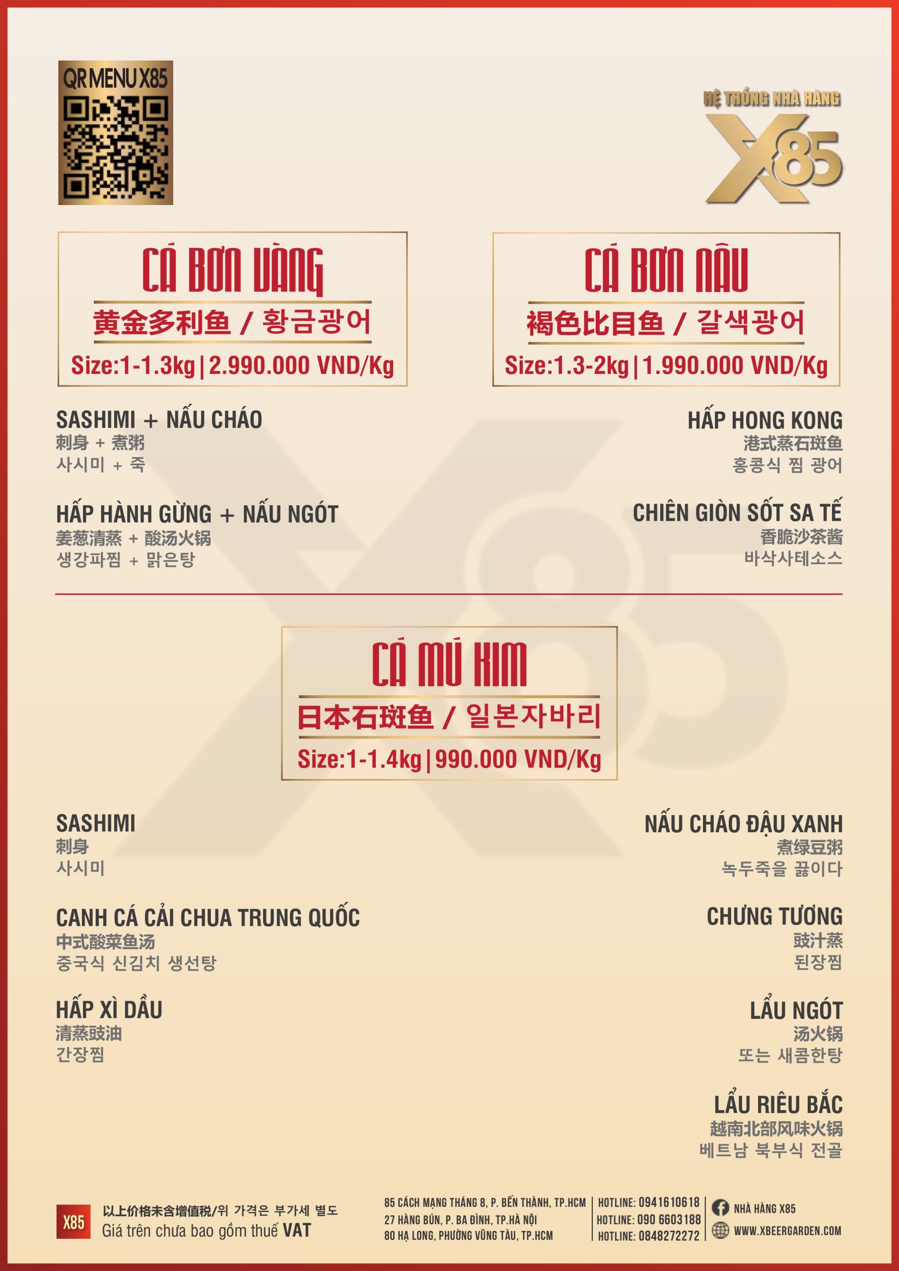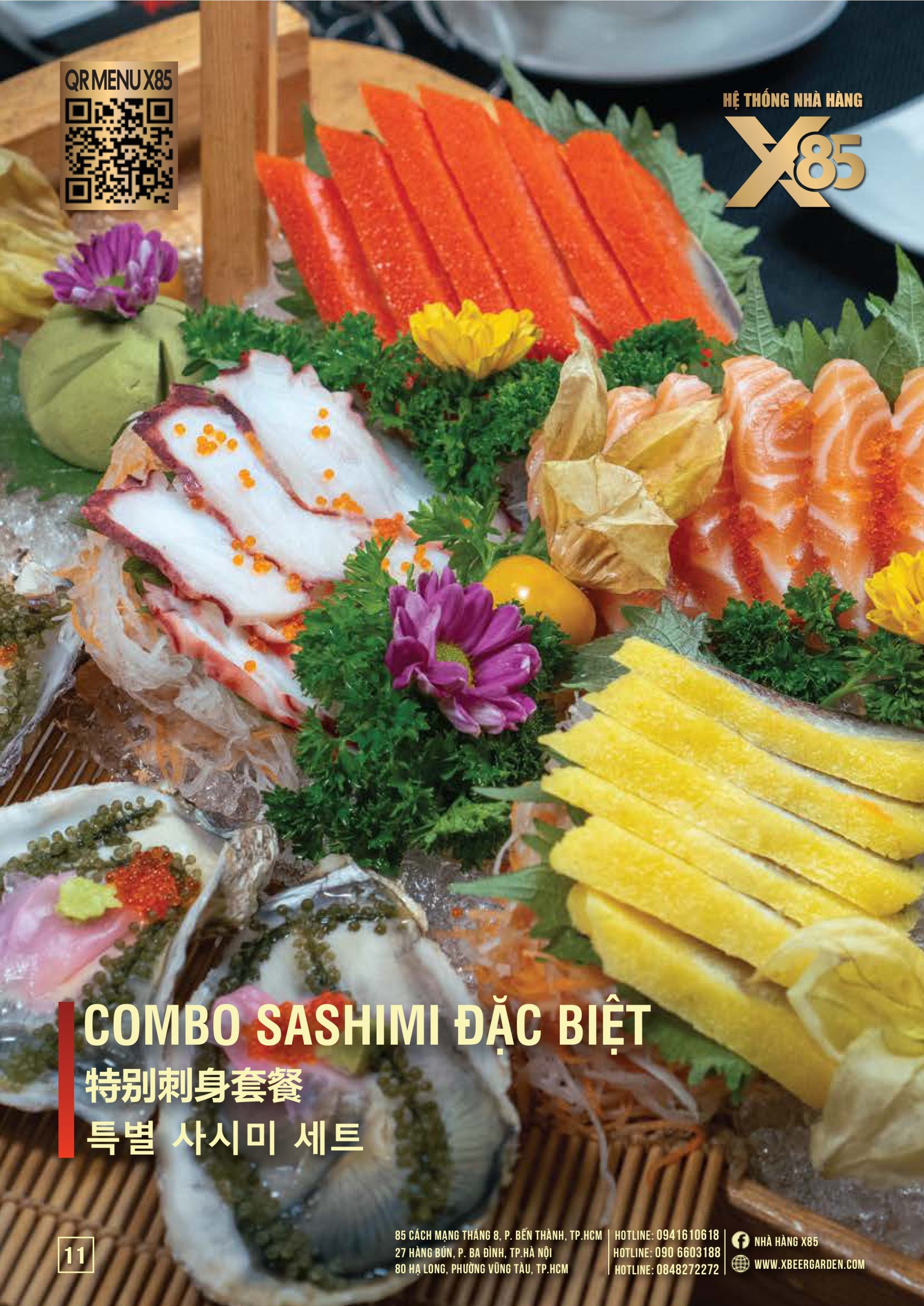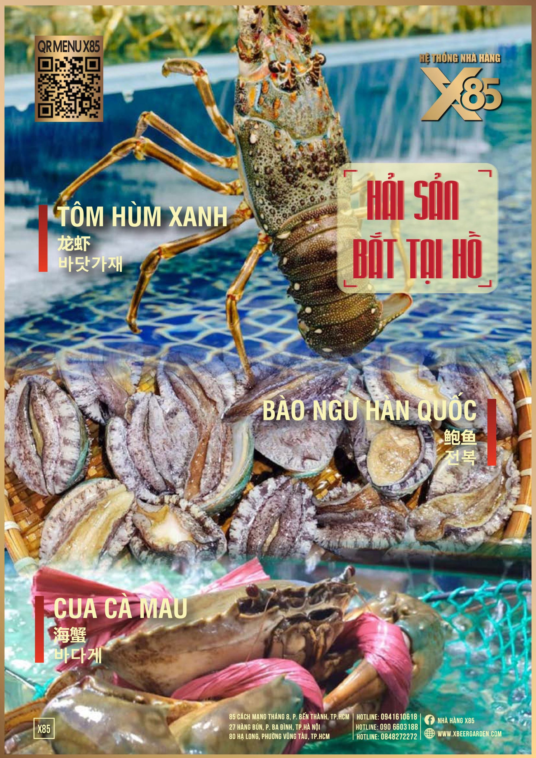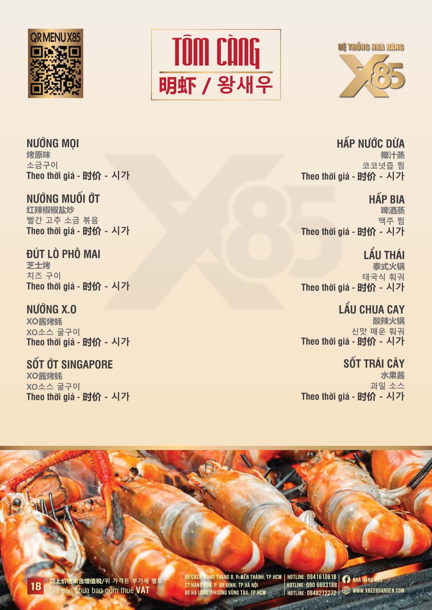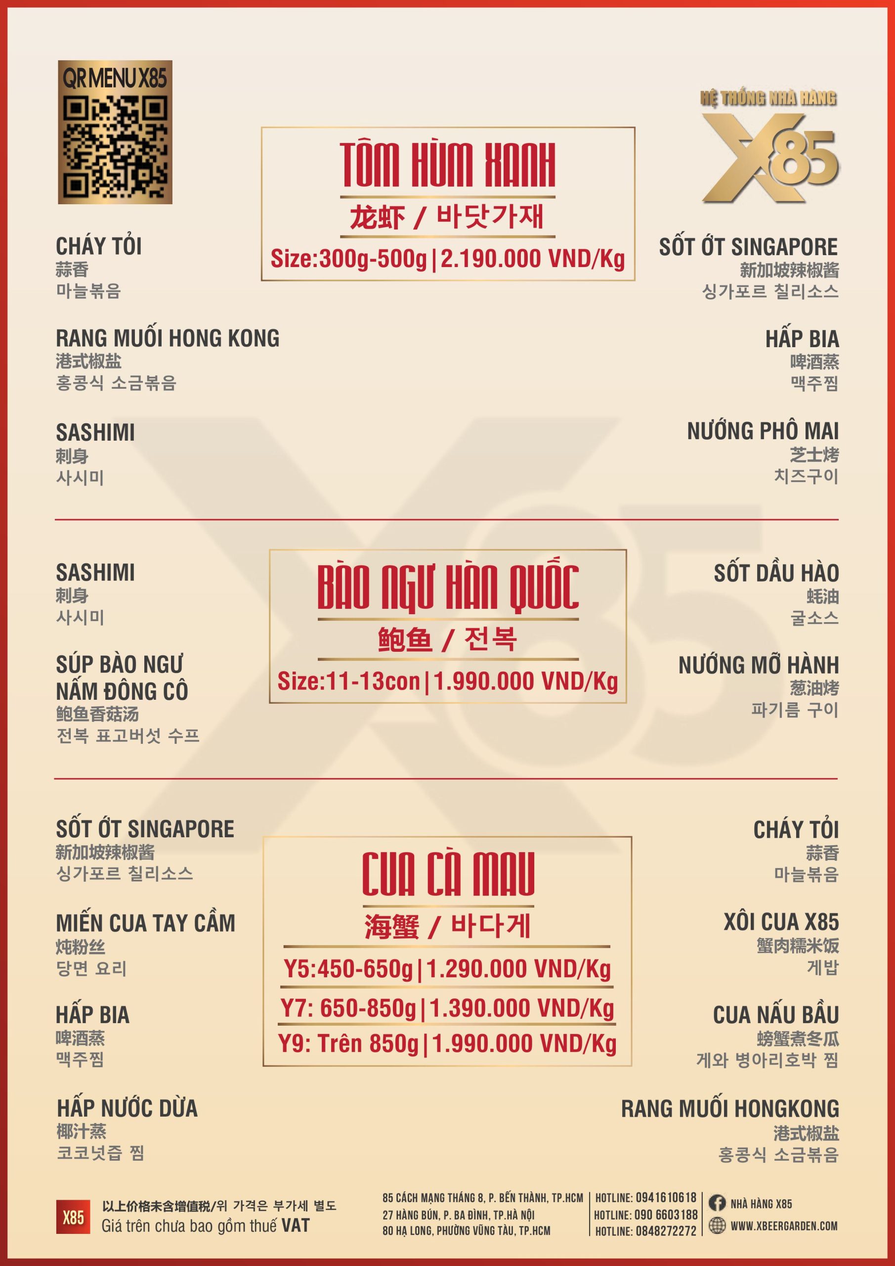 Với hơn 100 món ăn đa dạng từ hải sản tươi sống, món nướng, lẩu đến các món Âu hiện đại, X85 mang tới trải nghiệm ẩm thực kết hợp giữa tinh hoa châu Á và châu Âu.