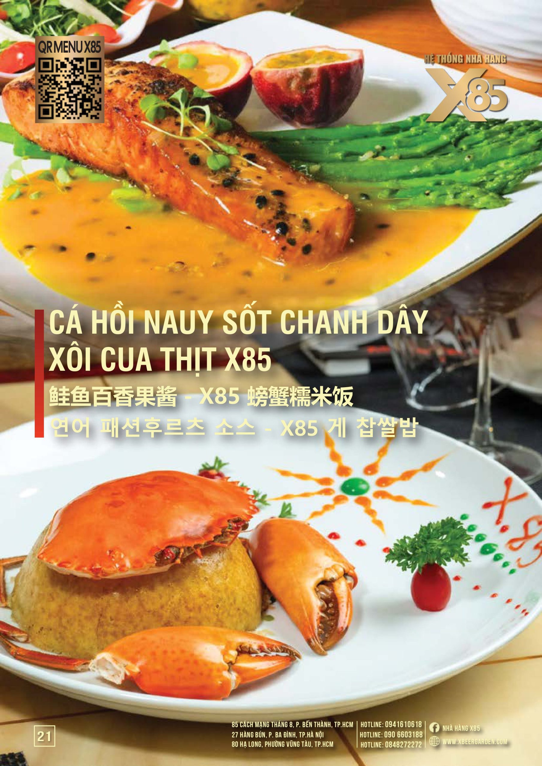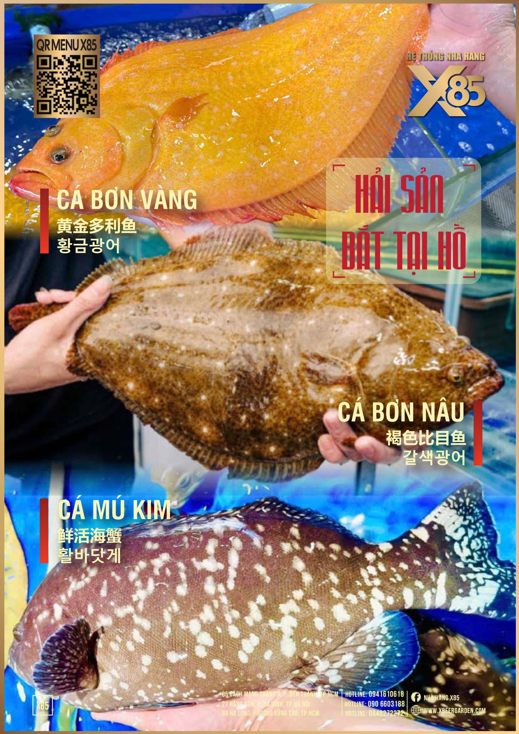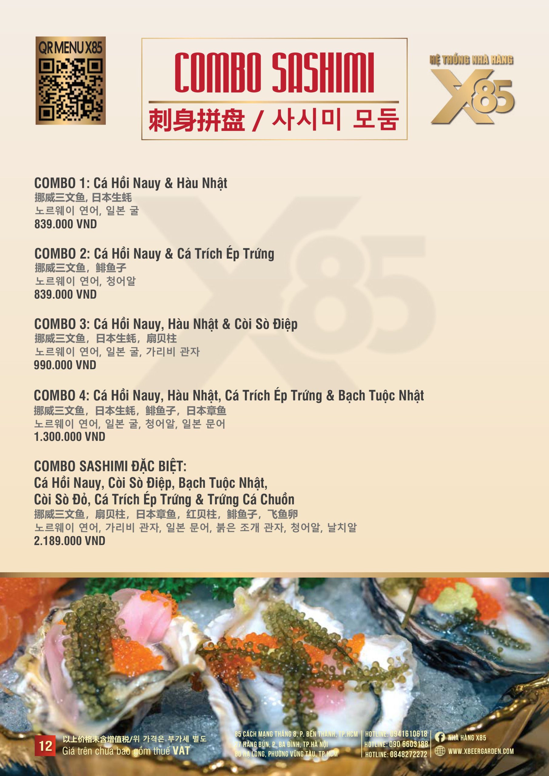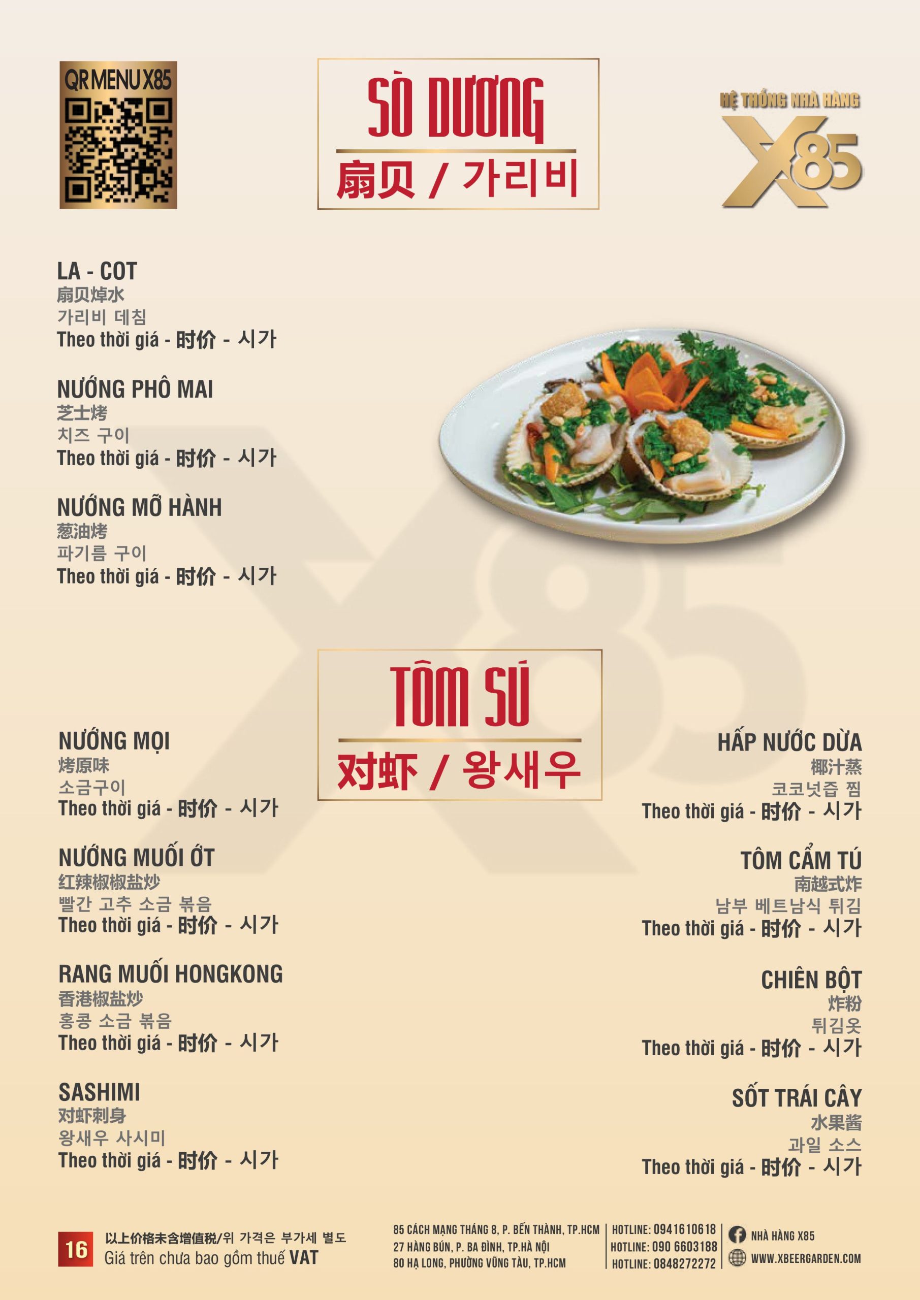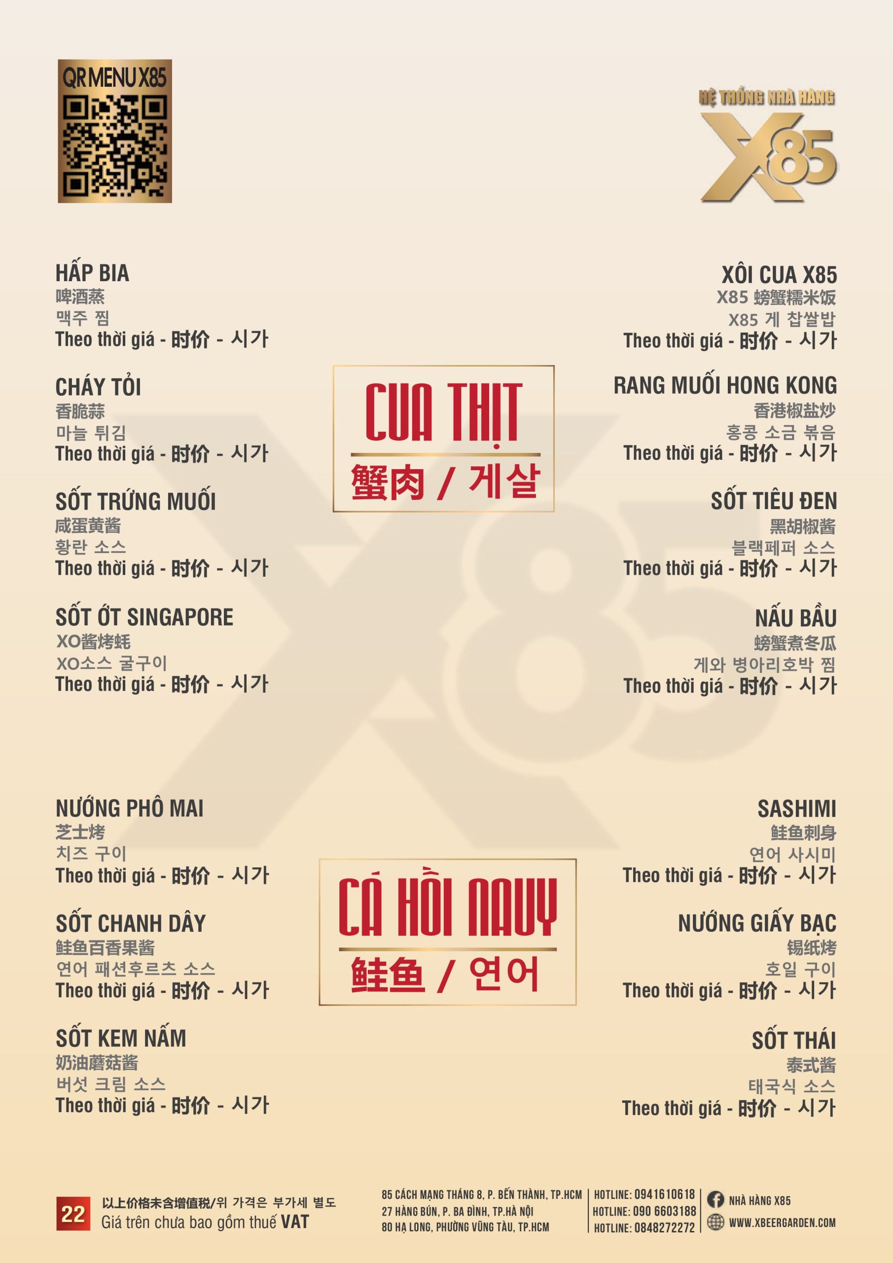 Với hơn 100 món ăn đa dạng từ hải sản tươi sống, món nướng, lẩu đến các món Âu hiện đại, X85 mang tới trải nghiệm ẩm thực kết hợp giữa tinh hoa châu Á và châu Âu.