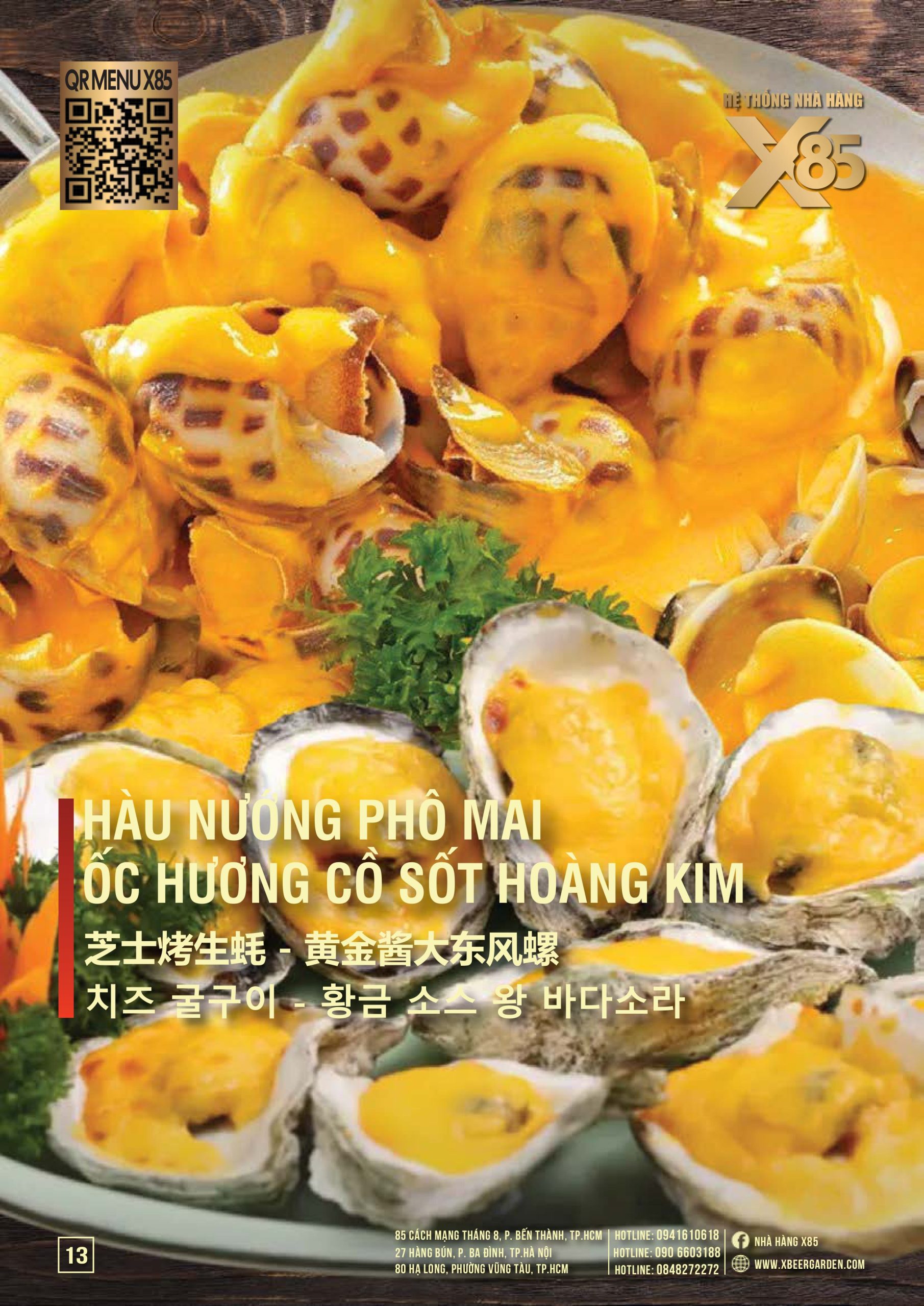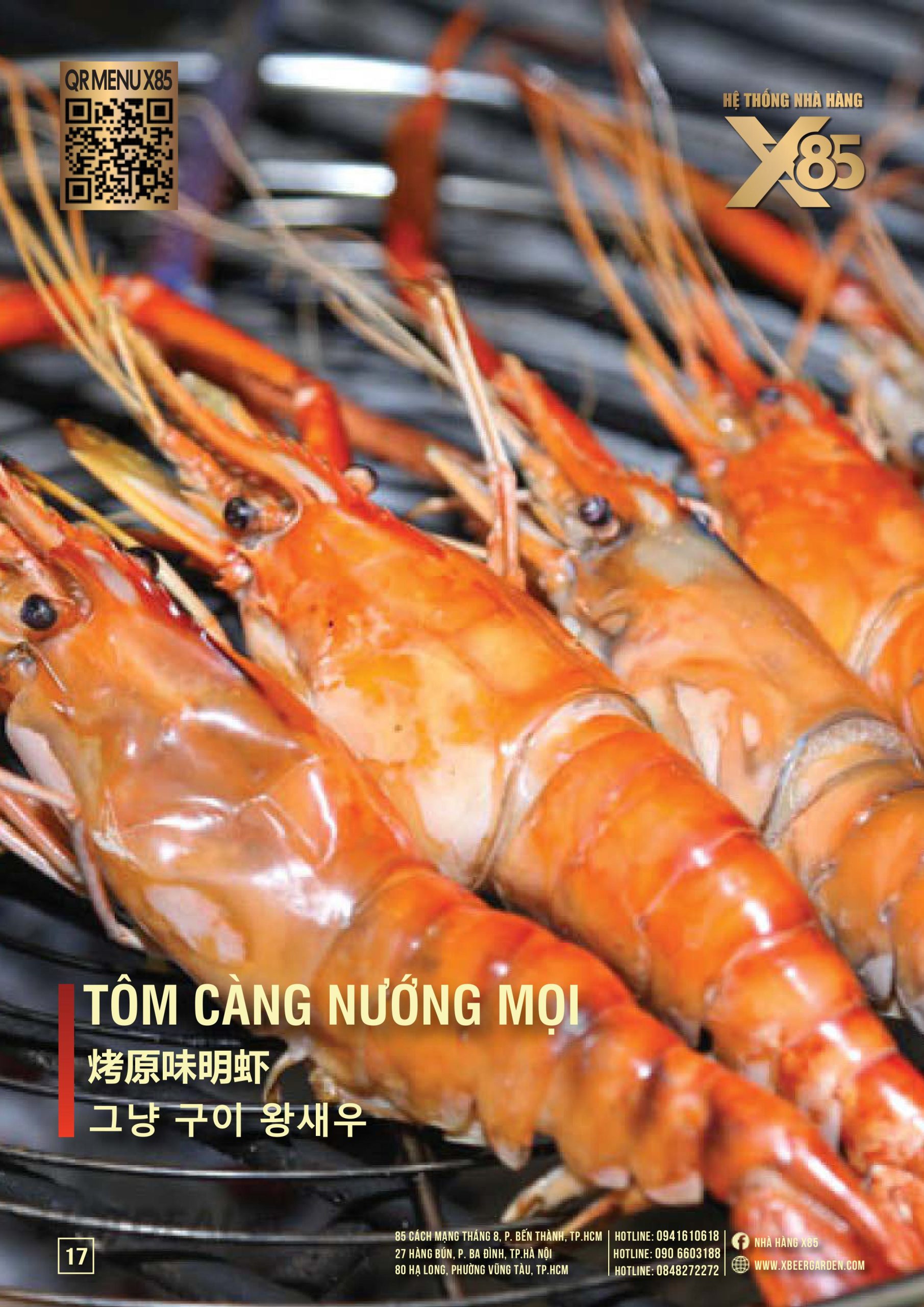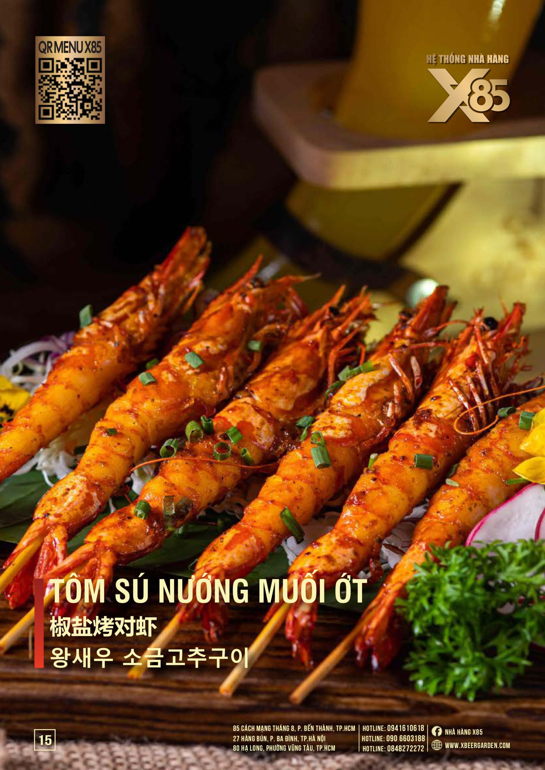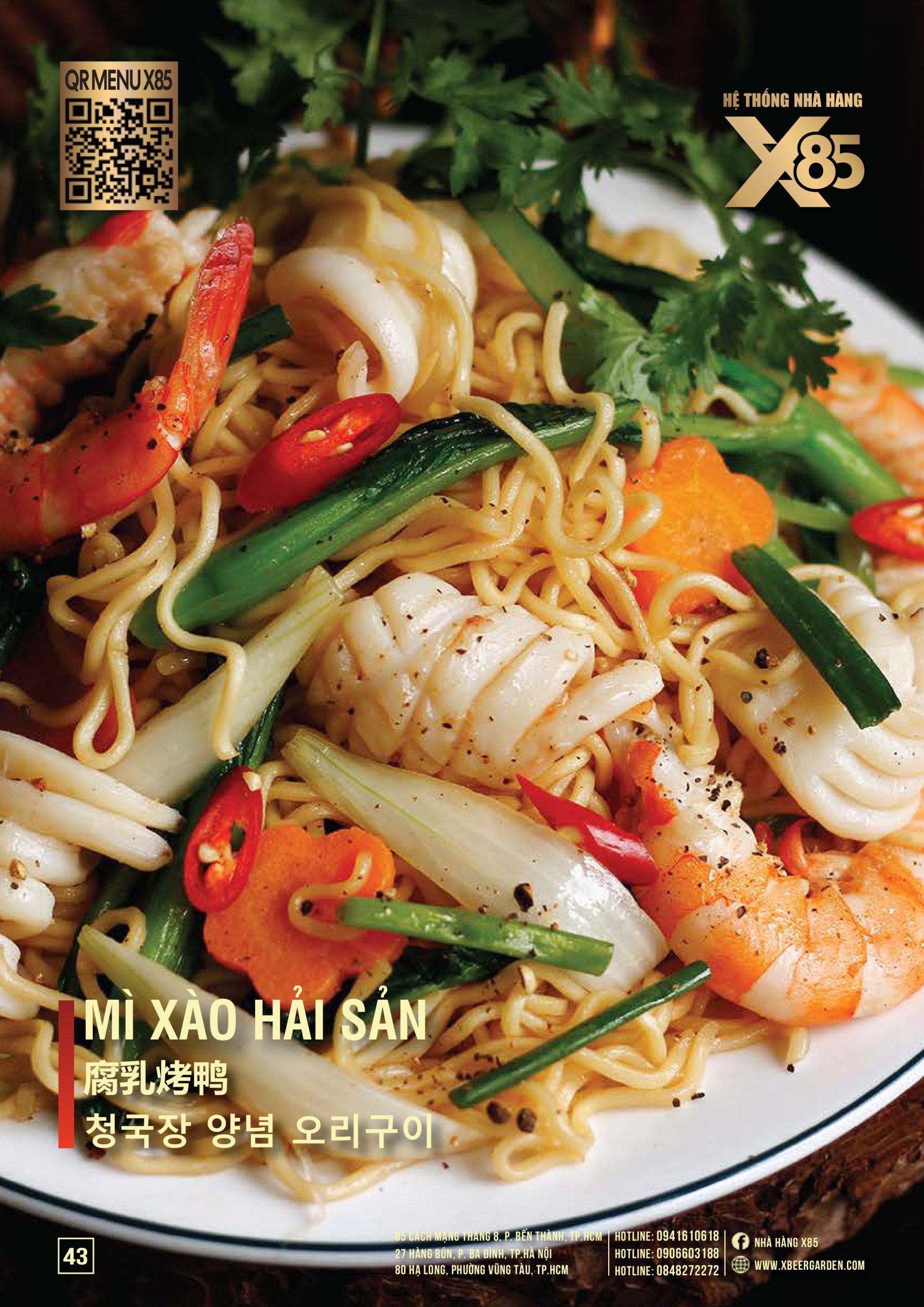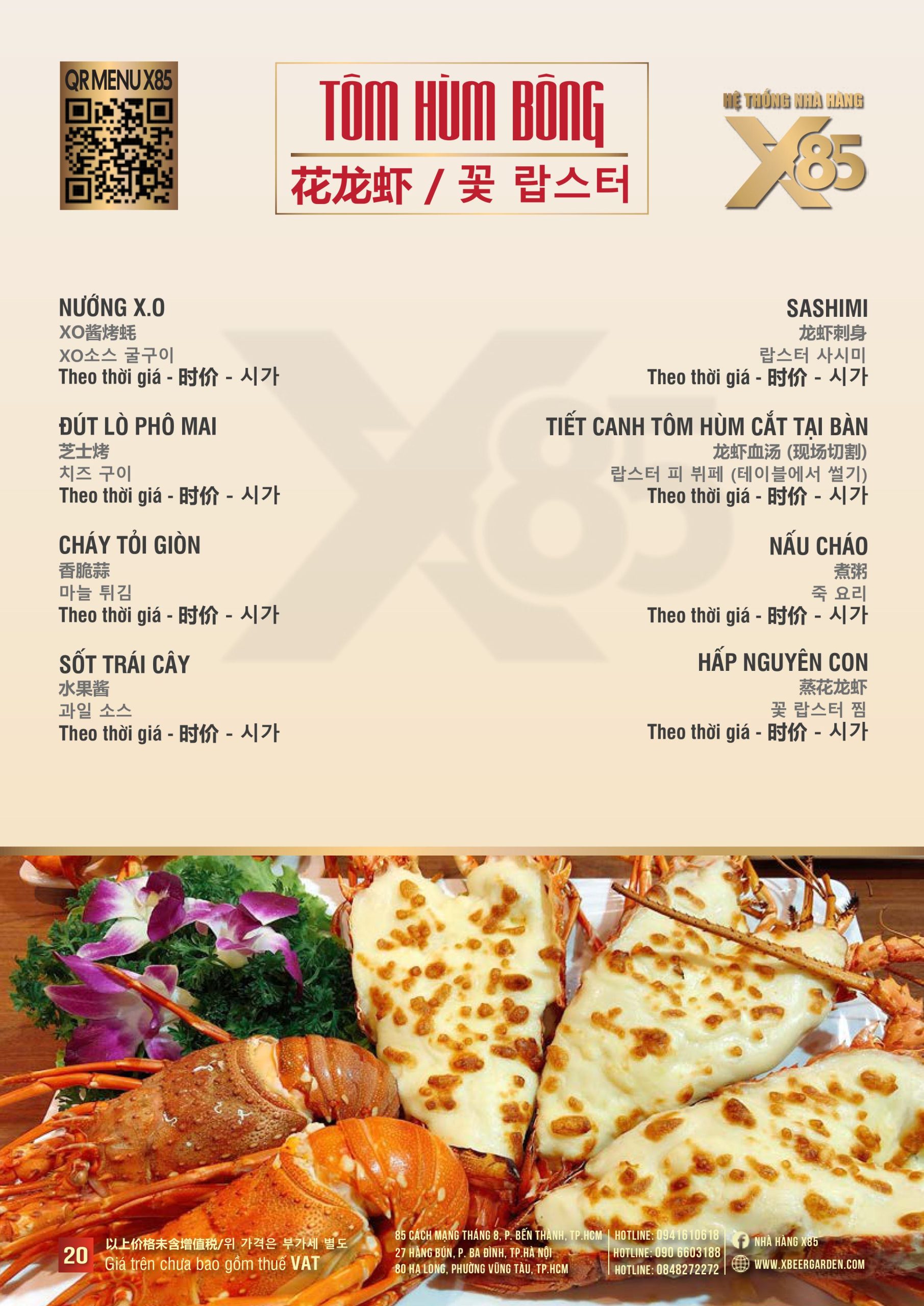 Với hơn 100 món ăn đa dạng từ hải sản tươi sống, món nướng, lẩu đến các món Âu hiện đại, X85 mang tới trải nghiệm ẩm thực kết hợp giữa tinh hoa châu Á và châu Âu.