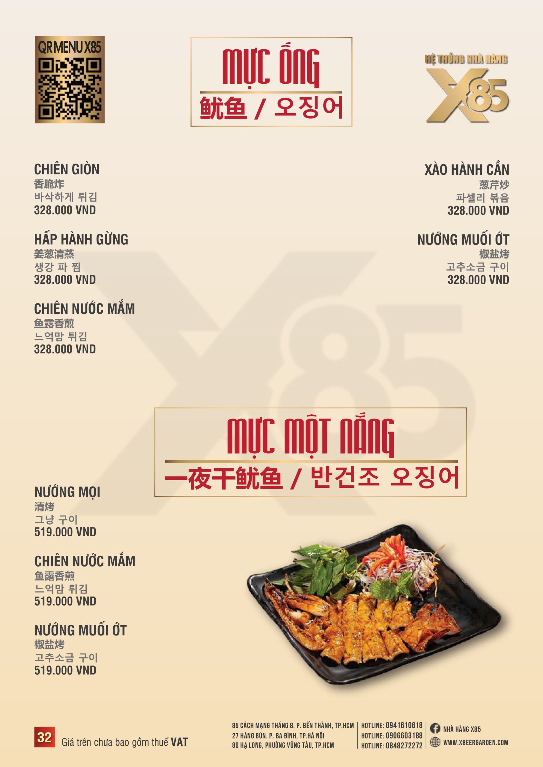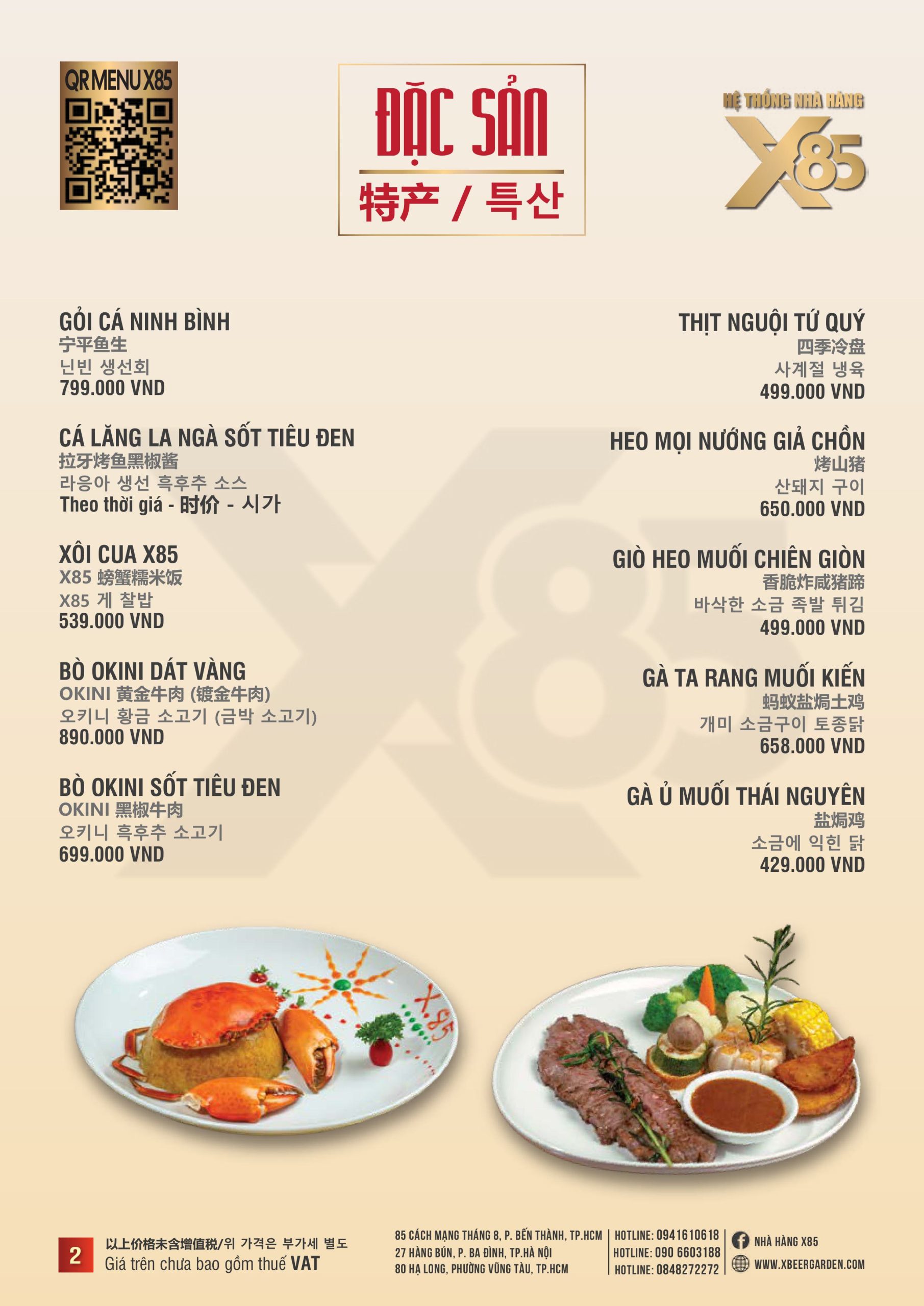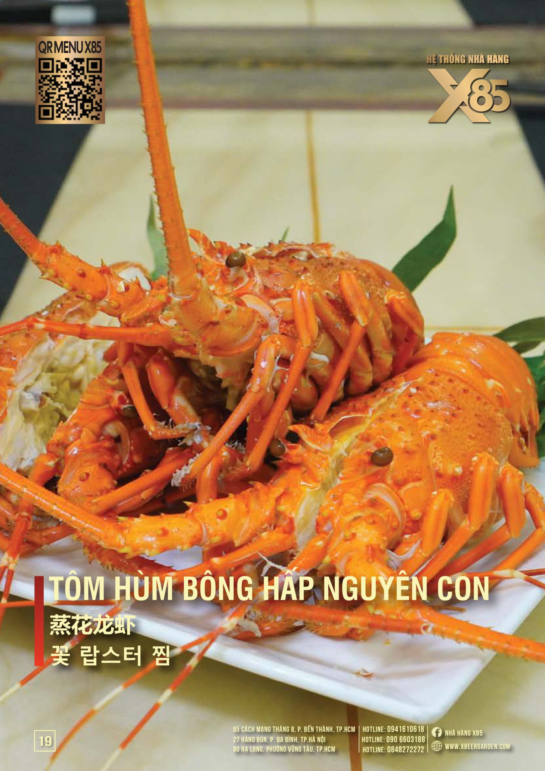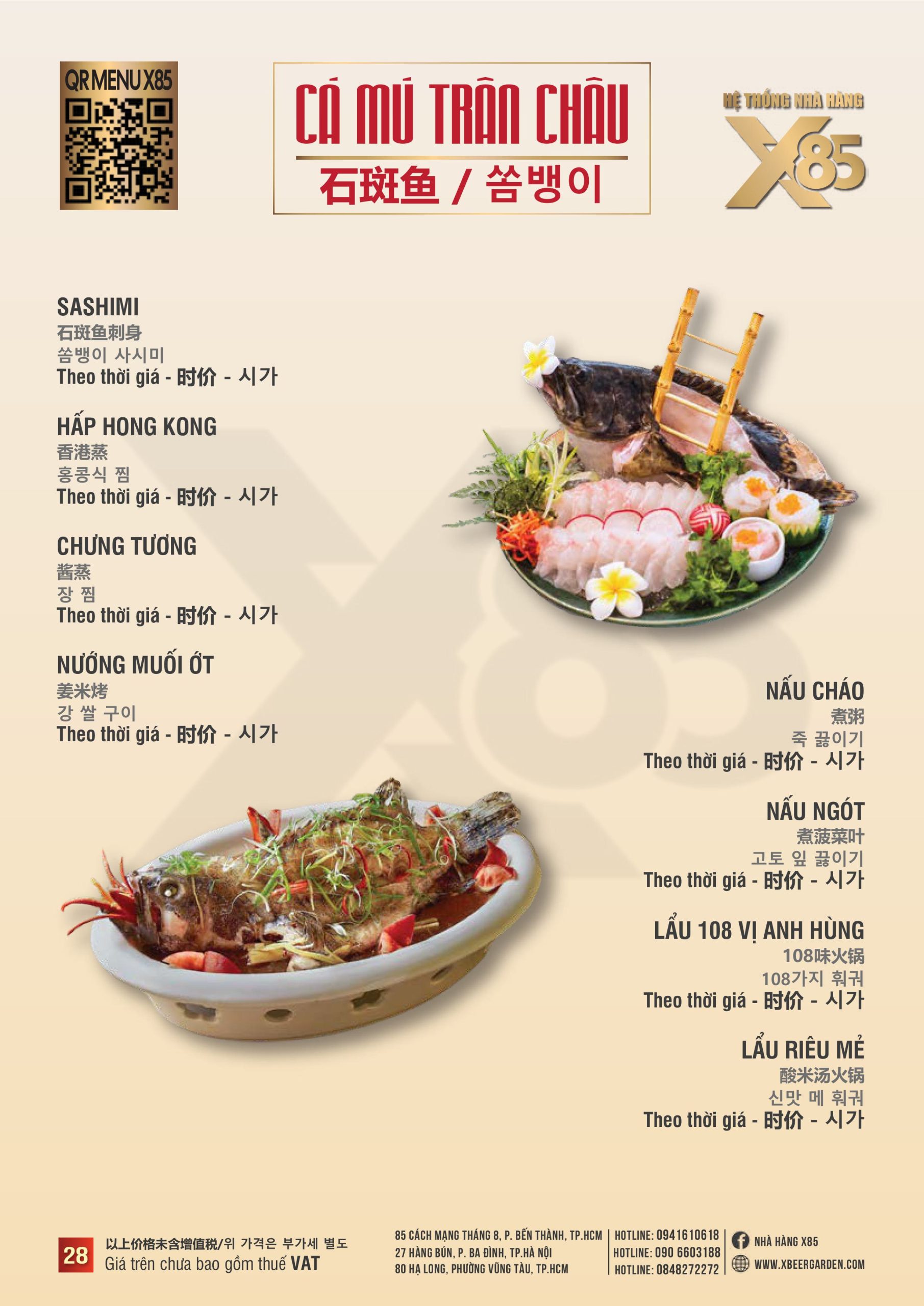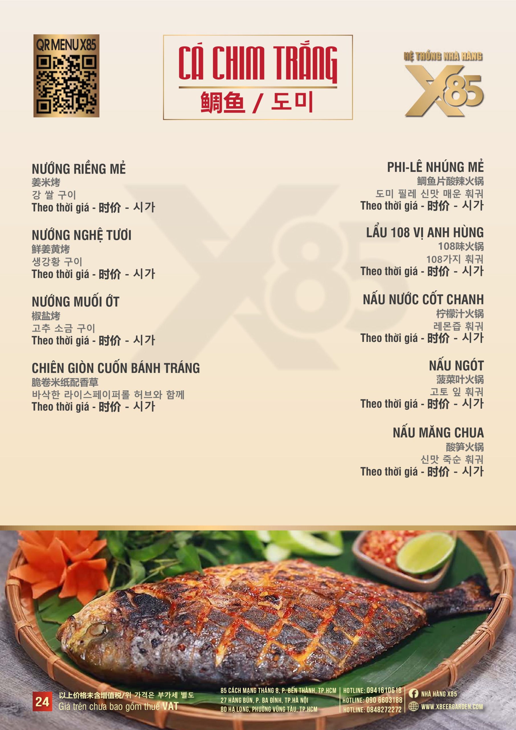 Với hơn 100 món ăn đa dạng từ hải sản tươi sống, món nướng, lẩu đến các món Âu hiện đại, X85 mang tới trải nghiệm ẩm thực kết hợp giữa tinh hoa châu Á và châu Âu.