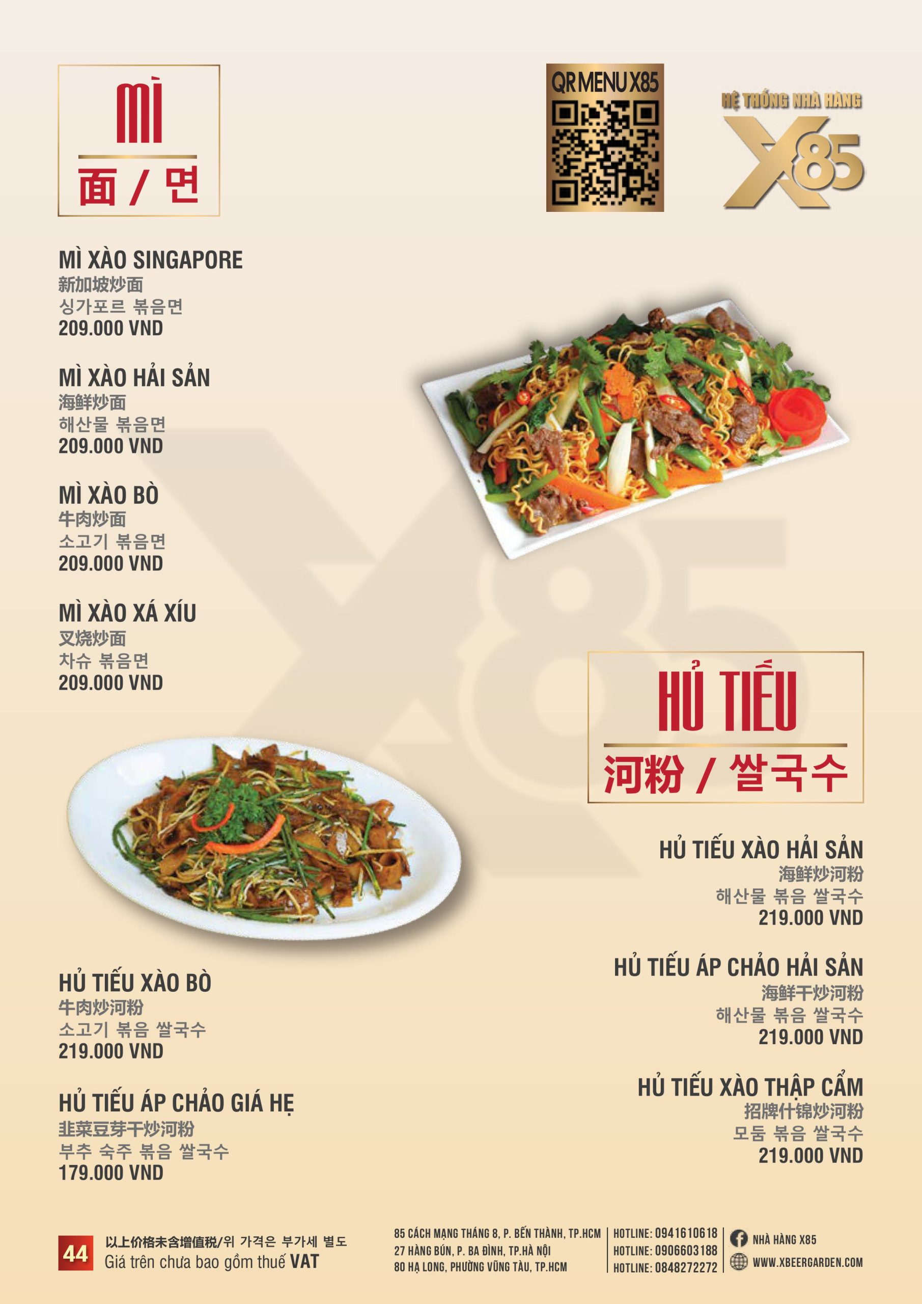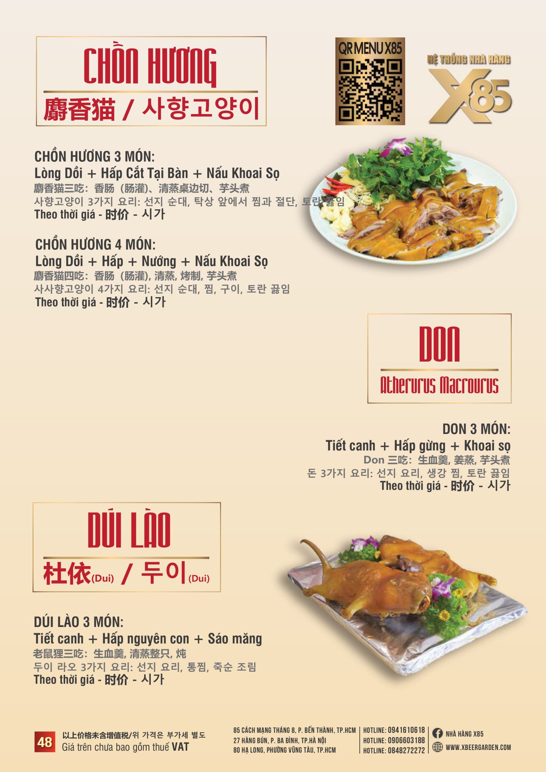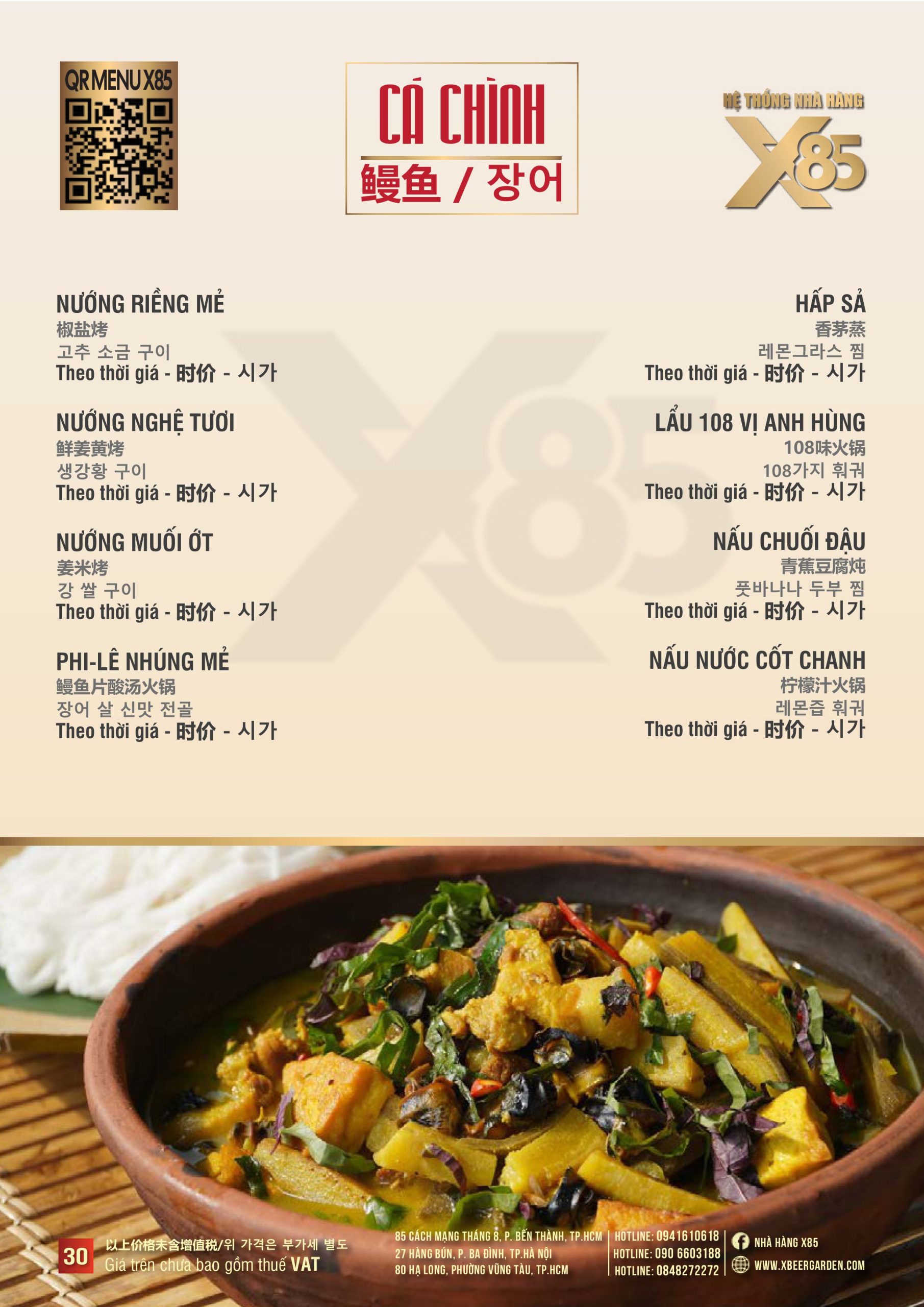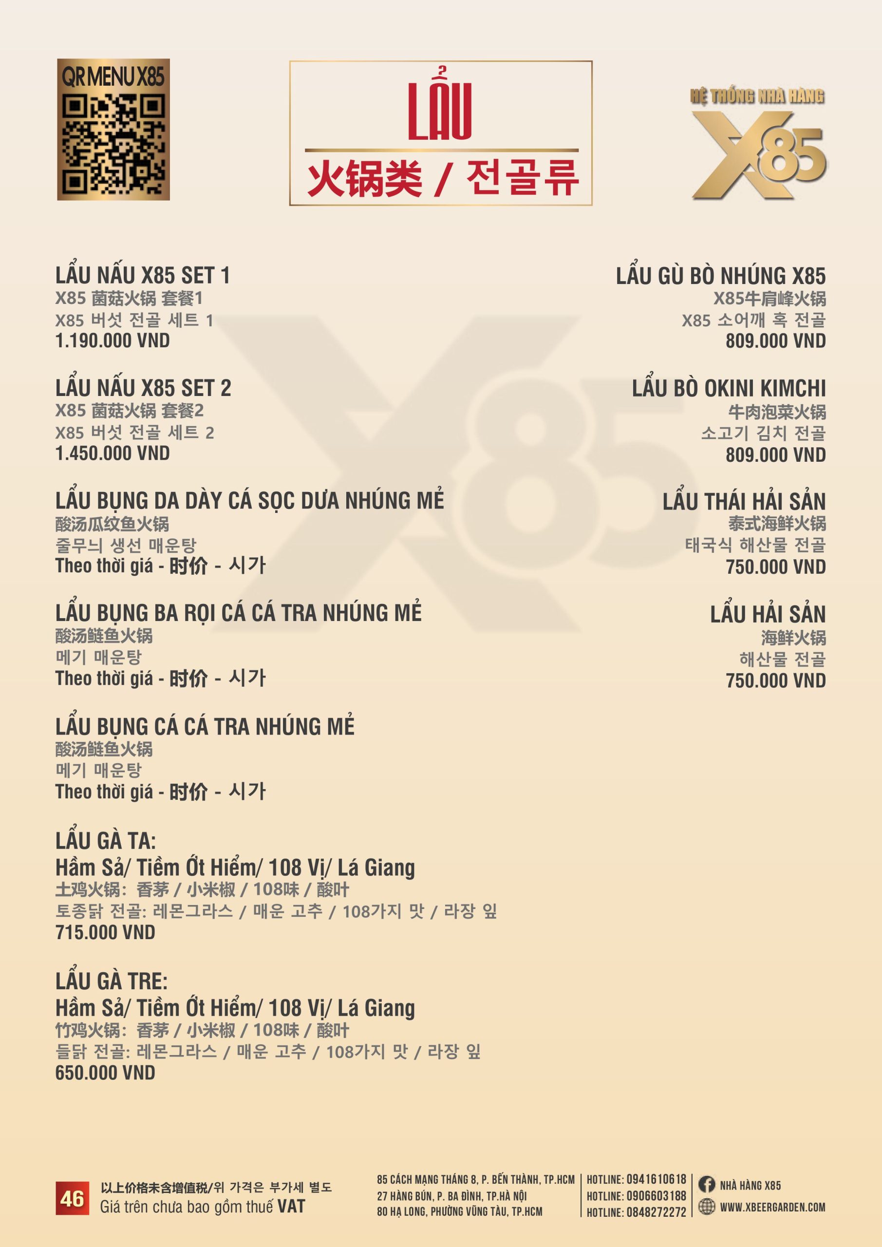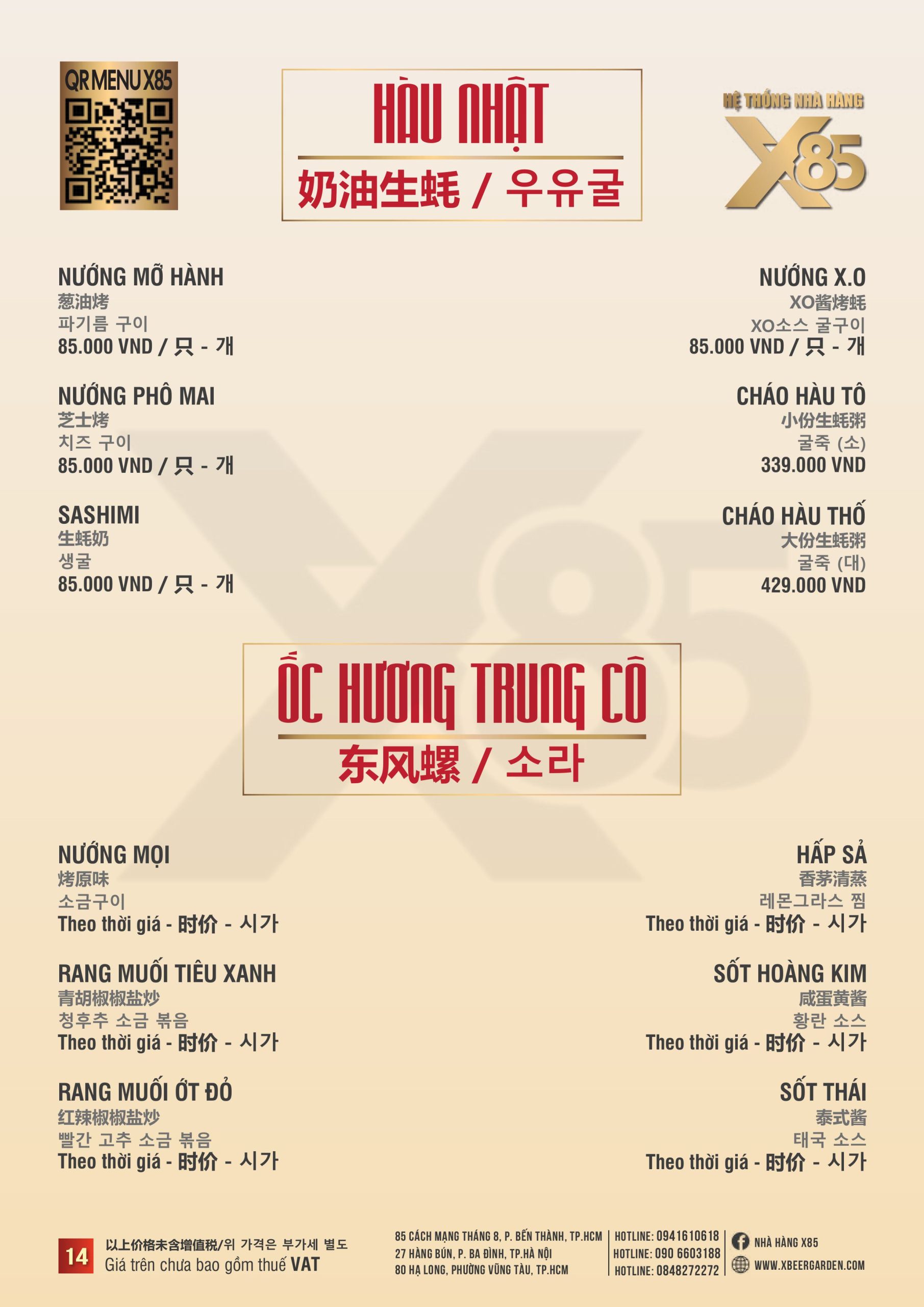 Với hơn 100 món ăn đa dạng từ hải sản tươi sống, món nướng, lẩu đến các món Âu hiện đại, X85 mang tới trải nghiệm ẩm thực kết hợp giữa tinh hoa châu Á và châu Âu.