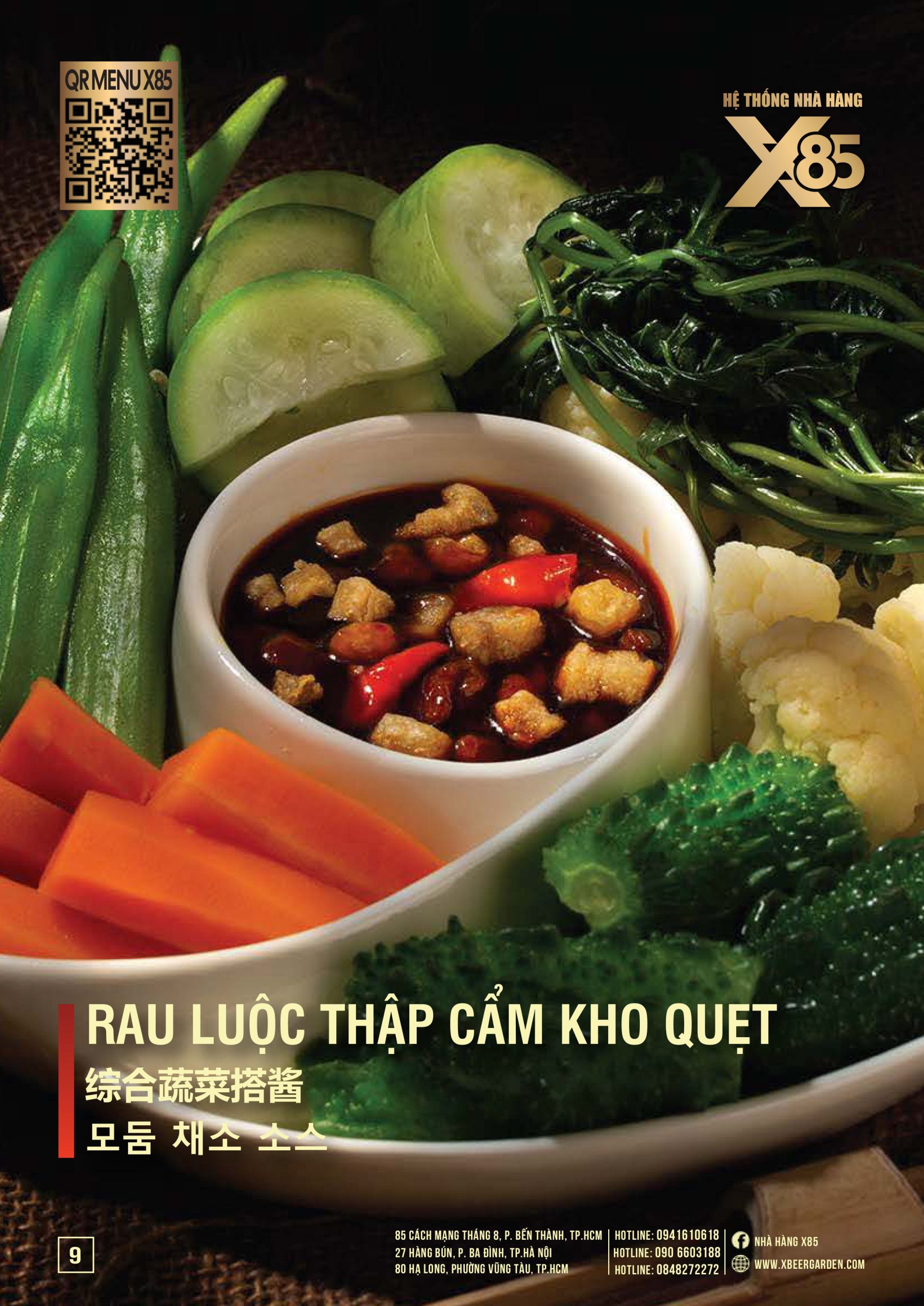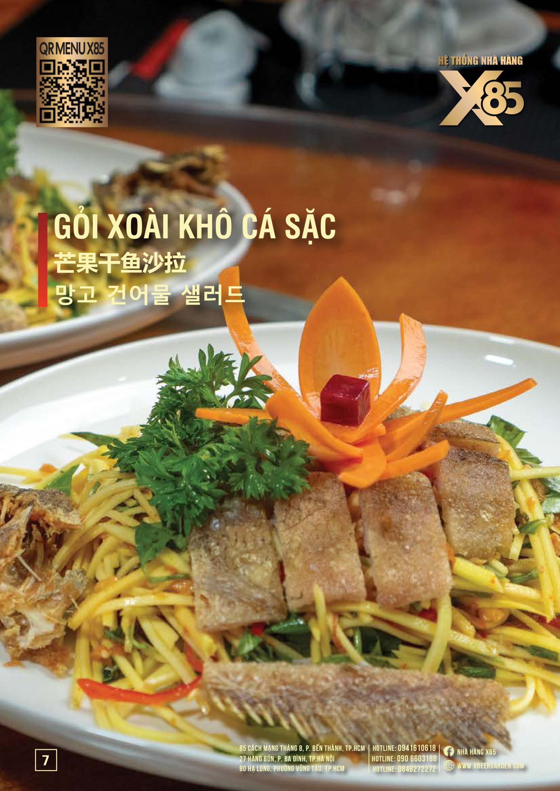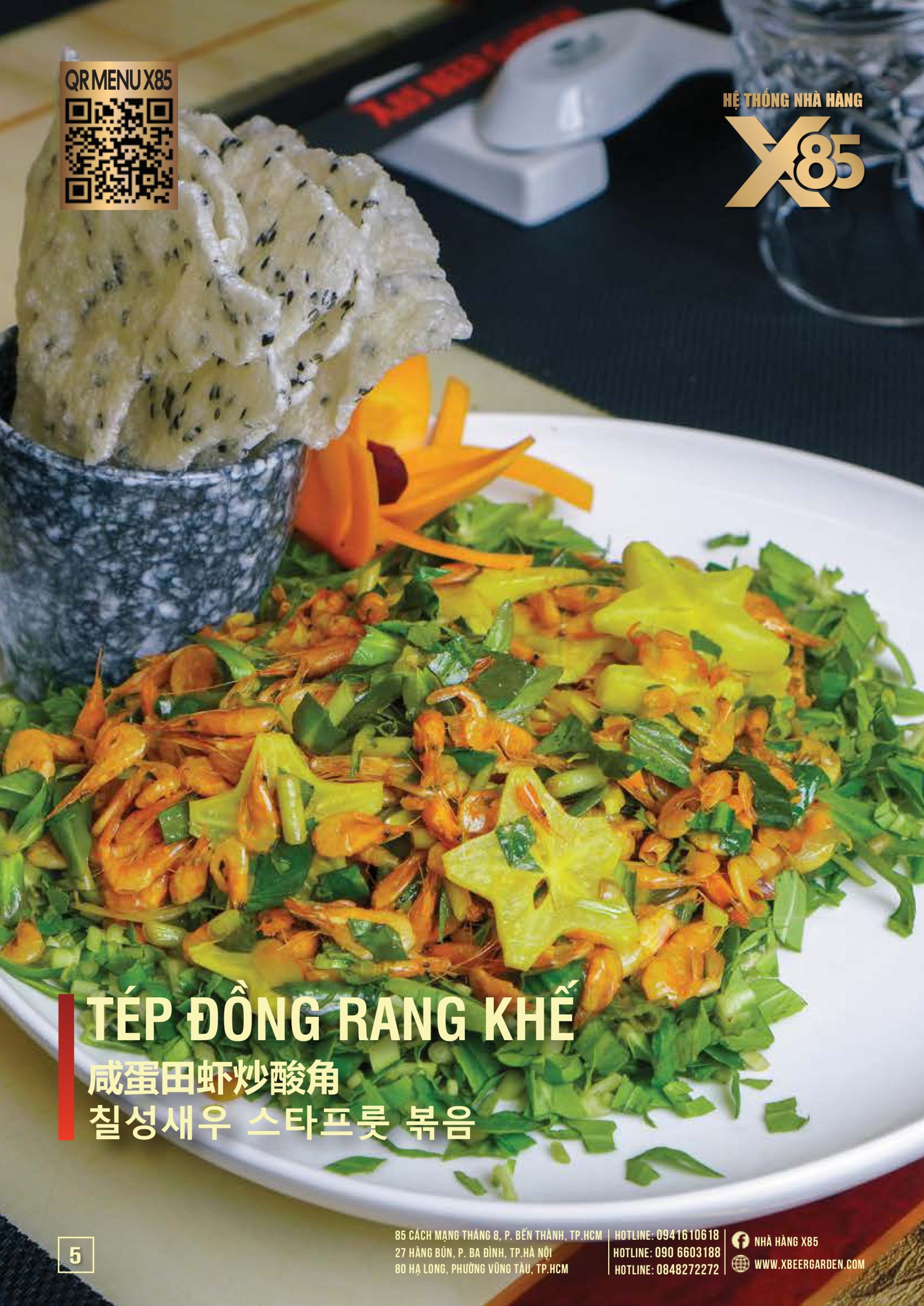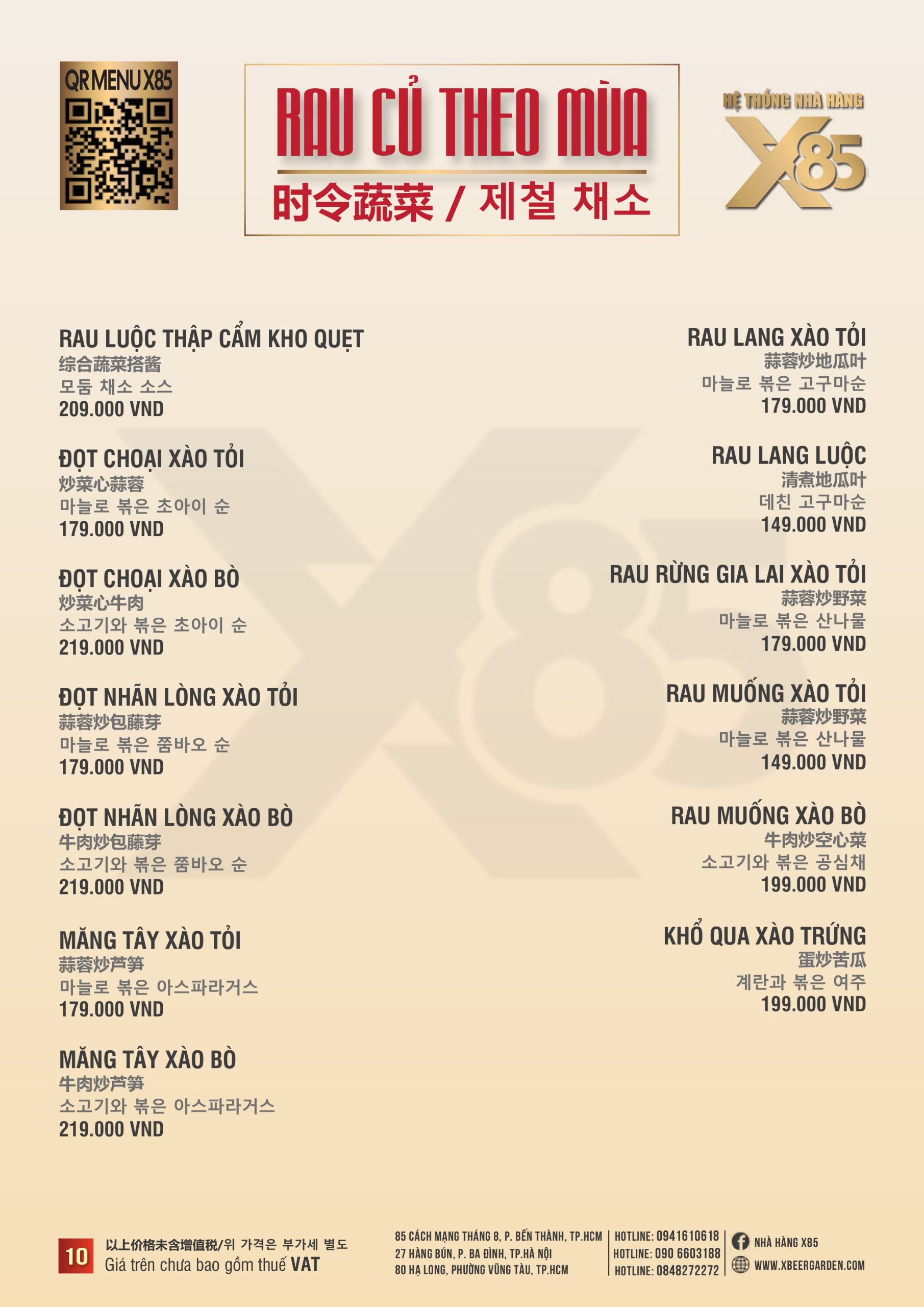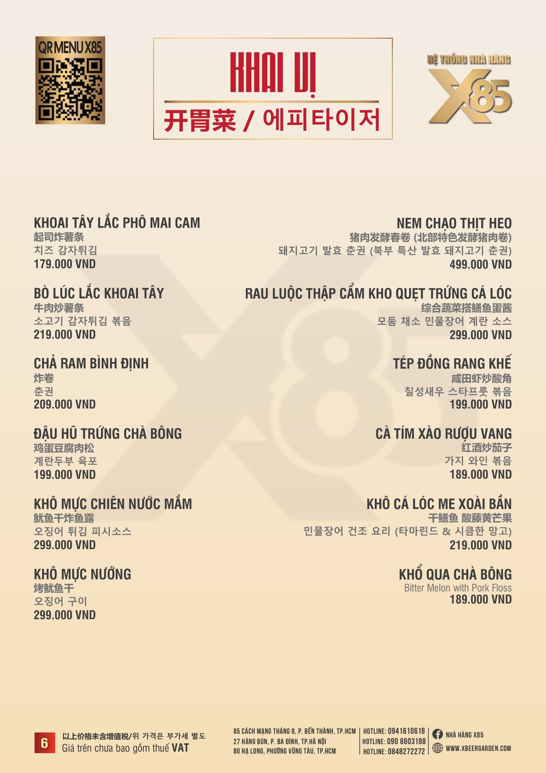 Thực đơn đa dạng và phong phú tại Nhà hàng X85 Hồ Chí Minh giúp khách hàng tận hưởng ẩm thực không giới hạn, từ các món khai vị hấp dẫn đến các món chính đặc sắc với hương vị riêng biệt và cả những món tráng miệng ngọt ngào.
