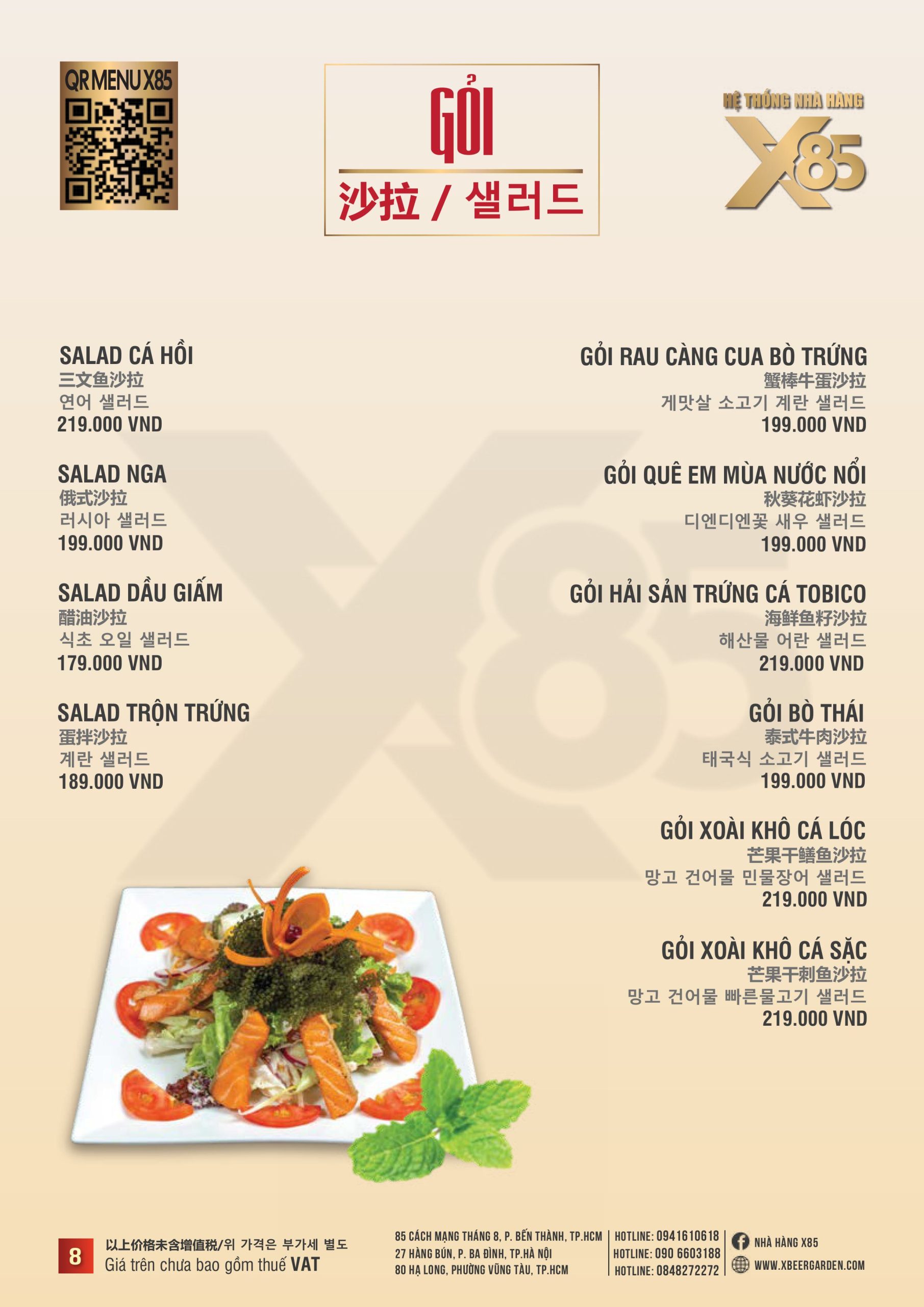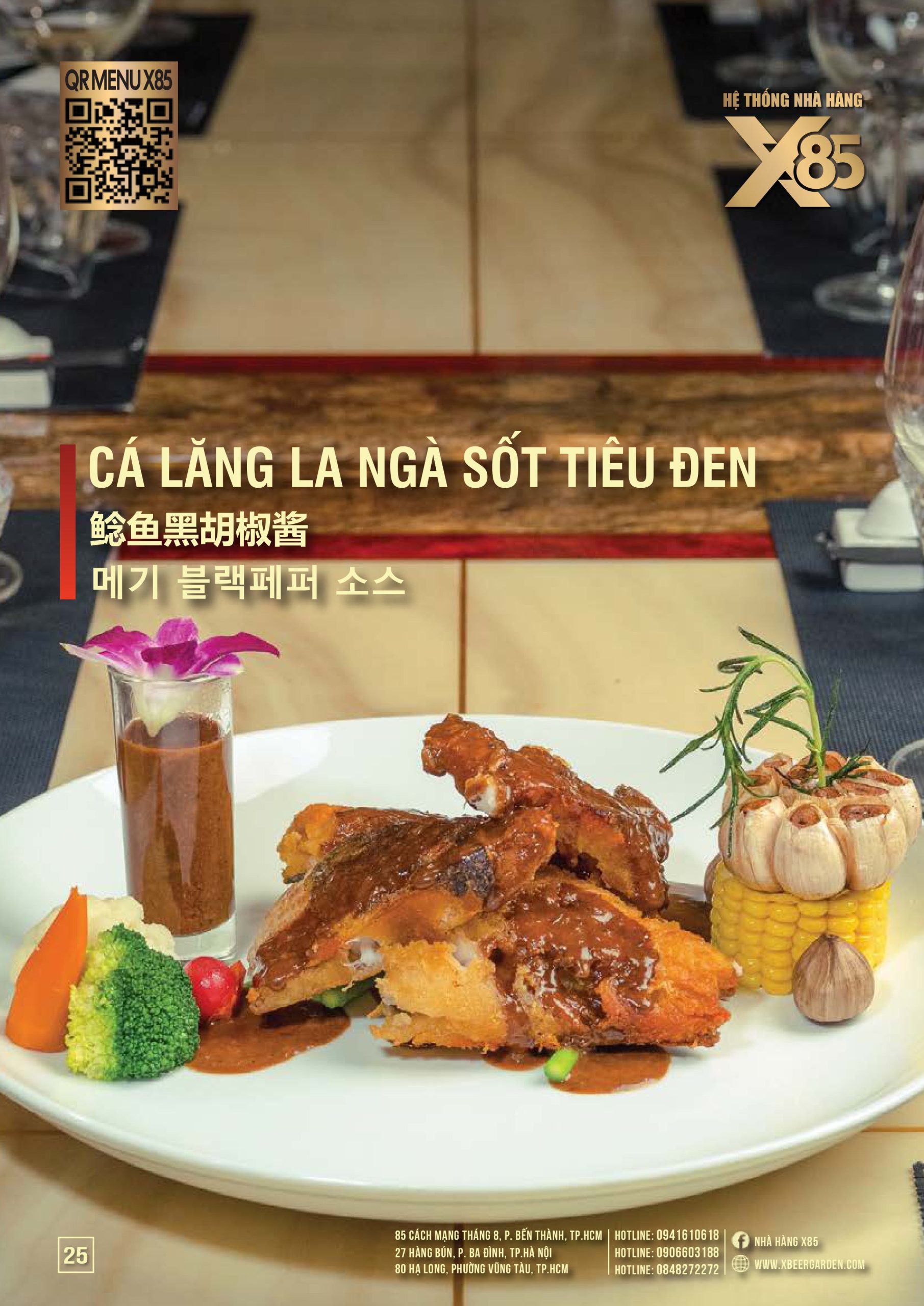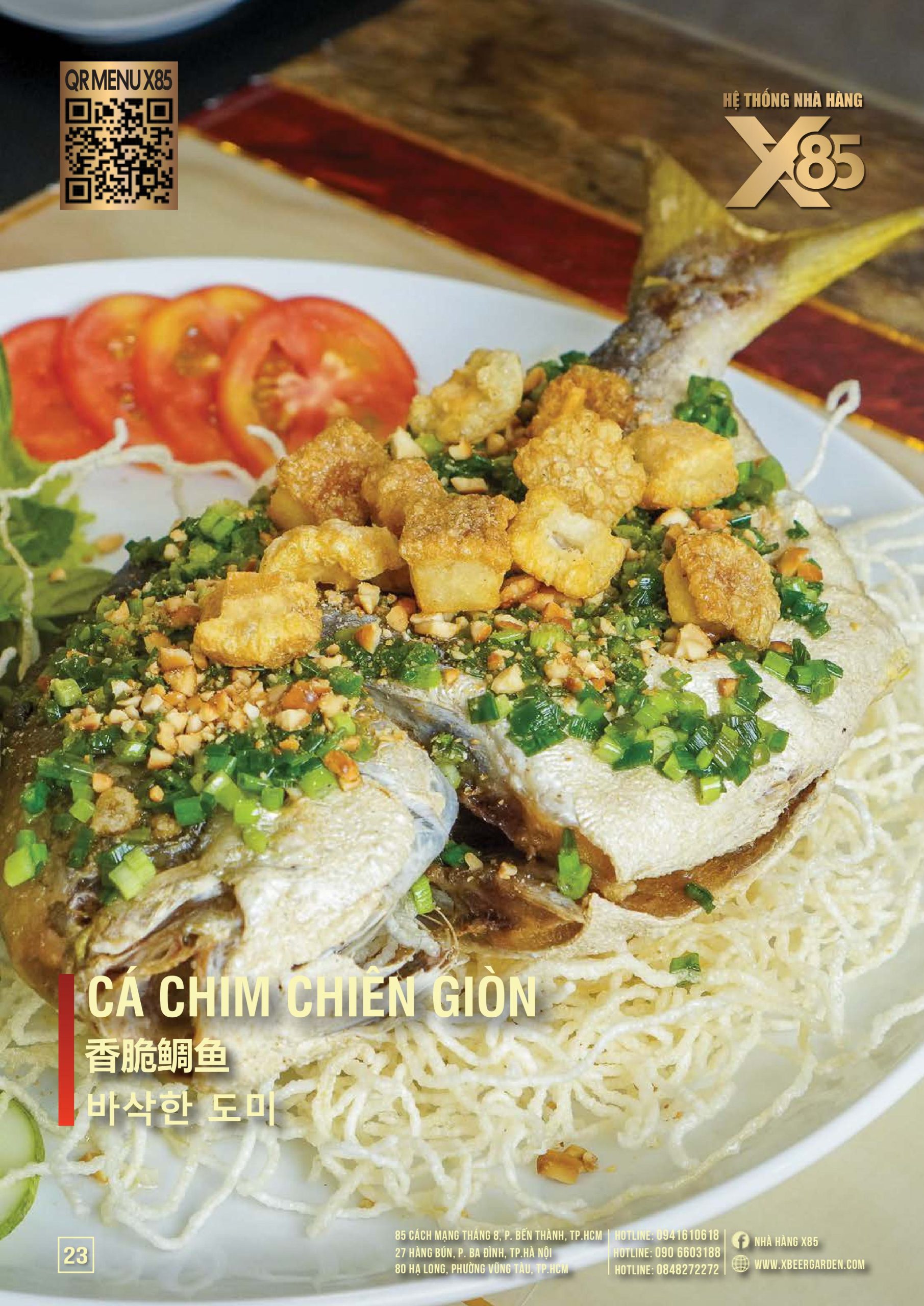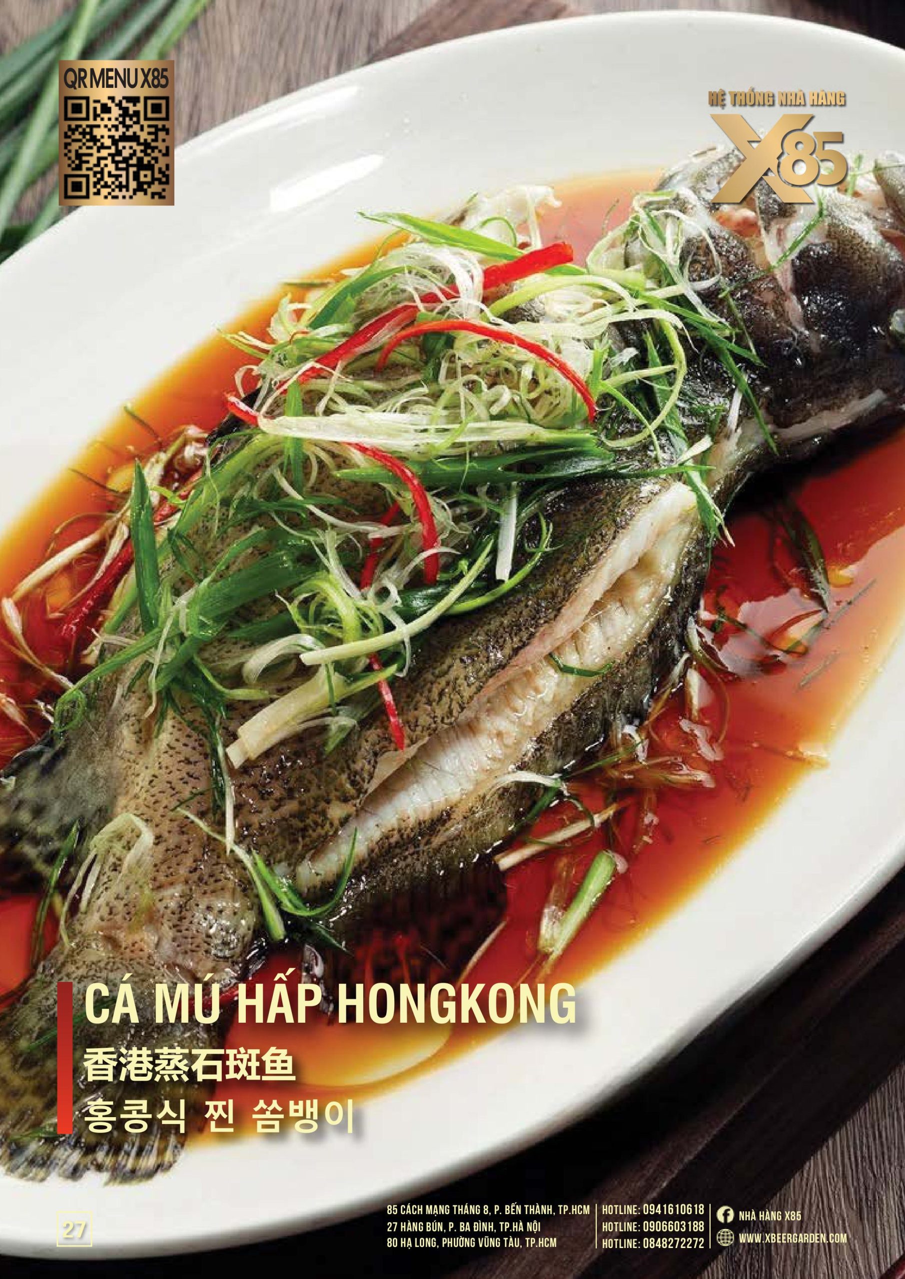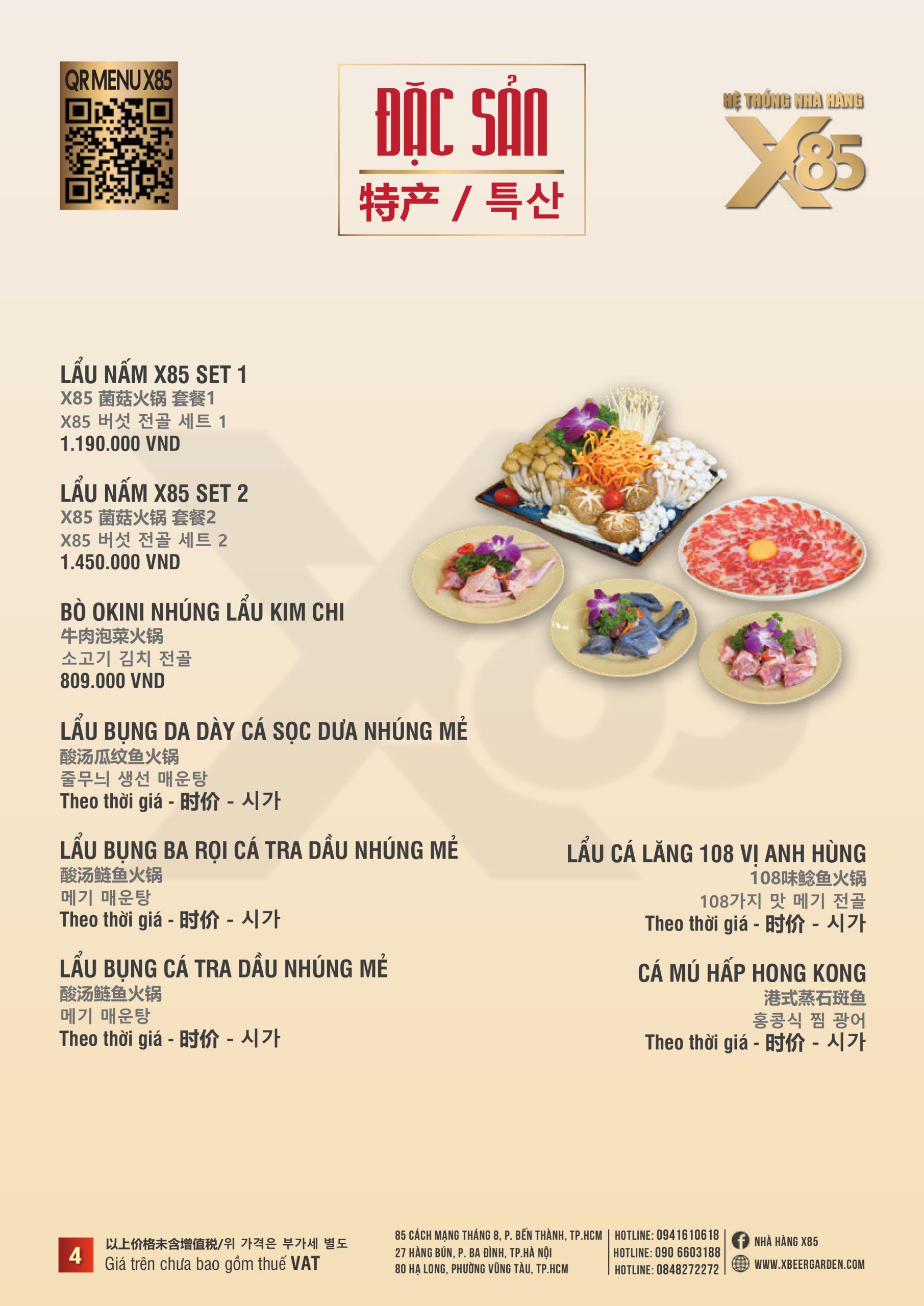 Thực đơn đa dạng và phong phú tại Nhà hàng X85 Hồ Chí Minh giúp khách hàng tận hưởng ẩm thực không giới hạn, từ các món khai vị hấp dẫn đến các món chính đặc sắc với hương vị riêng biệt và cả những món tráng miệng ngọt ngào.