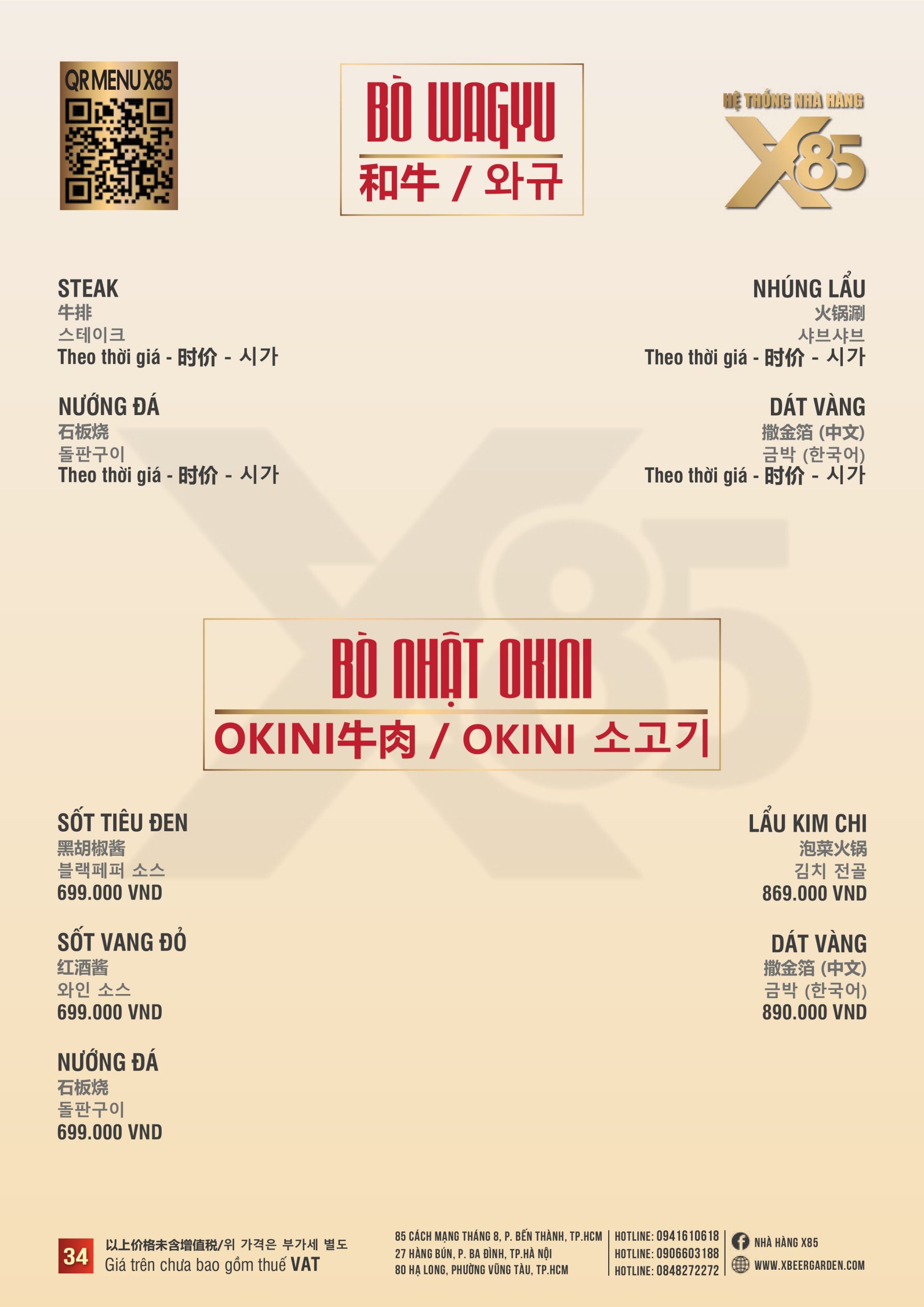Đặc biệt, bạn có thể thưởng thức bò Okini dát vàng tại đây. Thịt bò thượng hạng được cắt trực tiếp tại bàn bởi đầu bếp X85, từng lát thịt mềm mịn, giữ trọn hương vị tươi ngon. Lớp vàng 24K óng ánh phủ đều, tôn lên sự sang trọng và đẳng cấp. Thực khách sẽ tự tay rắc muối theo phong cách Salt Bae, tạo dấu ấn cá nhân cho chính phần steak của mình.