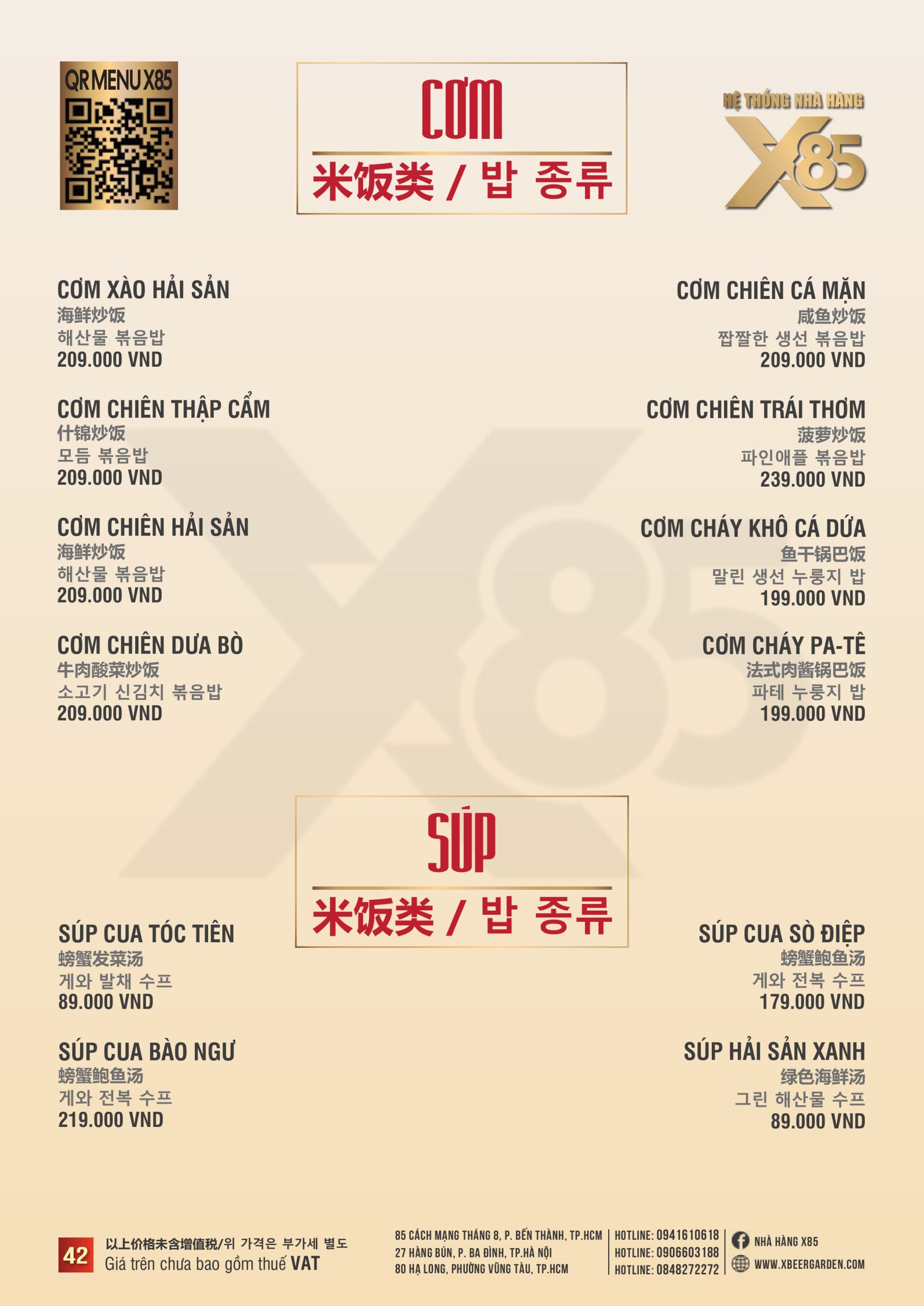 Với vị trí mặt tiền đường thuận tiện, dịch vụ chu đáo và không khí vừa lịch sự vừa “chill”, Nhà hàng X85 Hồ Chí Minh là lựa chọn lý tưởng cho các buổi họp nhóm, tiệc công ty, tiếp khách và những dịp đặc biệt. Đừng quên gọi ngay 0913515351 để được tư vấn miễn phí và đặt bàn nhanh chóng nhé!