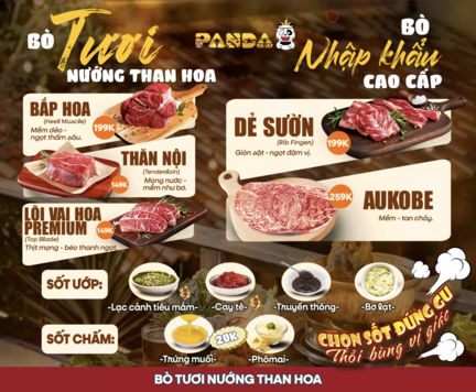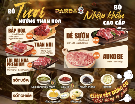 • Món nổi bật: Bò Mỹ nướng, Ba chỉ bò nướng, Ba chỉ heo hướng, Hải sản nướng, Gà nướng cay, Gà nướng BBQ, Sườn nướng Panda, Lẩu kim chi, Lẩu nấm, Lẩu chua cay…