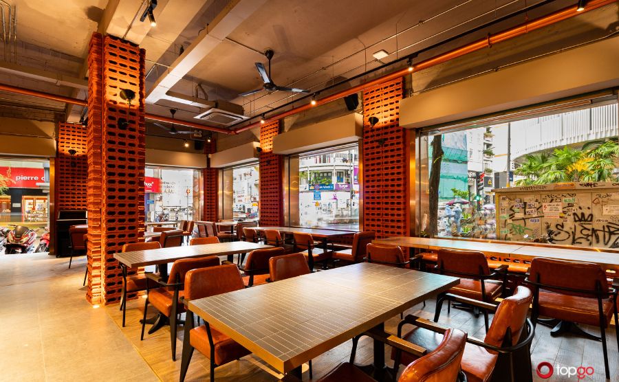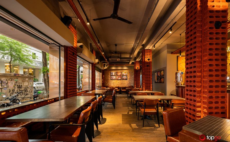 Không gian mang đậm phong cách industrial hiện đại, kết hợp giữa sự ấm áp và mạnh mẽ. Những cột gạch đỏ trần thô tạo nên điểm nhấn thị giác mạnh, vừa mộc mạc vừa gần gũi, gợi cảm giác hoài cổ. Trần nhà cao với hệ thống ống dẫn và quạt trần lộ thiên tạo nét phóng khoáng, mở rộng không gian.
