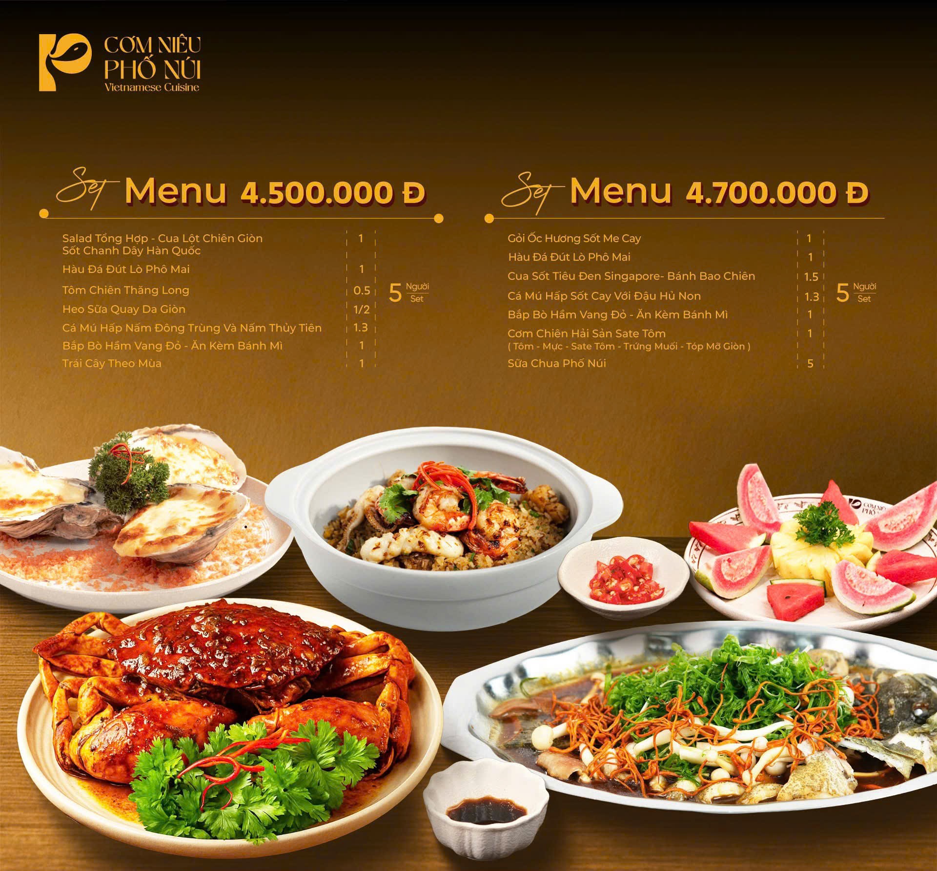 Dù ở mức giá nào, mỗi set đều được thiết kế theo concept “bữa tiệc Việt trọn vị”, bao gồm đầy đủ khai vị – món chính – hải sản – món nóng – tráng miệng, đảm bảo bữa tiệc chỉn chu từ đầu đến cuối.