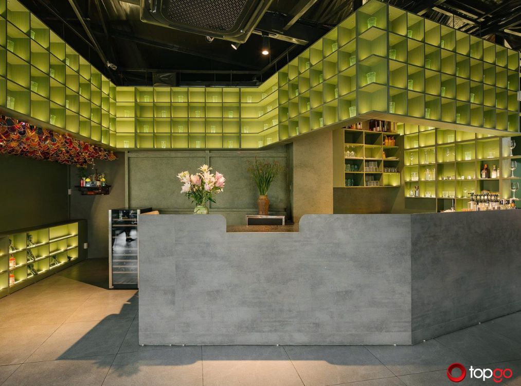 Điểm nhấn của nhà hàng là cách bố trí tinh tế: góc bàn, kệ ly, hay ánh đèn đều được đặt khéo léo để tạo nên sự hài hòa.