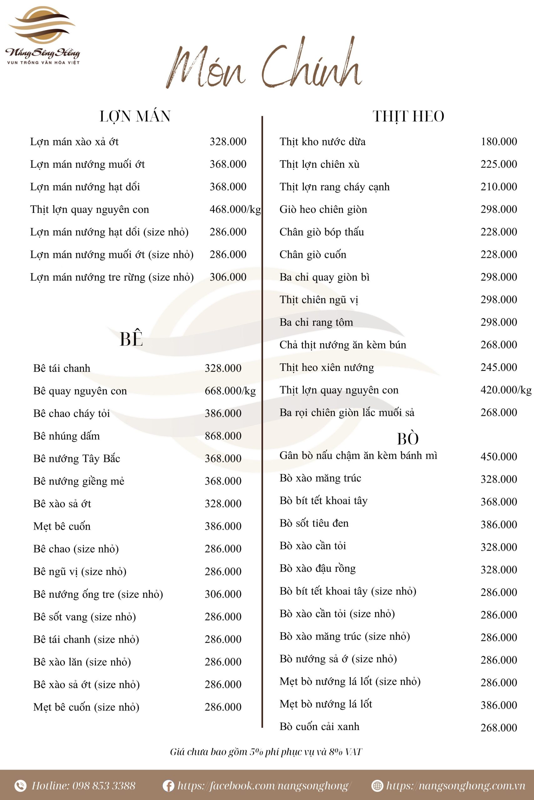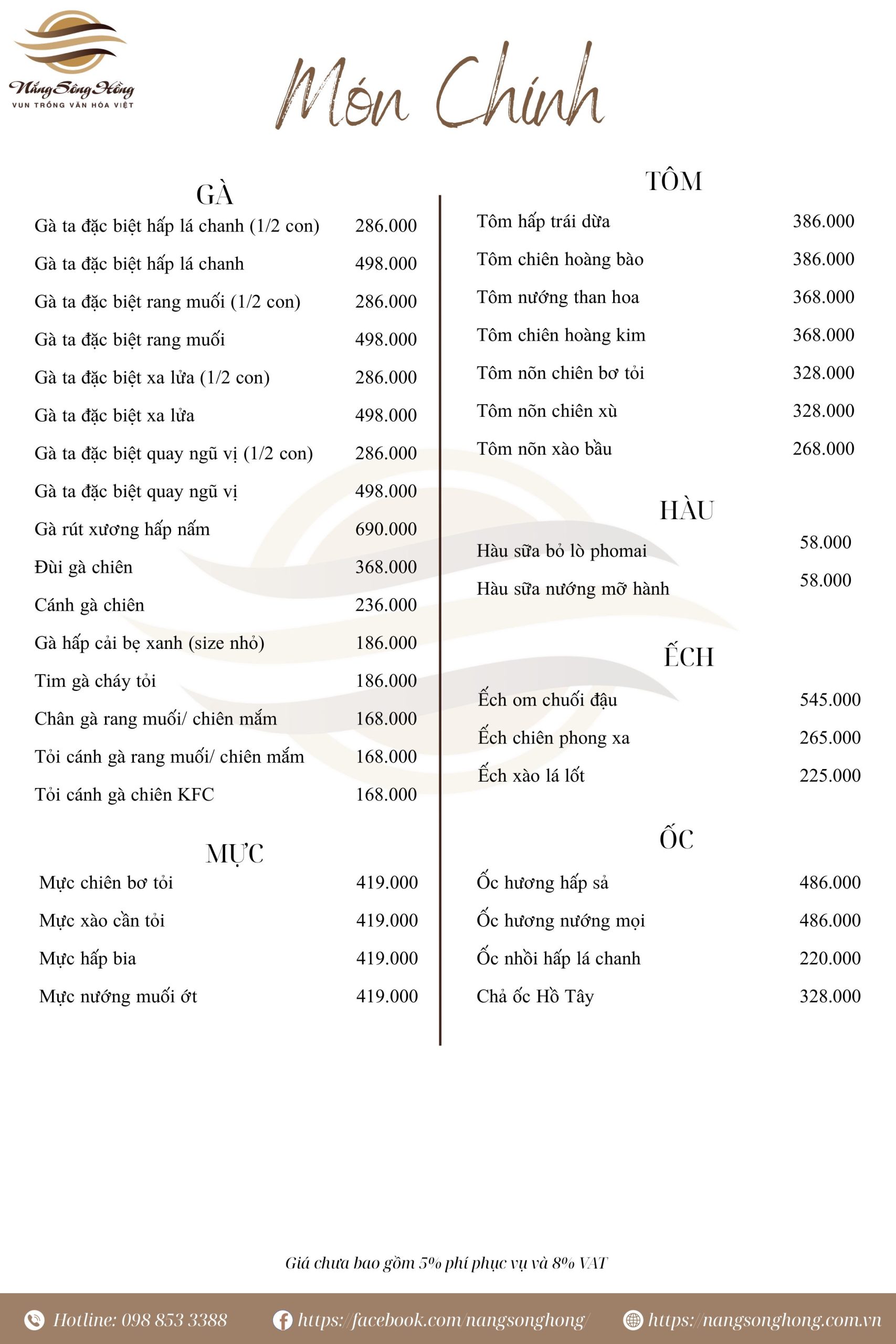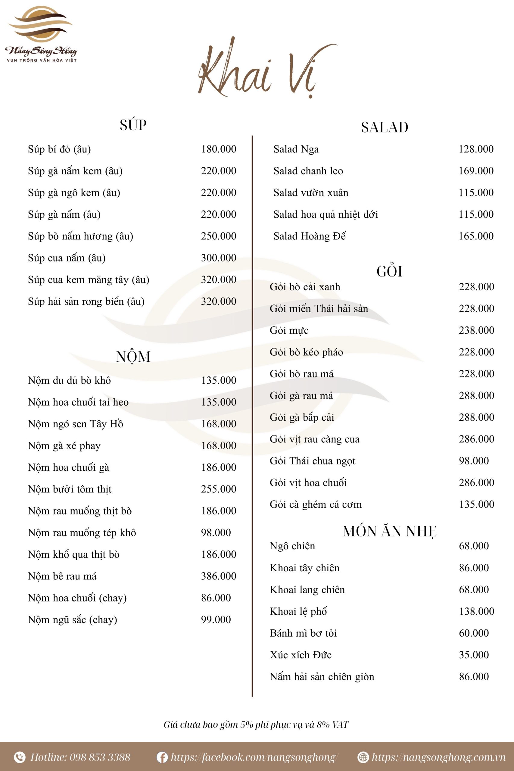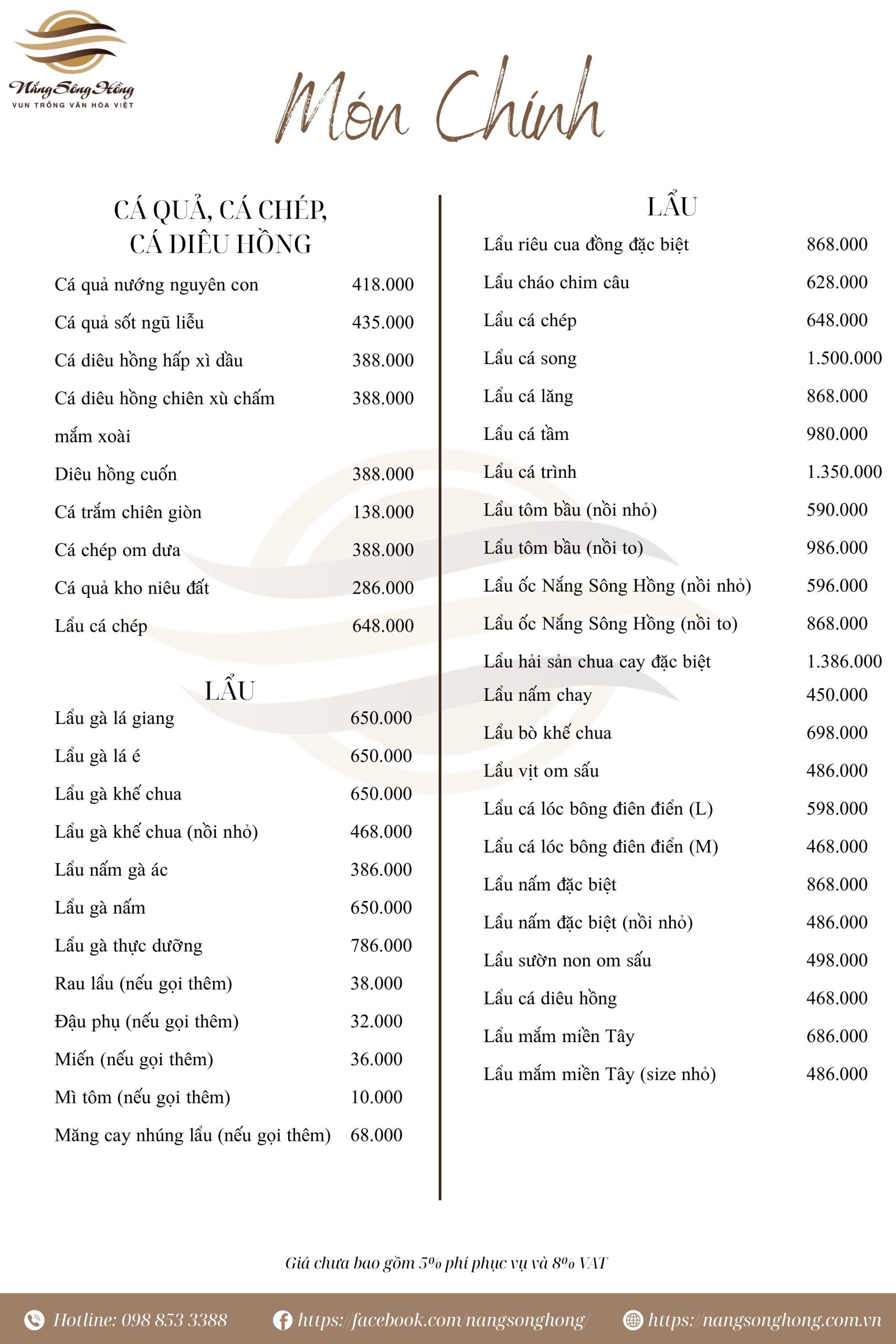 Thực đơn của Làng Văn Hóa Ẩm Thực Nắng Sông Hồng là sự kết hợp tinh tế giữa truyền thống và sáng tạo. Những món ăn gợi nhớ hương vị quê nhà, được nâng tầm bằng cách trình bày đẹp mắt, kỹ thuật nấu nướng hiện đại nhưng vẫn giữ trọn hồn xưa.