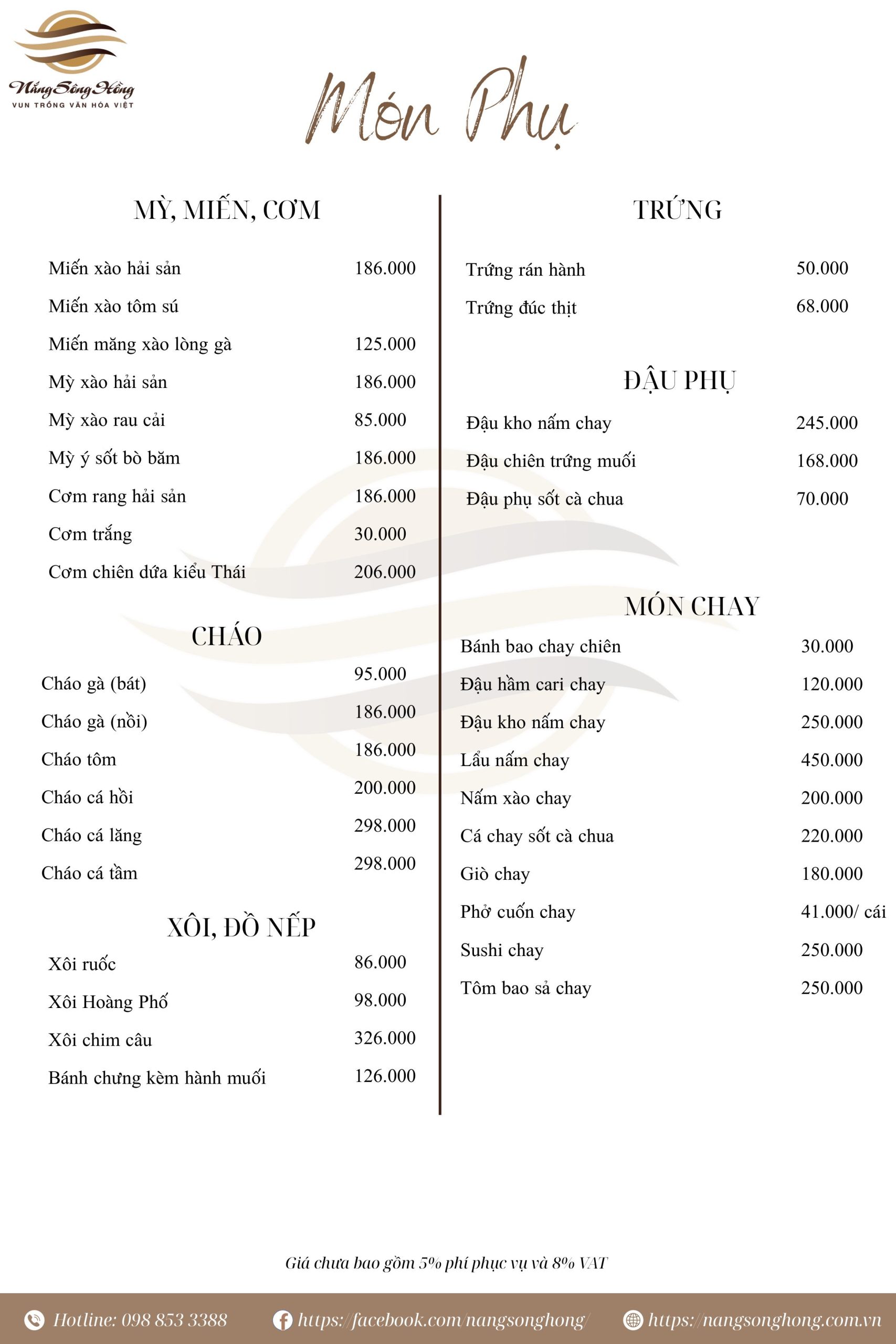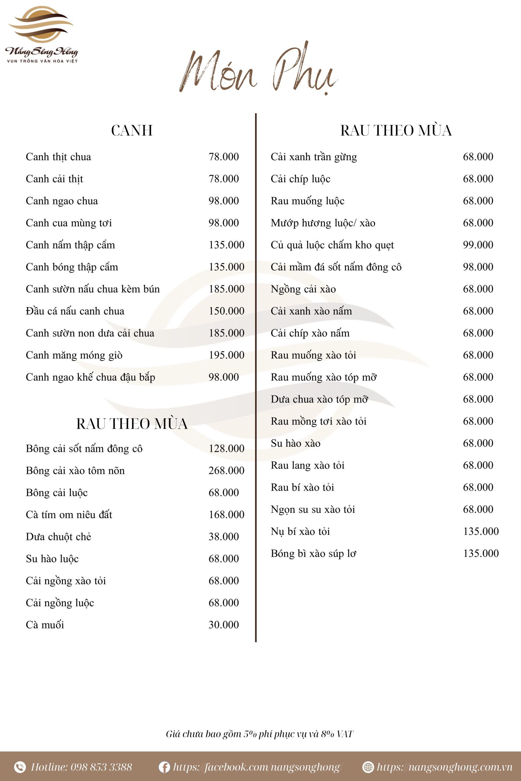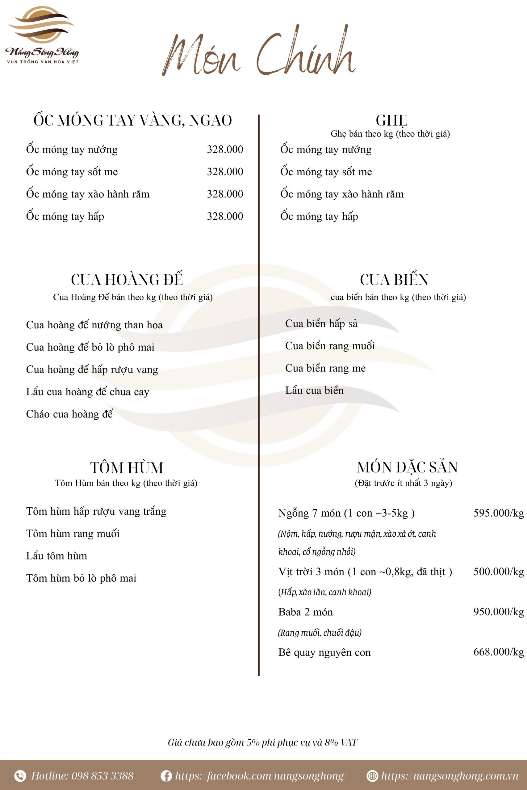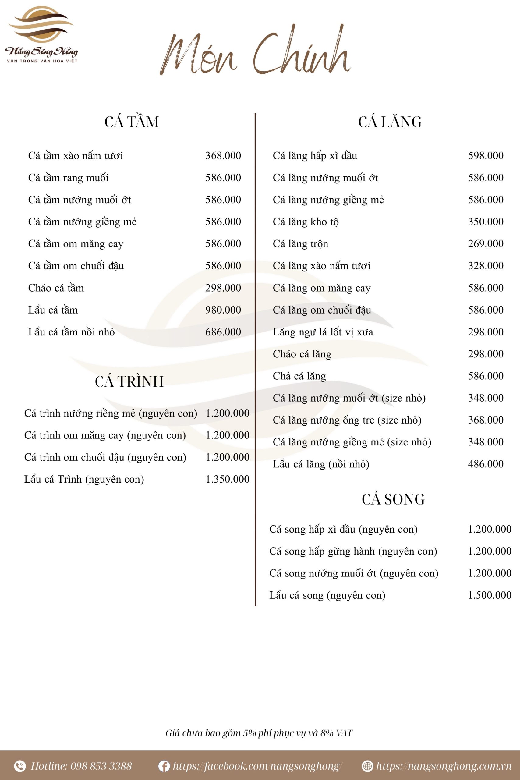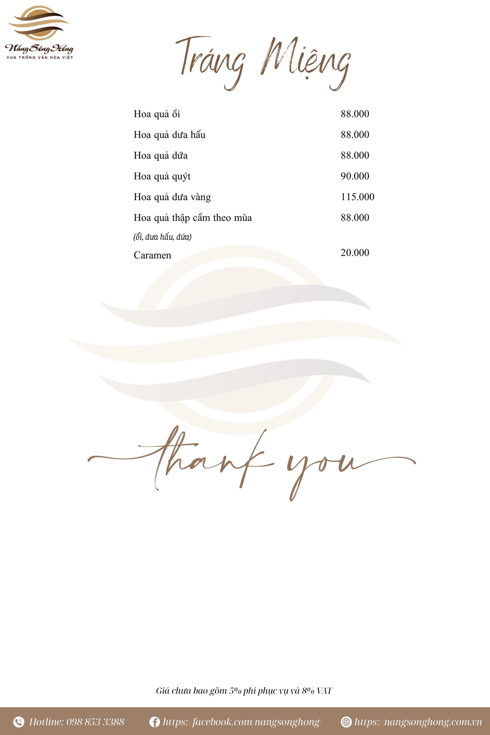 Thực đơn của Làng Văn Hóa Ẩm Thực Nắng Sông Hồng là sự kết hợp tinh tế giữa truyền thống và sáng tạo. Những món ăn gợi nhớ hương vị quê nhà, được nâng tầm bằng cách trình bày đẹp mắt, kỹ thuật nấu nướng hiện đại nhưng vẫn giữ trọn hồn xưa.