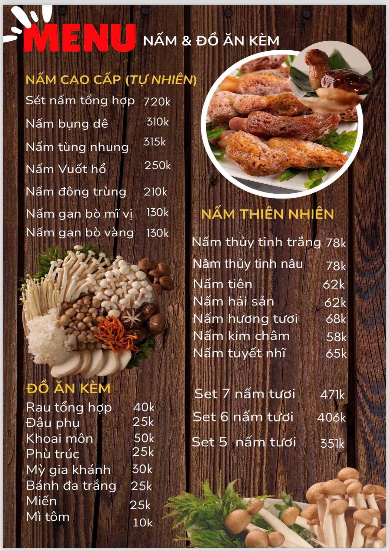 - Món nổi bật: Lẩu nấm bổ dưỡng với hơn 20 loại nấm quý; Súp nấm hải sản; Salad nấm; Nem nấm chiên; Bò Mỹ nhúng lẩu; Cá tươi nhúng lẩu; Rau củ tươi; Các set lẩu theo nhóm; Các món nướng kèm nấm; Đồ nướng H’Mông & thịt bò ba chỉ