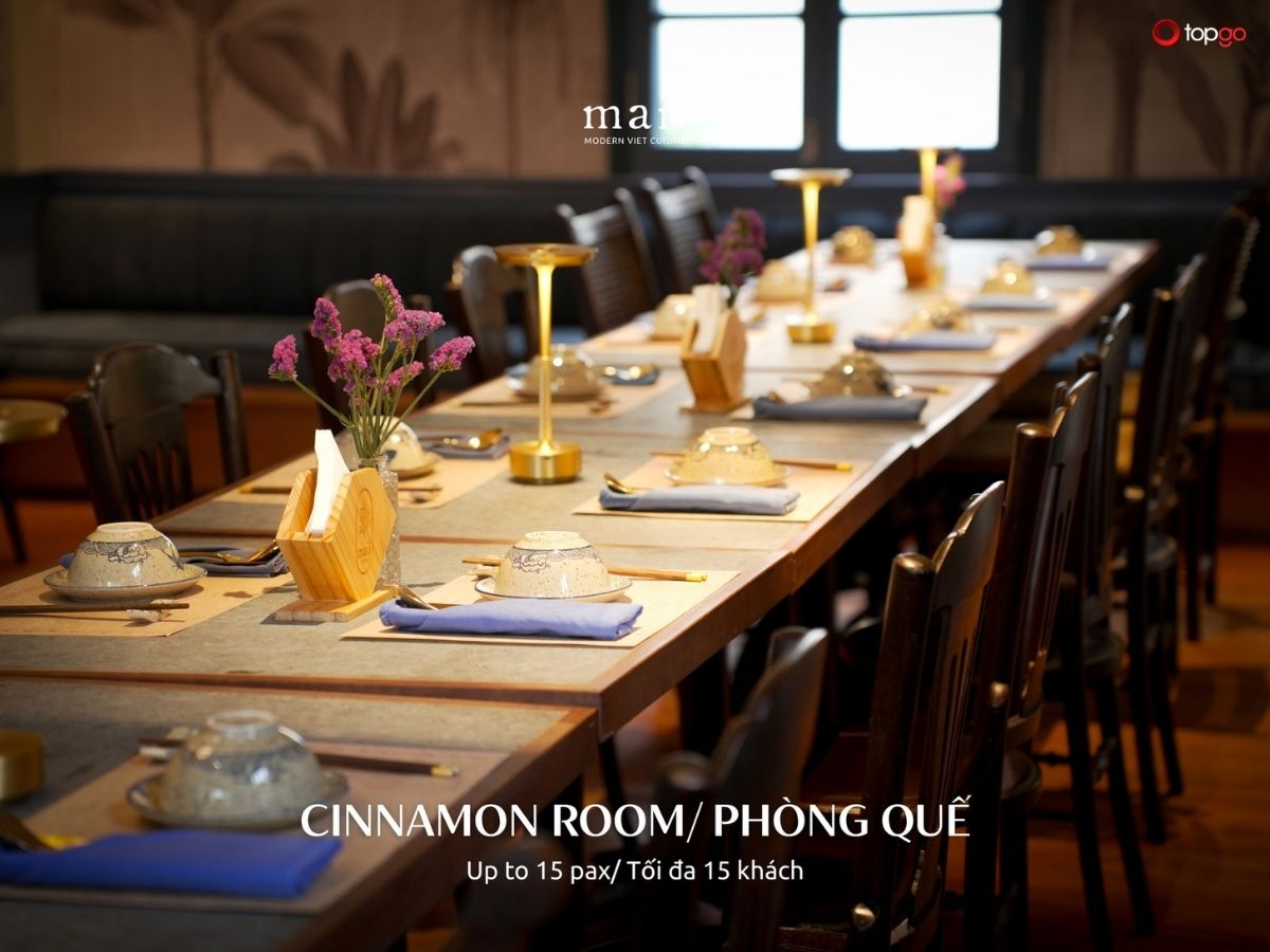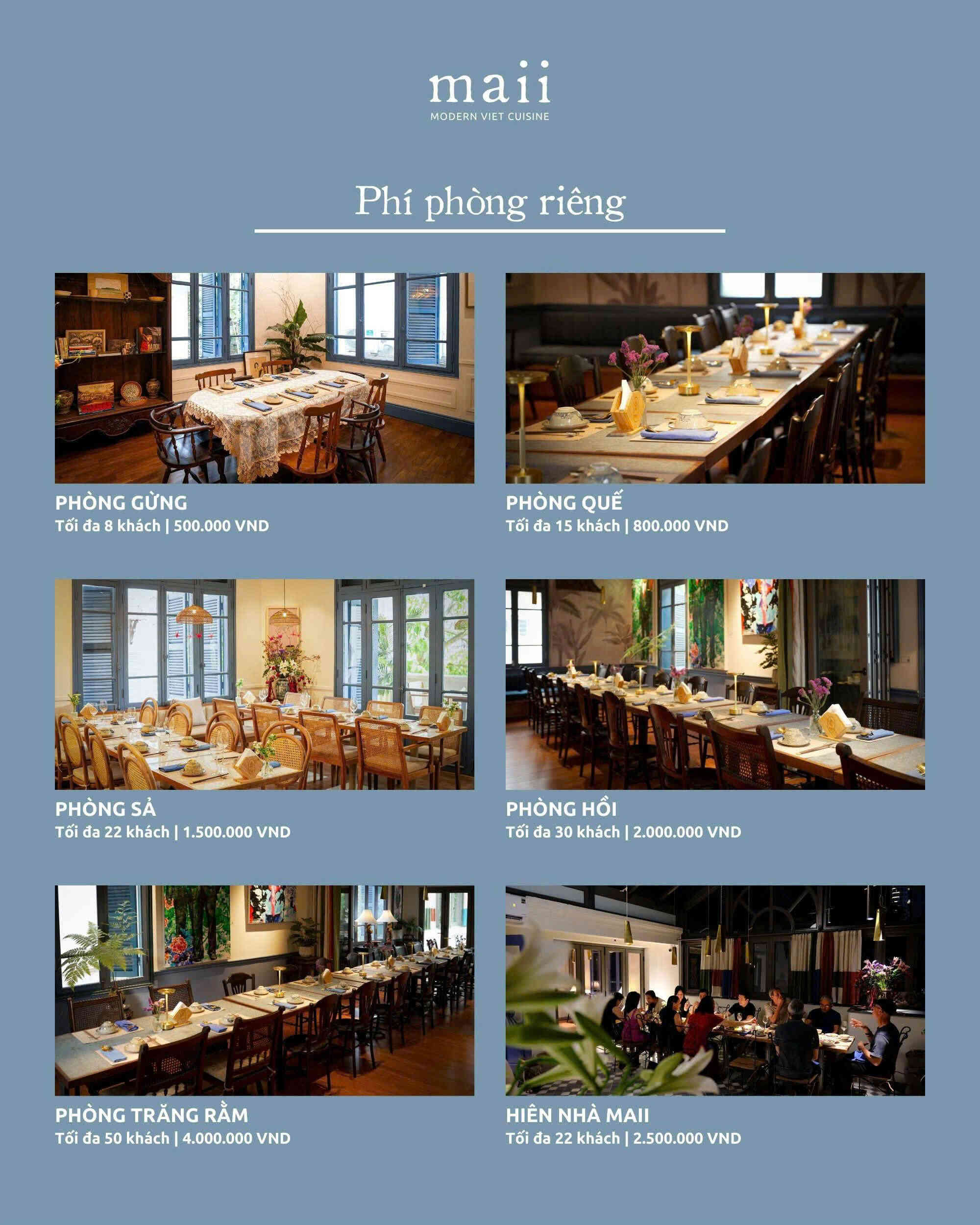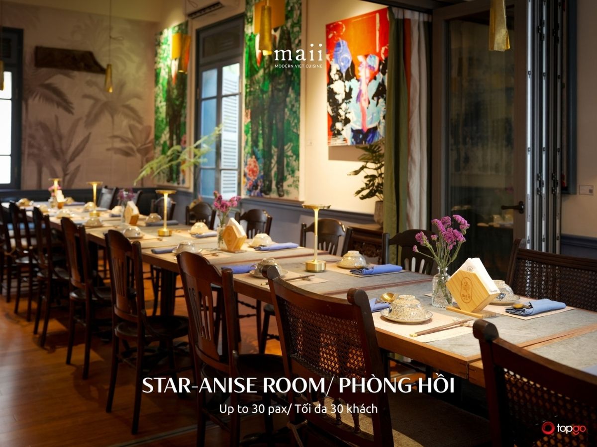 Một trong những điểm mạnh nổi bật của Maii Bistro là hệ thống phòng riêng đa dạng. Mỗi phòng mang tên một loại gia vị, gợi sự gần gũi nhưng vẫn tinh tế. Thiết kế đồng bộ, chỉn chu về ánh sáng, âm thanh và khoảng cách bàn ghế. Đây là lựa chọn lý tưởng cho khách cần không gian riêng tư tuyệt đối.