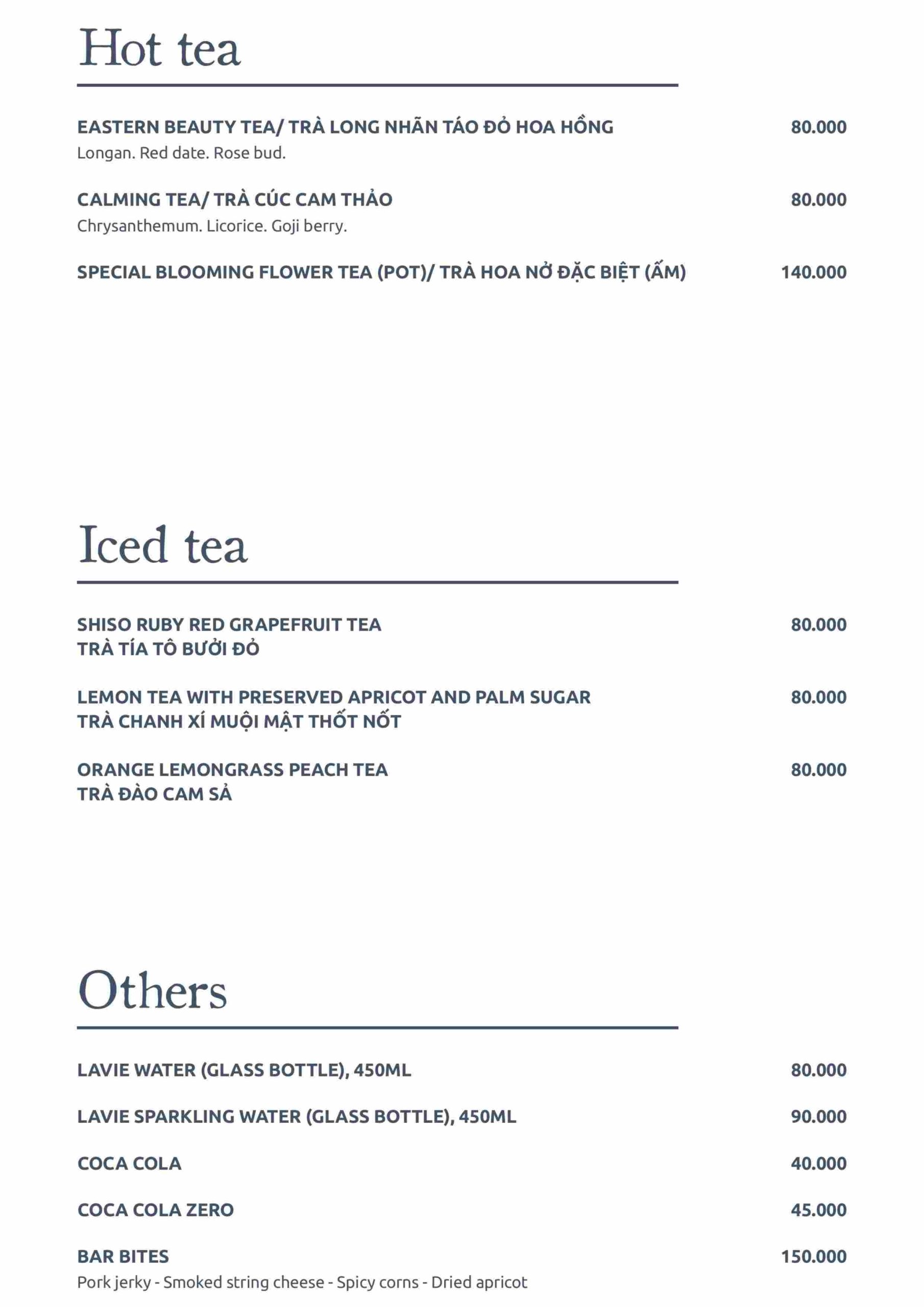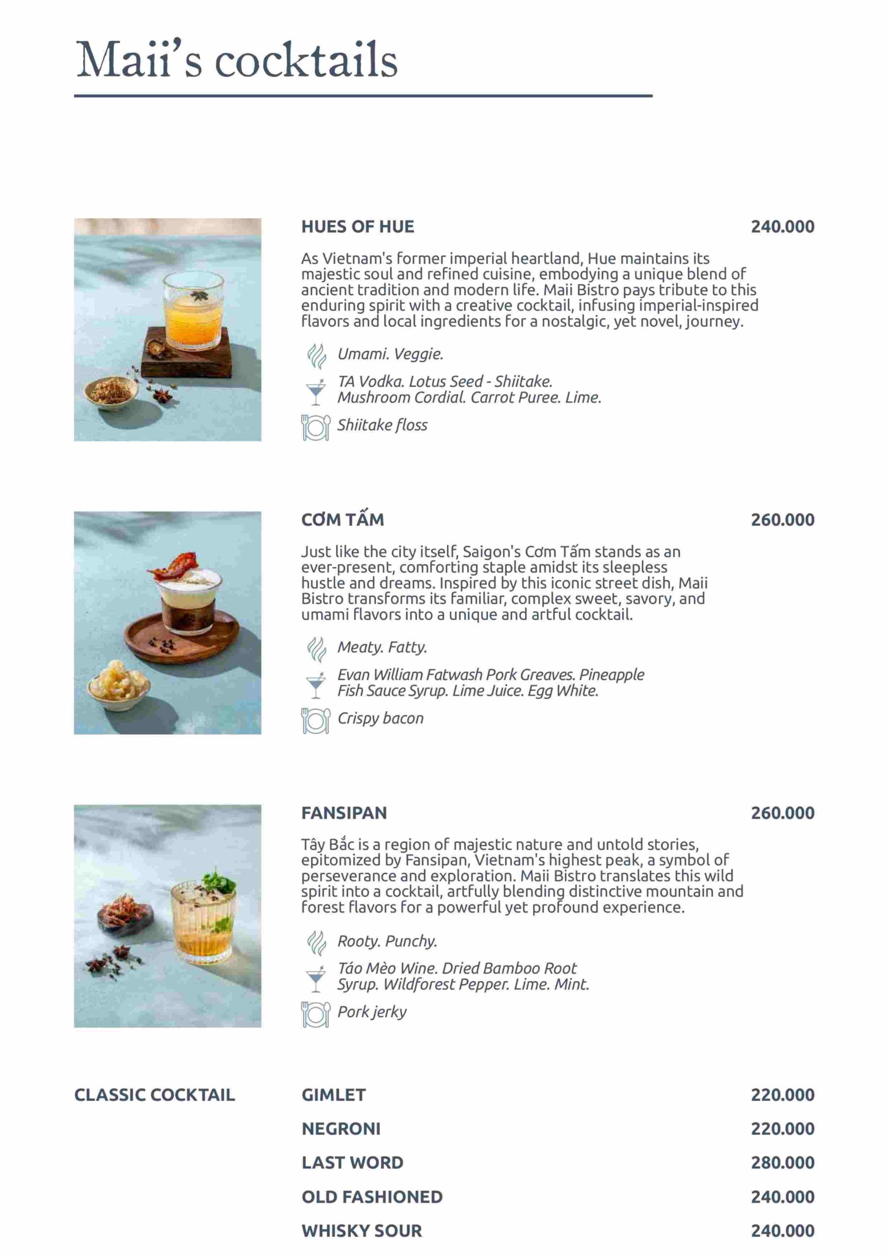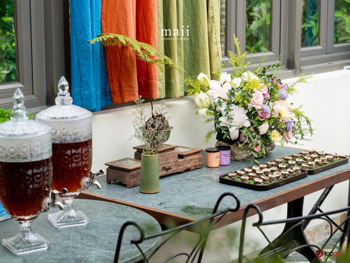 Maii Bistro gây ấn tượng với các dòng cocktail sáng tạo lấy cảm hứng từ văn hóa Việt, kết hợp trái cây, thảo mộc và trà theo phong cách hiện đại. Bên cạnh đó là kombucha, junbucha thanh mát cùng trà nóng – trà lạnh tinh tế, giúp cân bằng vị giác và mang lại trải nghiệm nhẹ nhàng, dễ chịu cho mọi bữa ăn.