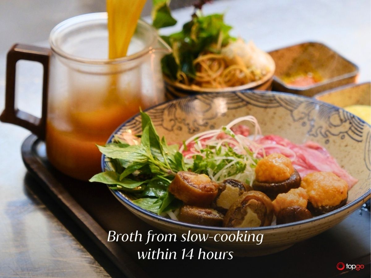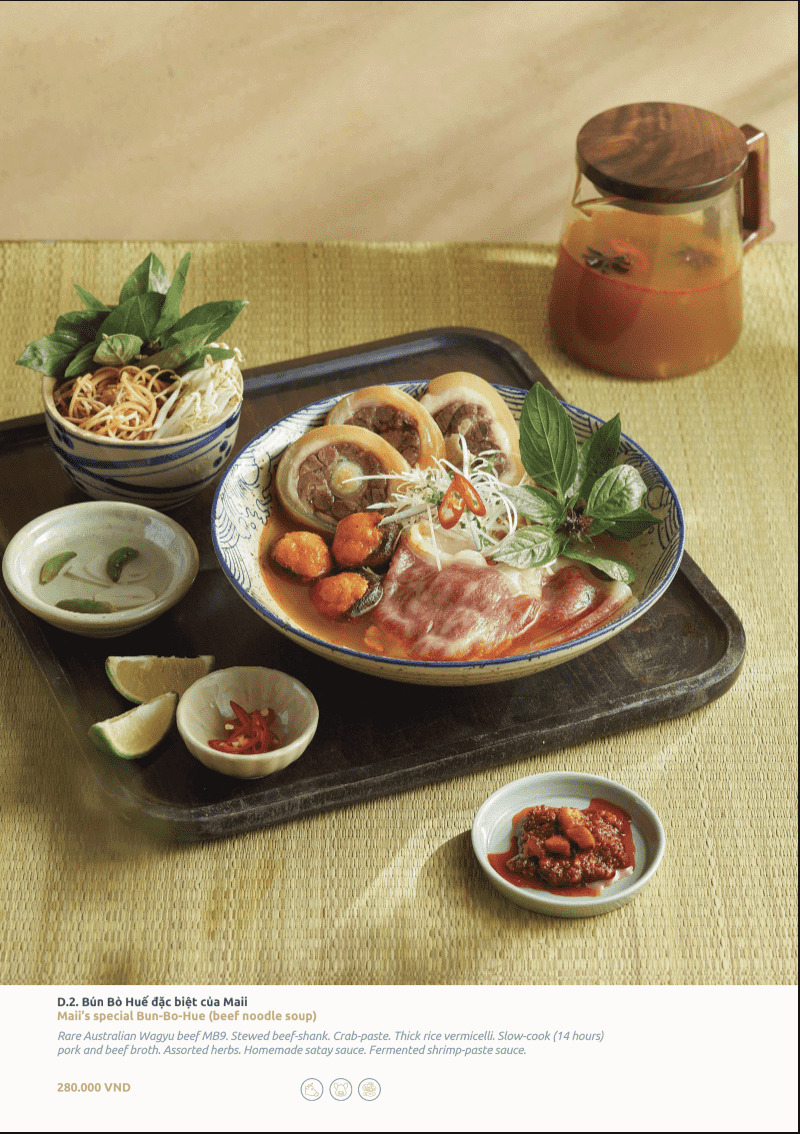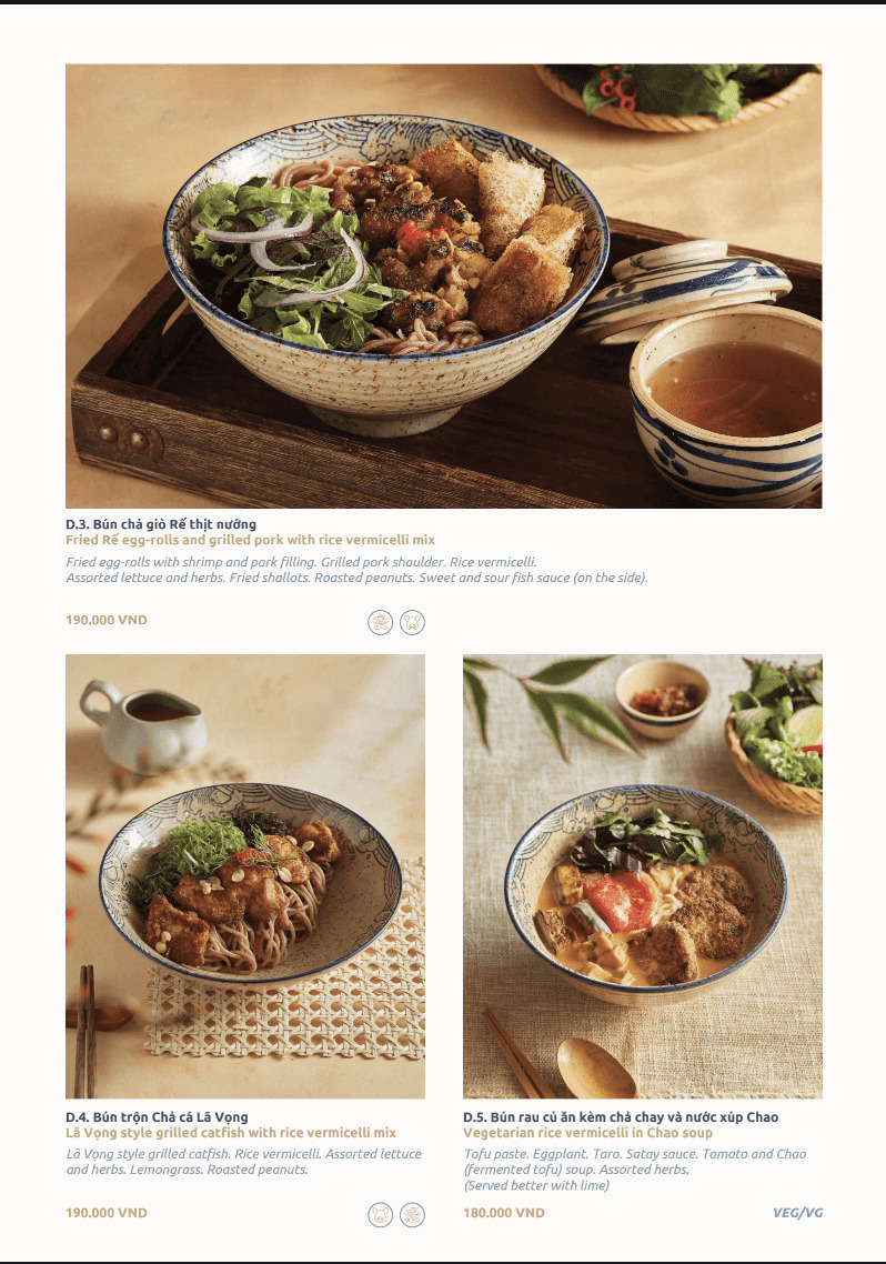 Thực đơn êm dạ được xây dựng xoay quanh các món bún quen thuộc của ẩm thực Việt. Từ bún bò Huế đậm đà nhưng cân bằng, bún trộn chả cá Lã Vọng thơm thảo mộc, đến bún rau củ thanh nhẹ hay bún chả giò hài hòa giữa giòn và mềm. Gia vị được tiết chế khéo léo, không gắt, không nặng mùi.