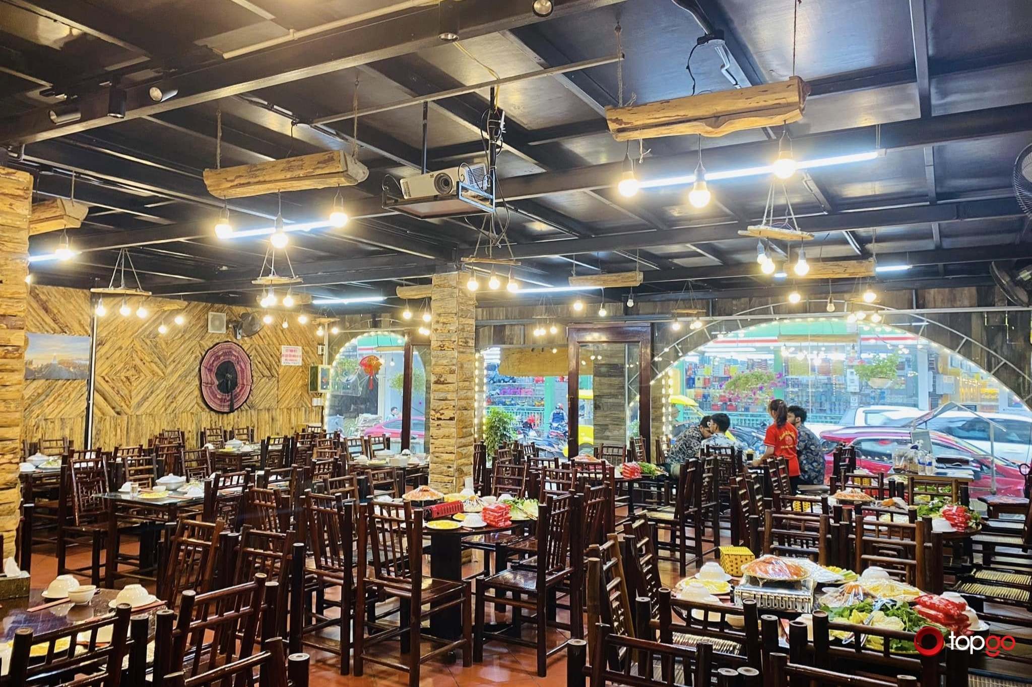 Thiết kế thoáng và rộng, không chia phòng riêng nhưng khoảng cách bàn hợp lý. Khách có thể cảm nhận trọn vẹn bầu không khí bản địa: hơi sương lạnh phả qua ô cửa, tiếng trò chuyện rộn ràng, tiếng bếp nấu vang nhẹ như nhịp sống vùng cao. Cảm giác đó tạo sự thoải mái, đúng tinh thần “ăn cùng người bản địa, thưởng thức như người bản địa”.