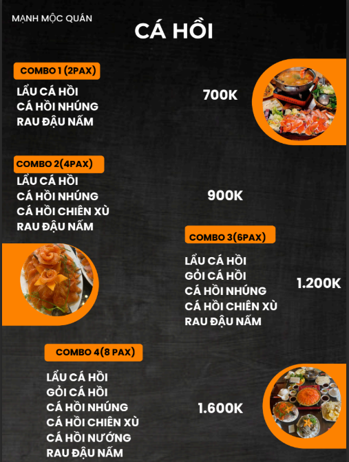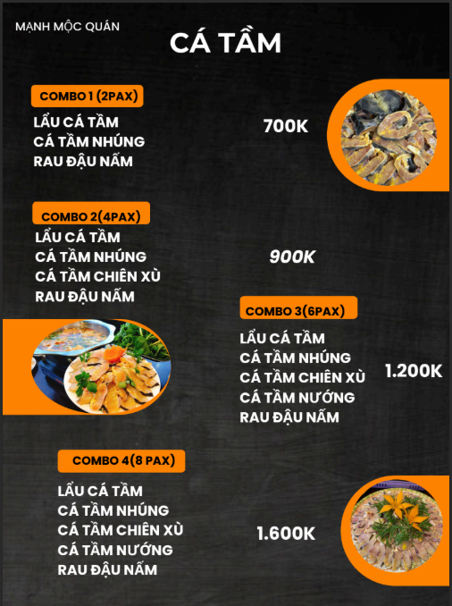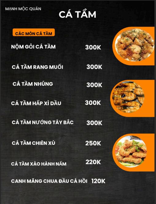 Ẩm thực tại Mạnh Mộc Quán dựa trên nền nguyên liệu bản địa. Rau rừng, thịt đồi, cá suối, cá hồi lạnh cùng các gia vị đặc trưng như mắc khén, thảo quả, hạt dổi, lá chua rừng, húng rừng… Từng thứ kết hợp tạo thành hương vị riêng của Tây Bắc: nồng, ấm và đậm hơi thở núi rừng. Trong cái lạnh của rừng núi, được ngồi quây quần bên gia đình, bạn bè, xì sụp nồi lẩu nghi ngút thì thật tuyệt với