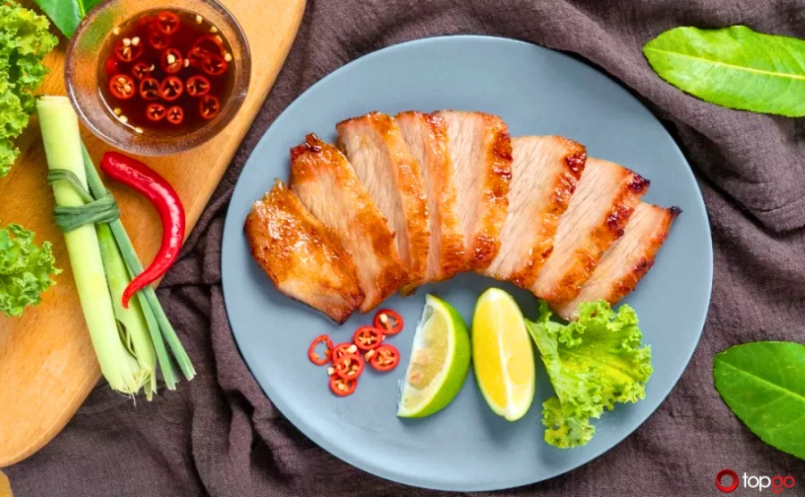 Nọng heo nướng của Nhà hàng Ẩm Thực Sông Hồng được tẩm ướp cầu kỳ với các loại gia vị truyền thống. Sau đó nướng trên than hồng. Miếng nọng heo khi chín có lớp da vàng giòn. Phần thịt bên trong mềm ngọt, tỏa hương thơm lừng.