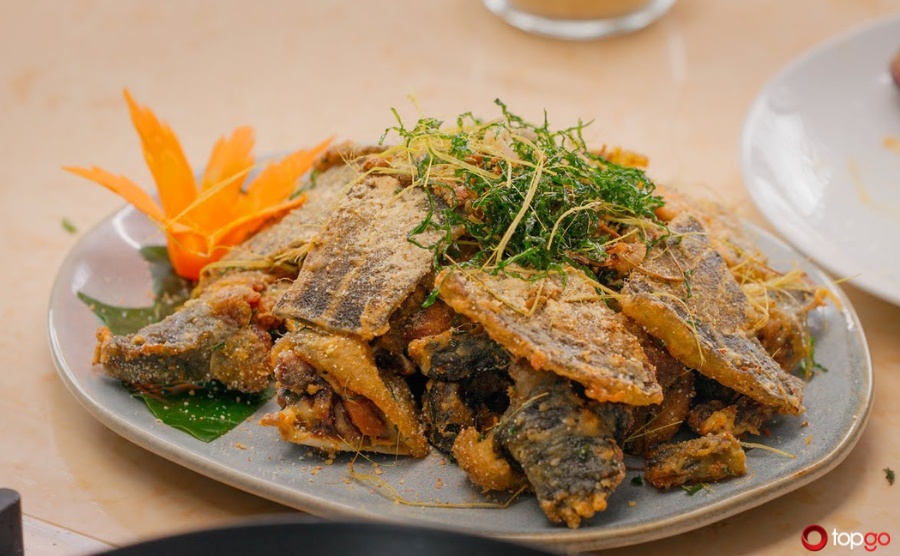 Một trong những món ăn đặc trưng của nhà hàng là baba rang muối. Thịt baba sau khi sơ chế được tẩm ướp gia vị kỹ lưỡng, chiên giòn và phủ đều muối rang. Khi thưởng thức, thực khách sẽ cảm nhận lớp vỏ ngoài giòn tan. Thịt bên trong mềm ngọt, vị mặn mặn đậm đà nhưng không hề gắt.