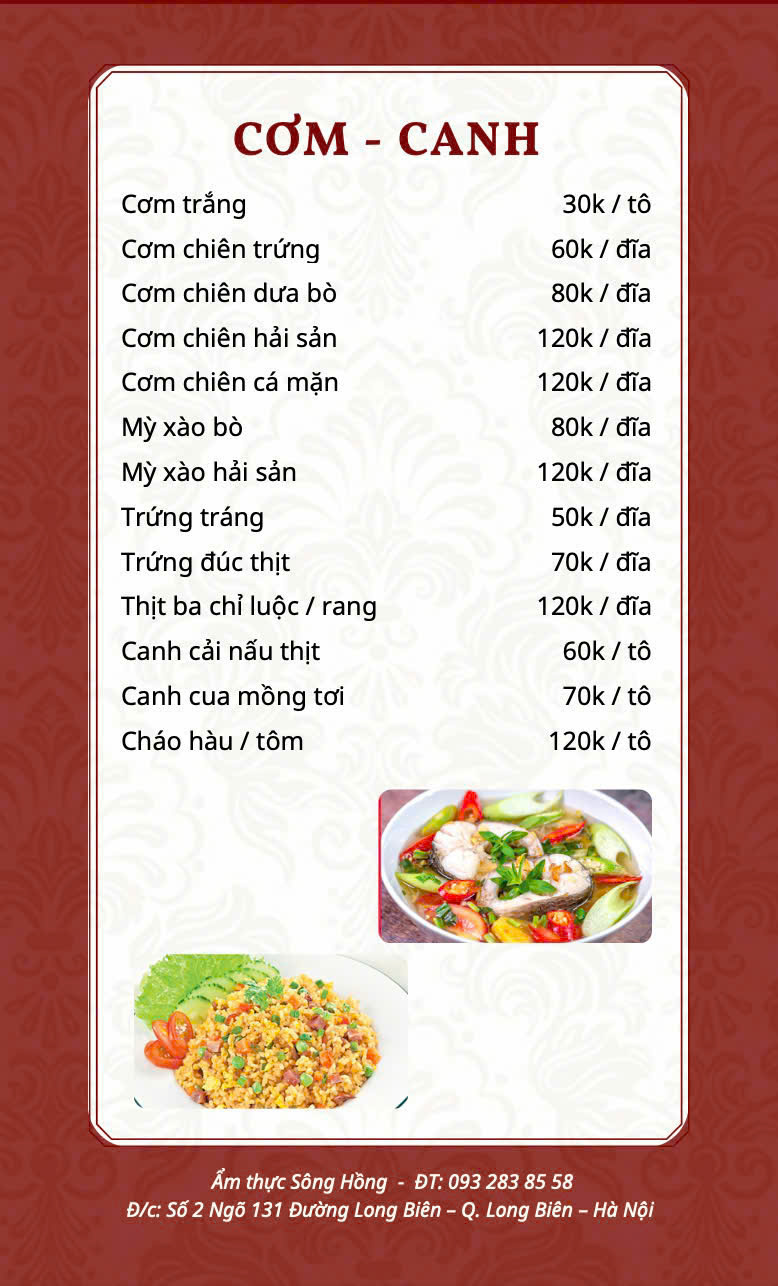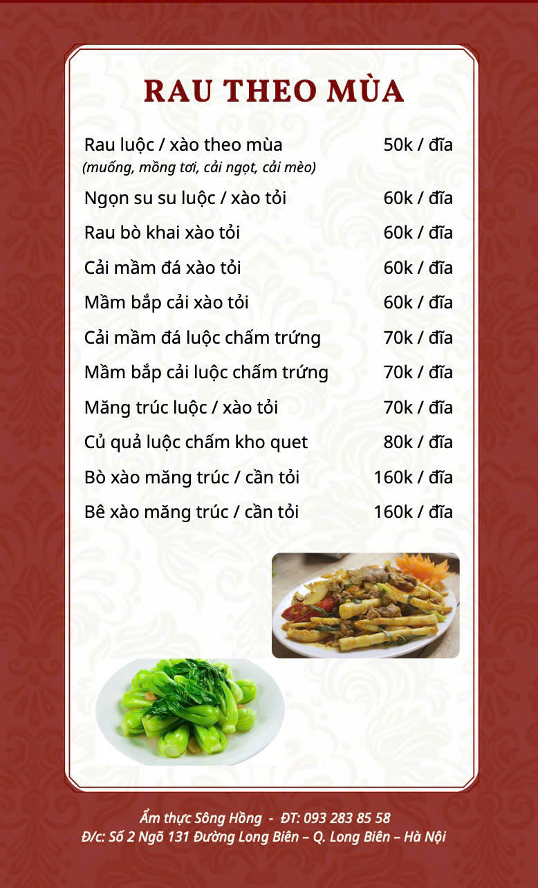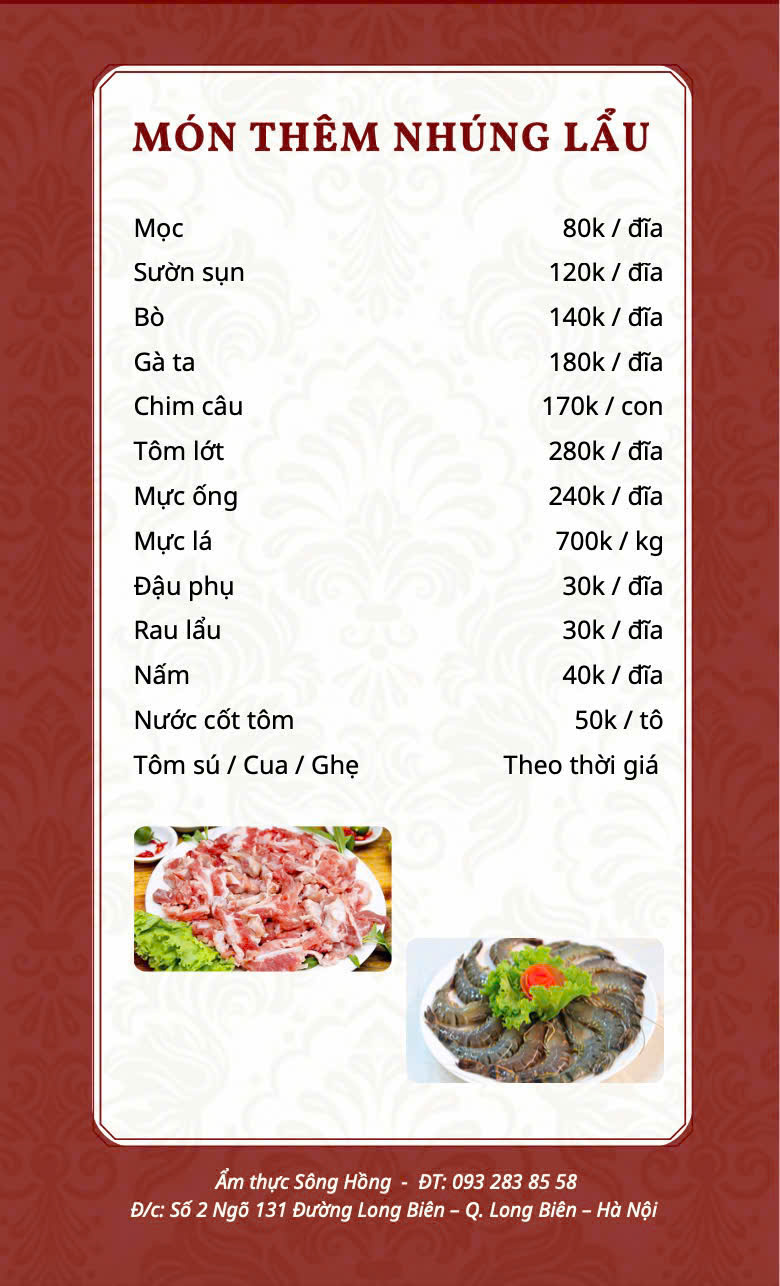 Nhà hàng Ẩm Thực Sông Hồng là địa chỉ quen thuộc của những ai yêu thích không gian ven sông và những món ăn đậm chất đồng quê. Với vị trí đắc địa ngay bên bờ sông Hồng, nhà hàng mang lại cho thực khách trải nghiệm vừa gần gũi, vừa sang trọng. Tại đây, mỗi bữa ăn không chỉ là hành trình thưởng thức ẩm thực mà còn là khoảnh khắc thư giãn, kết nối và tận hưởng vẻ đẹp của thiên nhiên Hà Nội.