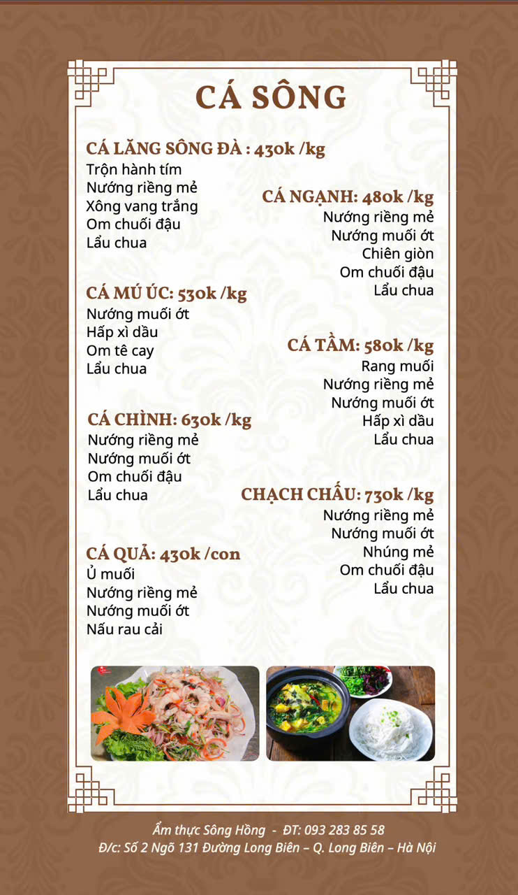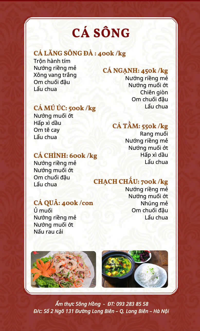 Ẩm thực chính là linh hồn của Nhà hàng Ẩm Thực Sông Hồng. Thực đơn ở đây phong phú, đa dạng, trong đó nổi bật là những món ăn chế biến từ cá sông và đặc sản đồng quê. Mỗi món đều được chế biến công phu, vừa giữ hương vị truyền thống, vừa có sự sáng tạo để phù hợp với khẩu vị hiện đại.
