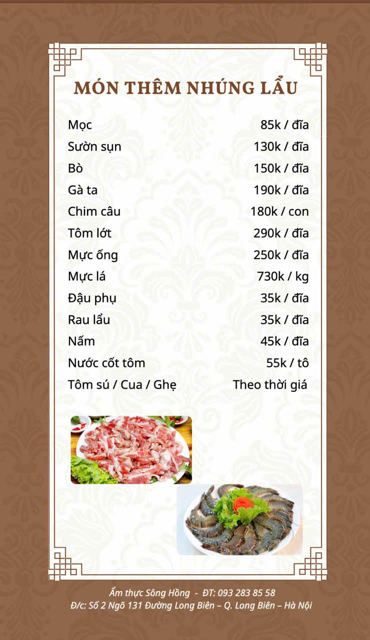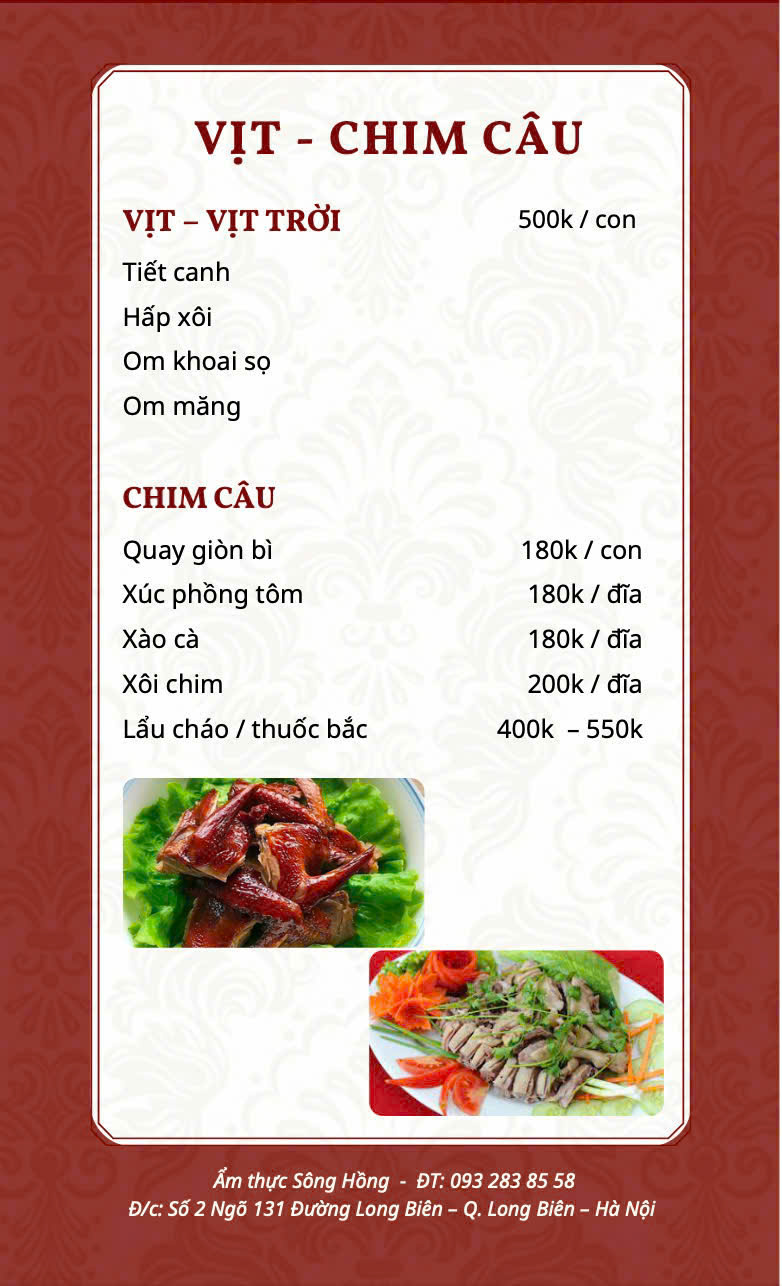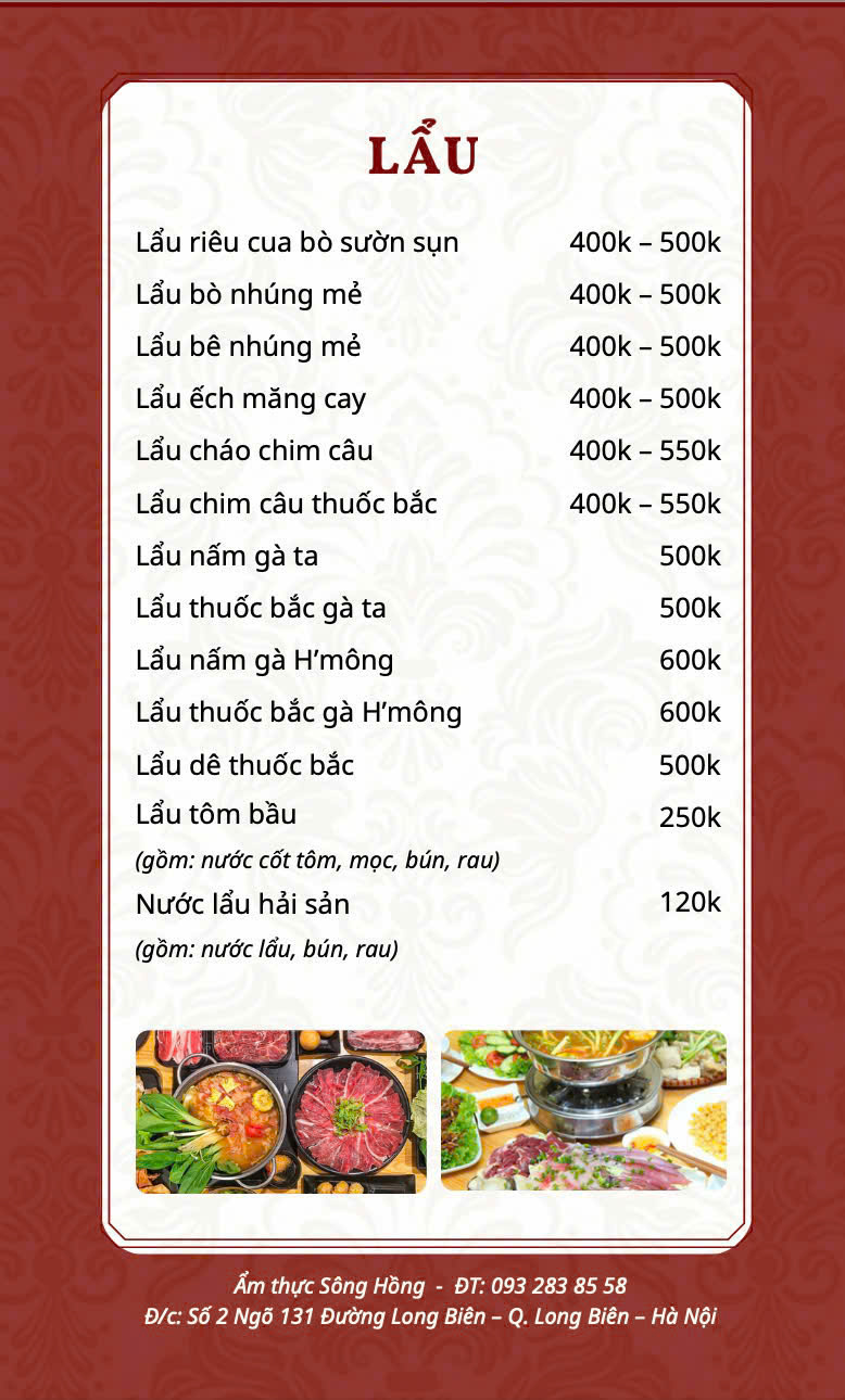 Lẩu cháo chim câu tại Nhà hàng Ẩm Thực Sông Hồng được nhiều thực khách yêu thích bởi sự bổ dưỡng và hương vị thơm ngon. Cháo được nấu nhuyễn, dẻo mịn. Kết hợp với thịt chim câu mềm ngọt. Khi ăn, thực khách có thể thêm rau xanh, nấm, hoặc gọi kèm các loại topping khác để tăng hương vị.