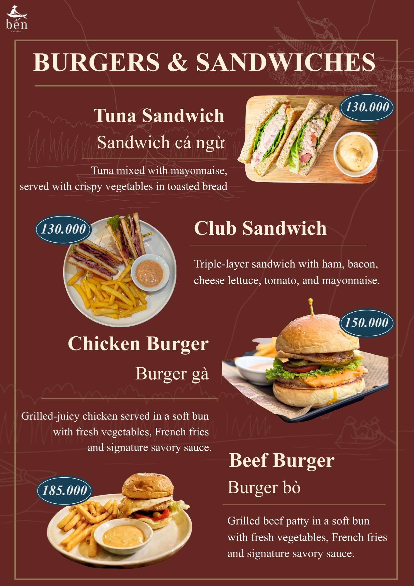 Hamburger cũng là món ăn được nhiều gia đình lựa chọn, đặc biệt khi đi cùng trẻ nhỏ. Món ăn dễ ăn, hương vị hài hòa, phù hợp nhiều độ tuổi. Sự đa dạng trong thực đơn giúp Nhà hàng Bến Cuisine trở thành điểm đến thuận tiện, nơi mỗi thành viên trong đoàn đều có thể tìm được món phù hợp.
