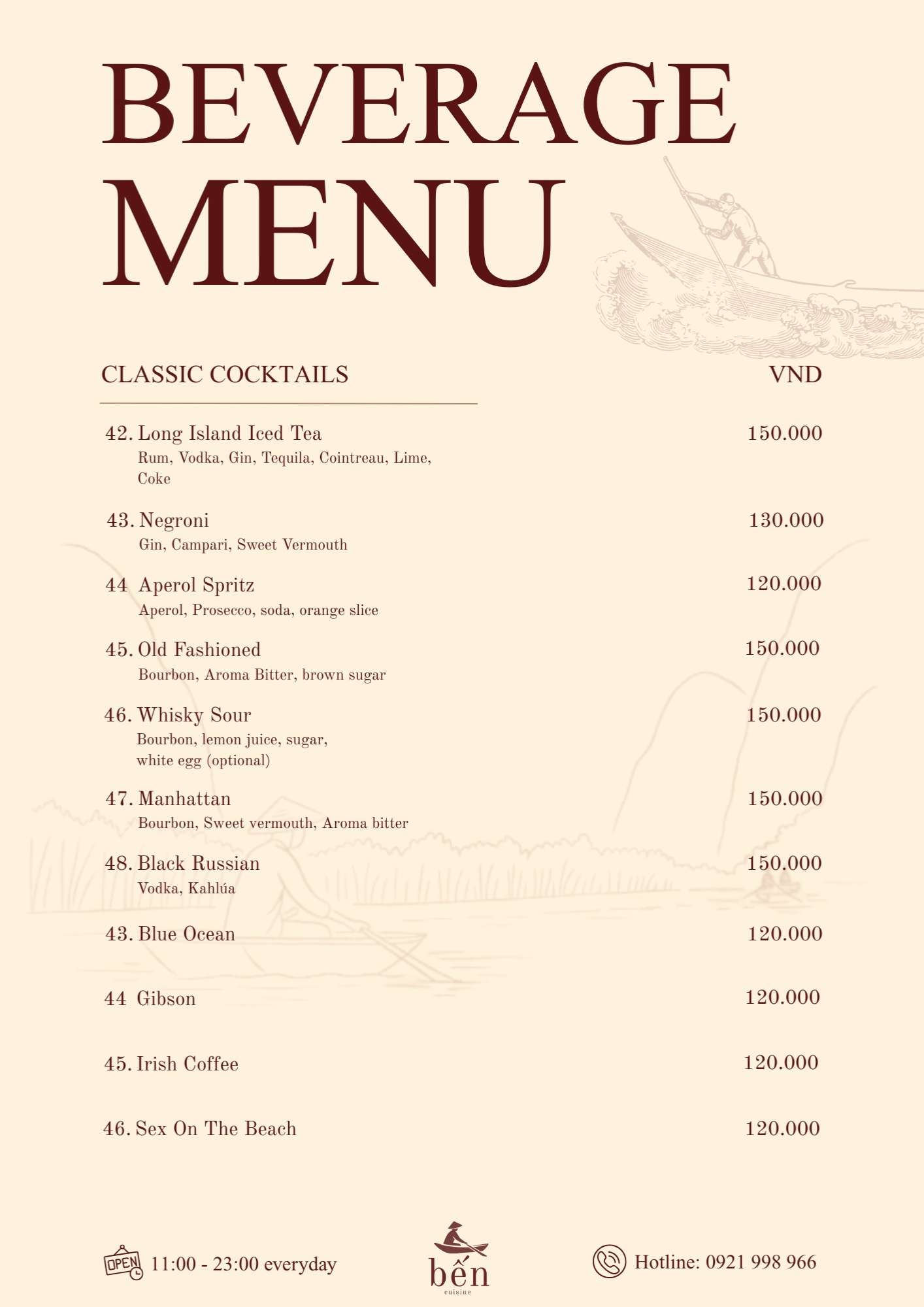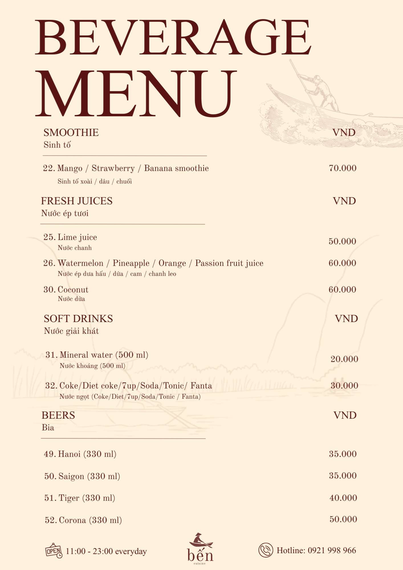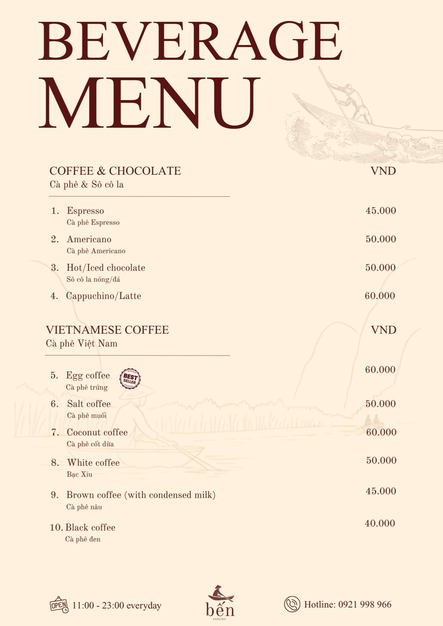 Danh sách thức uống tại Nhà hàng Bến Cuisine khá phong phú, từ các loại cà phê đến đồ uống trái cây mát lành. Cà phê trứng là lựa chọn được nhiều thực khách yêu thích, đặc biệt vào buổi sáng hoặc sau bữa ăn.