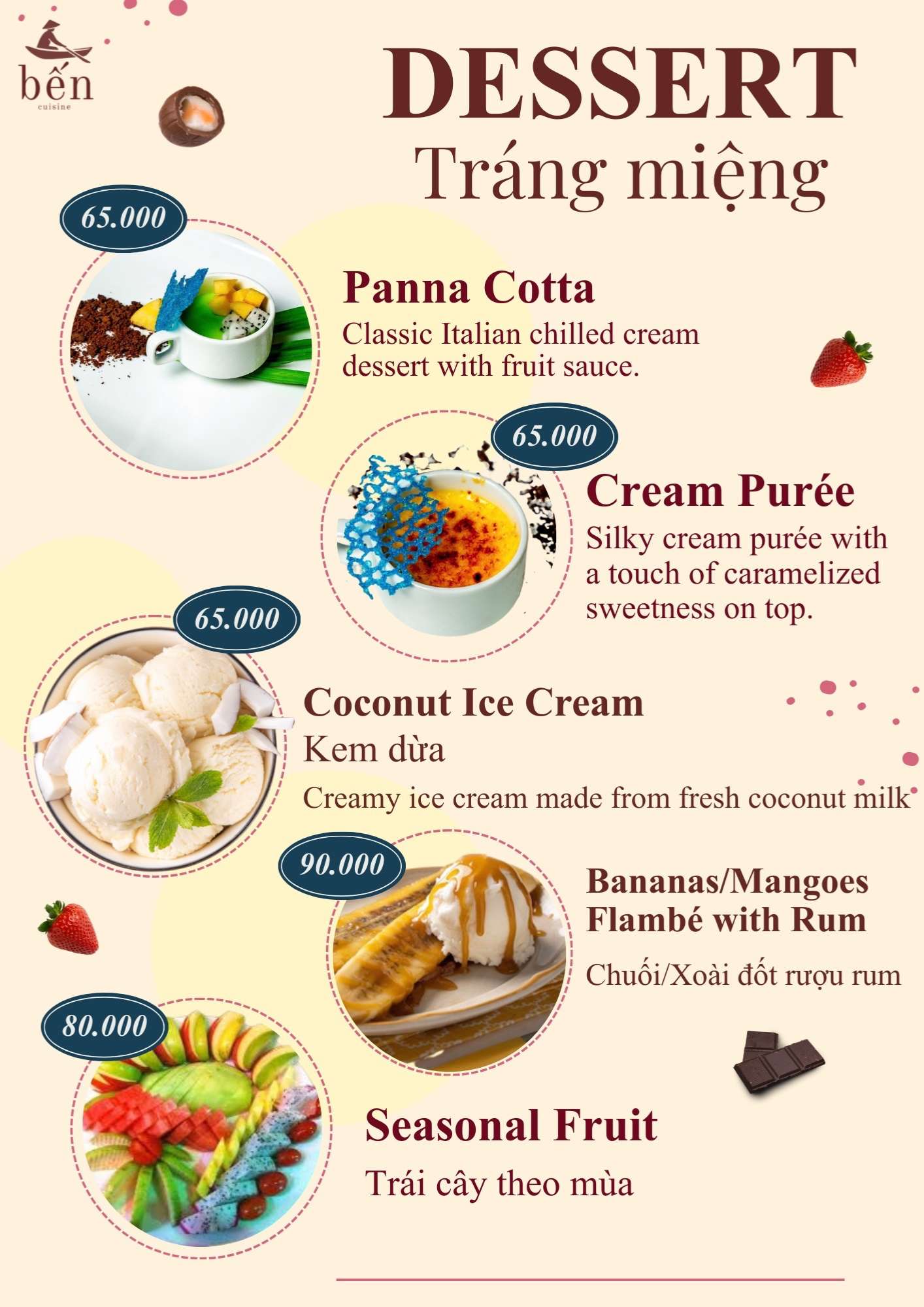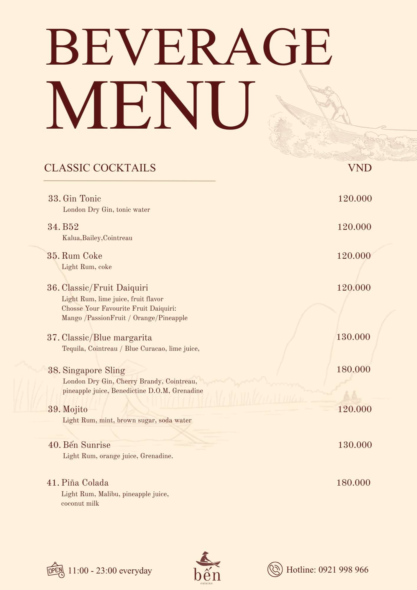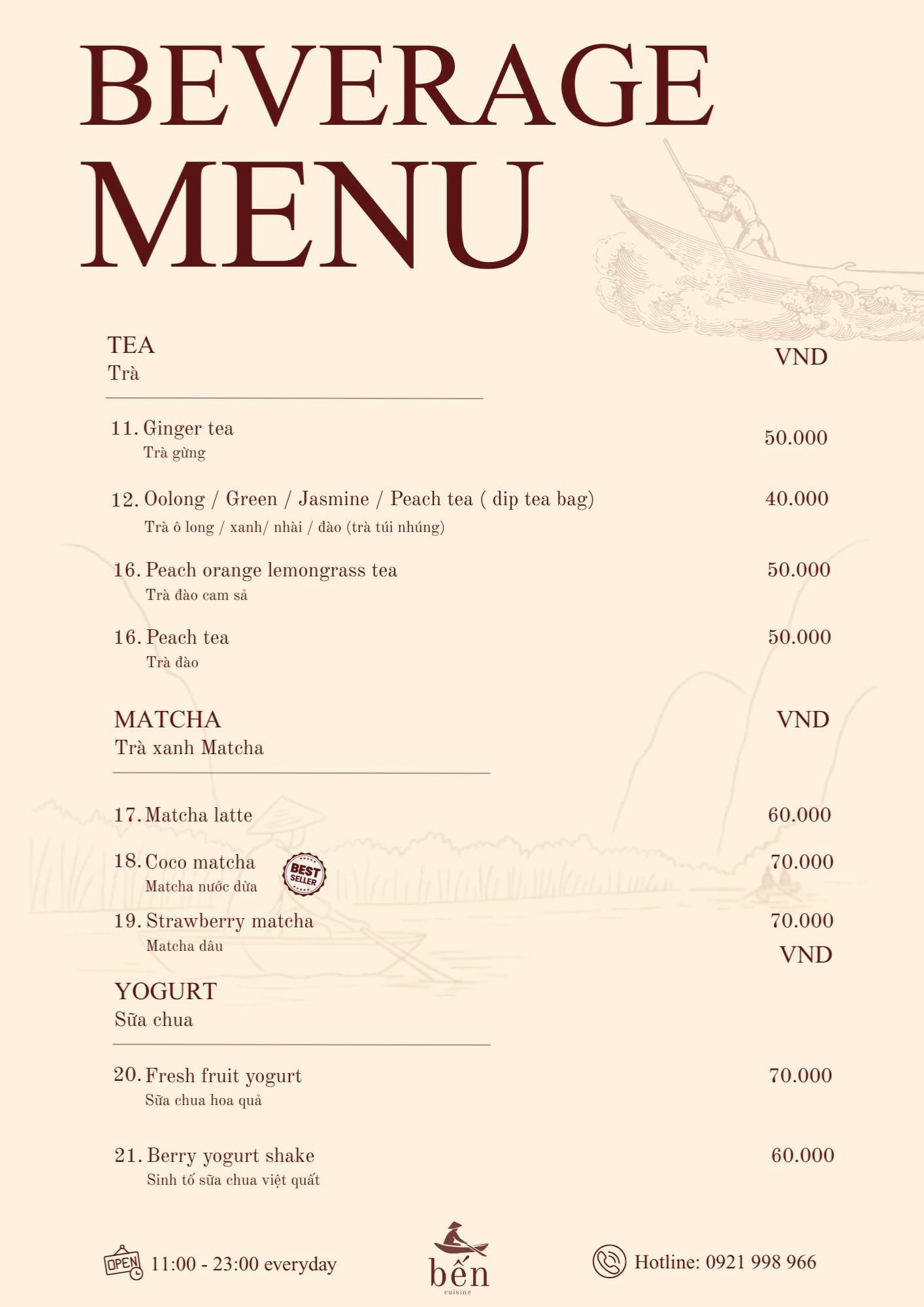 Danh sách thức uống tại Nhà hàng Bến Cuisine khá phong phú, từ các loại cà phê đến đồ uống trái cây mát lành. Cà phê trứng là lựa chọn được nhiều thực khách yêu thích, đặc biệt vào buổi sáng hoặc sau bữa ăn.