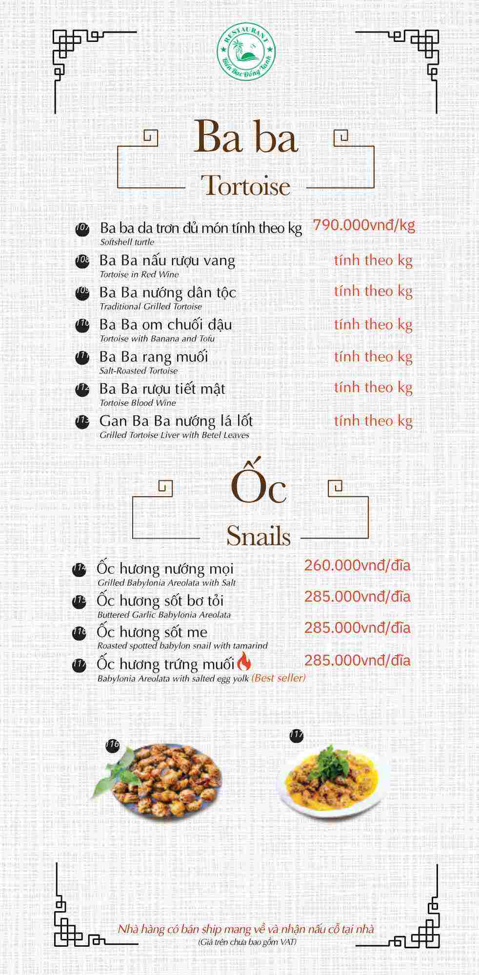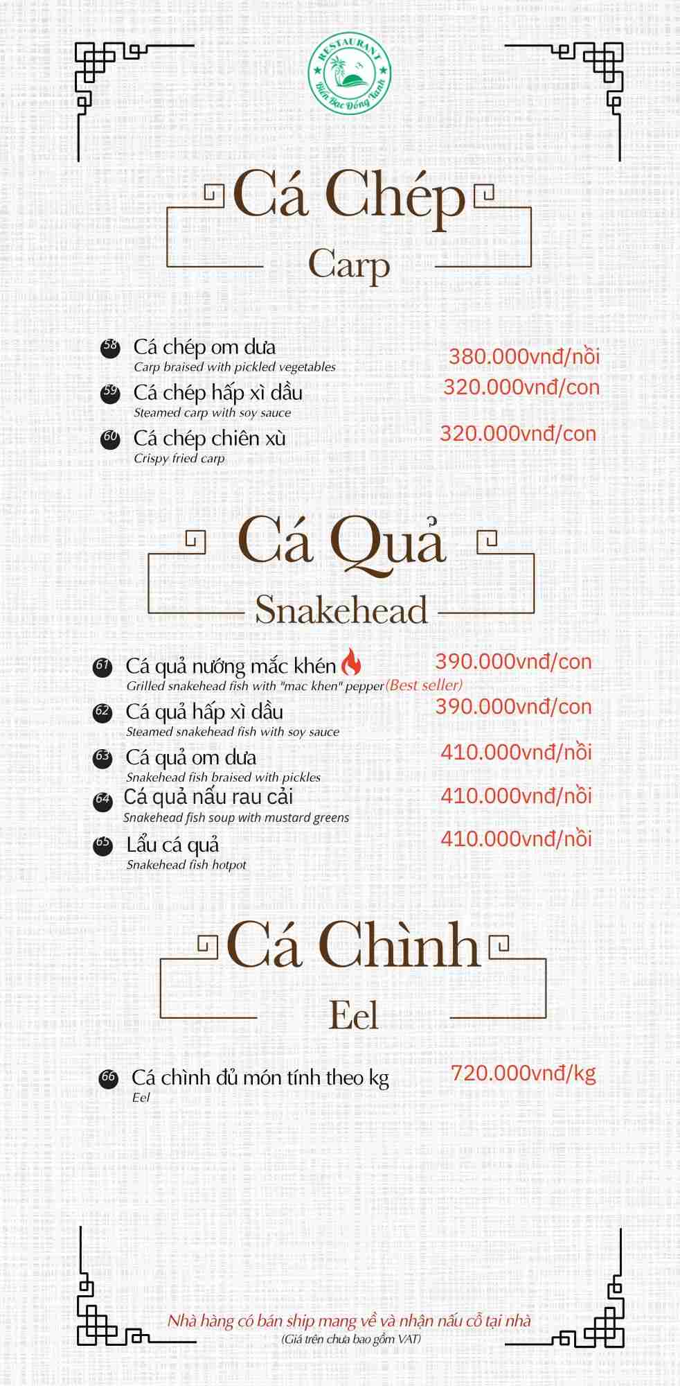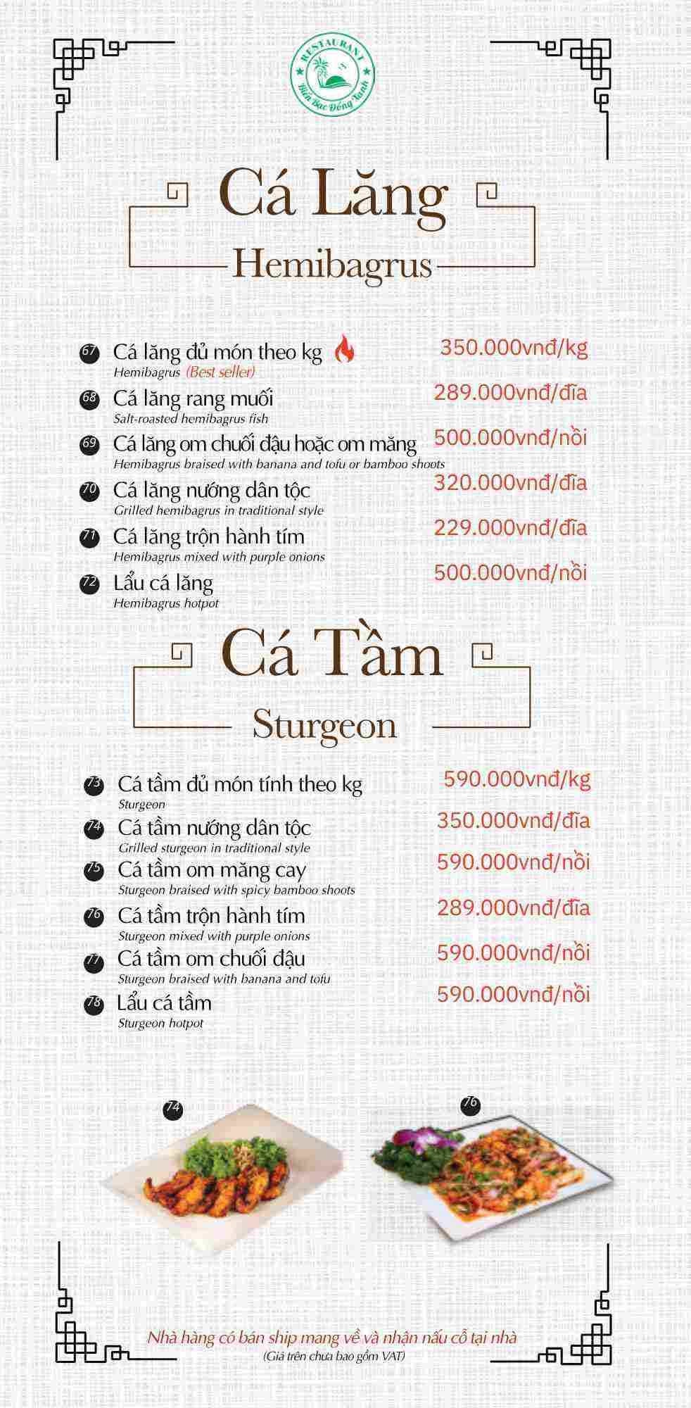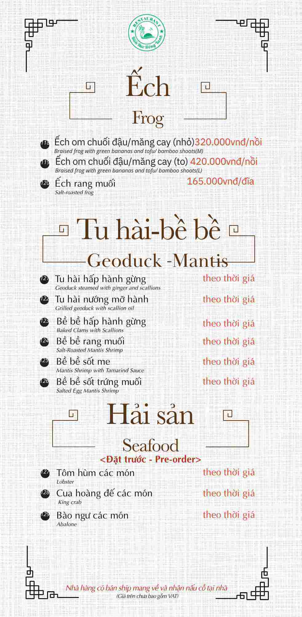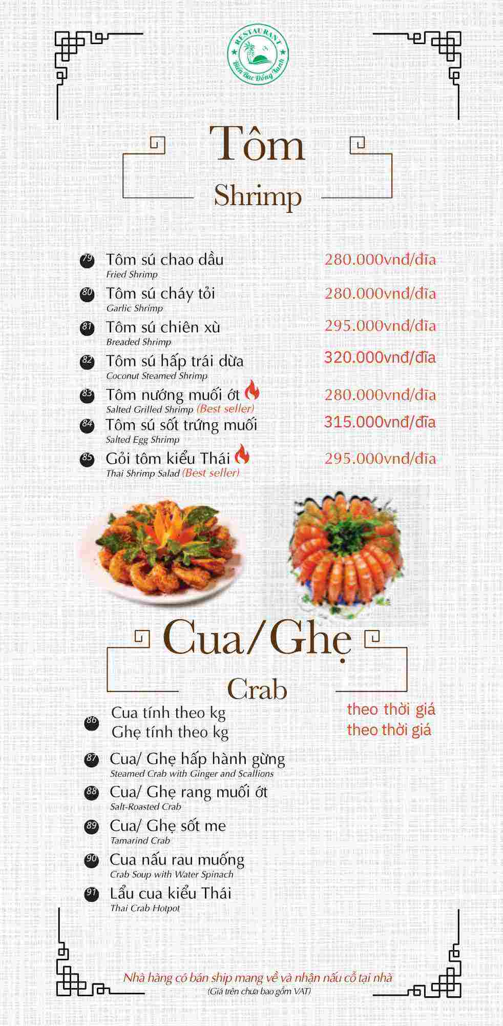 Sự hấp dẫn cốt lõi của Nhà hàng Biển Bạc Đồng Xanh nằm ở thực đơn. Đó là sự hòa hòa giữa món hải sản và sự mộc mạc của đồng quê.