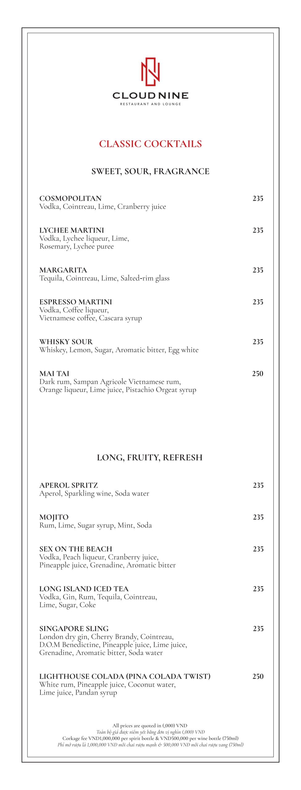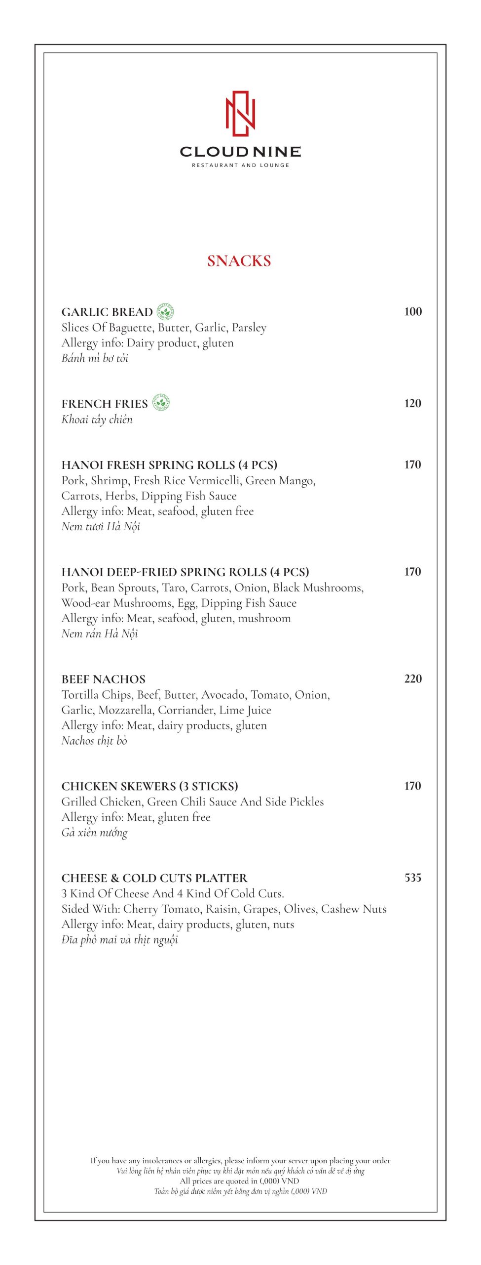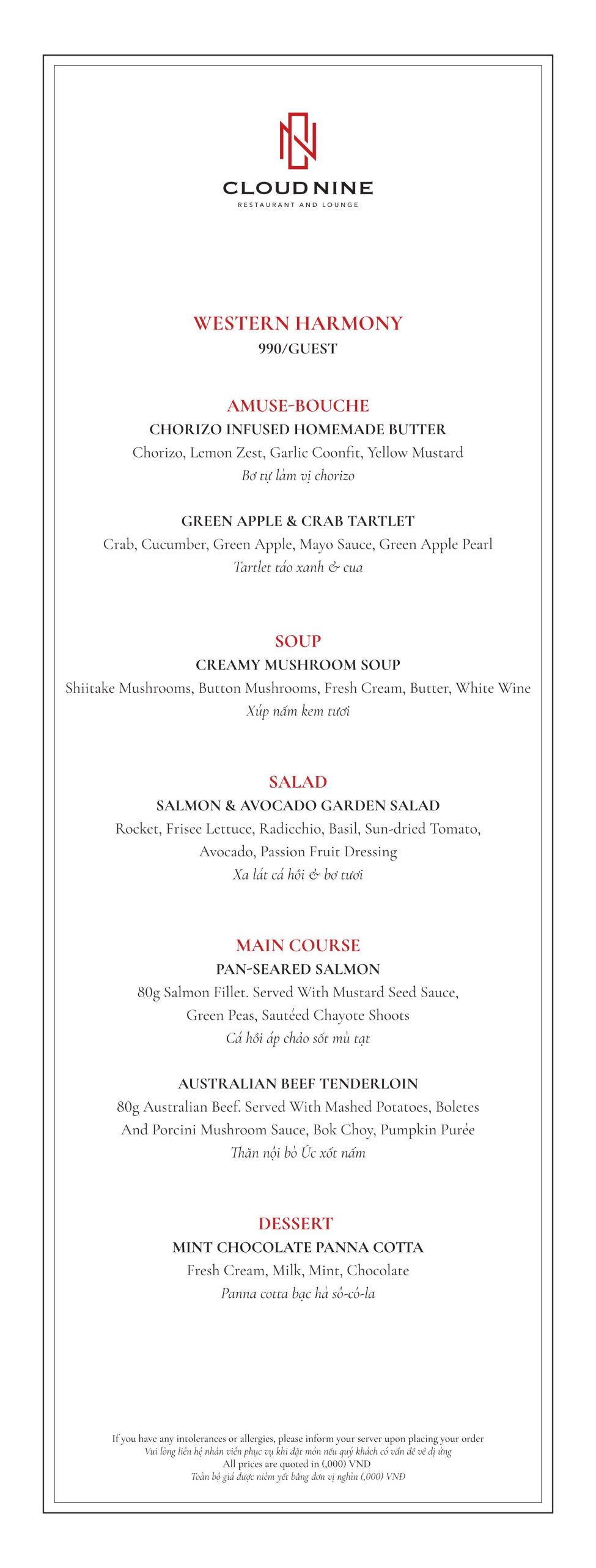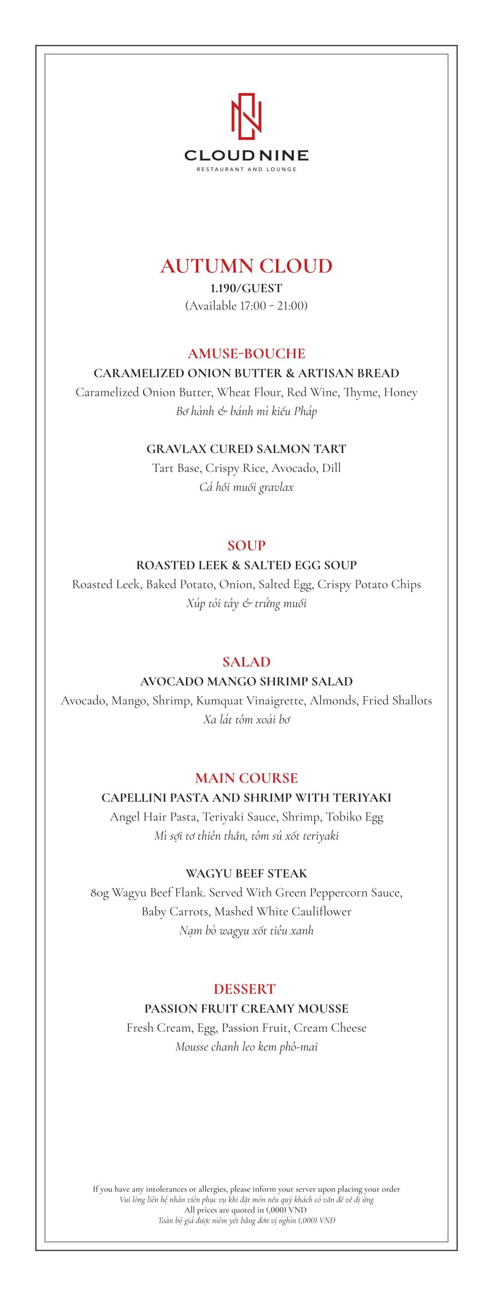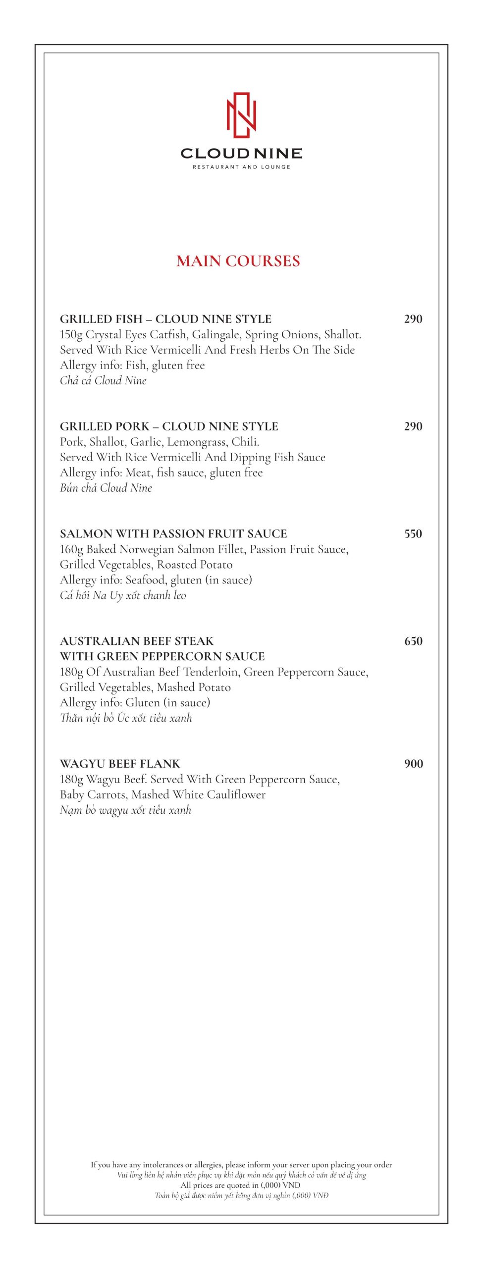 Cloud Nine Restaurant nổi tiếng với nền ẩm thực châu Âu lừng lẫy. Thực đơn tại nhà hàng vô cùng đa dạng. Với các món ăn hấp dẫn như: Bò nướng ống tre, Tôm khoai môn, Salad hoàng đế với tôm nướng, Cá hồi Nauy, Thăn bò Úc nướng với gan ngỗng ăn kèm sốt nấm,…