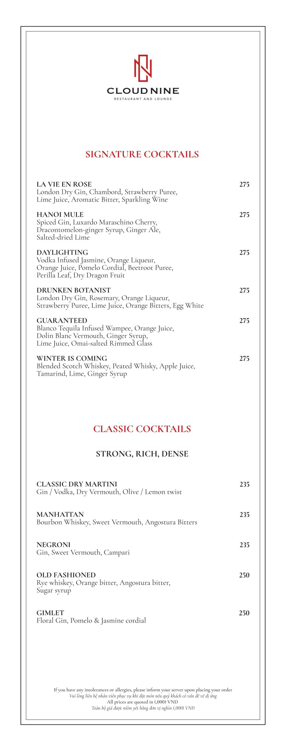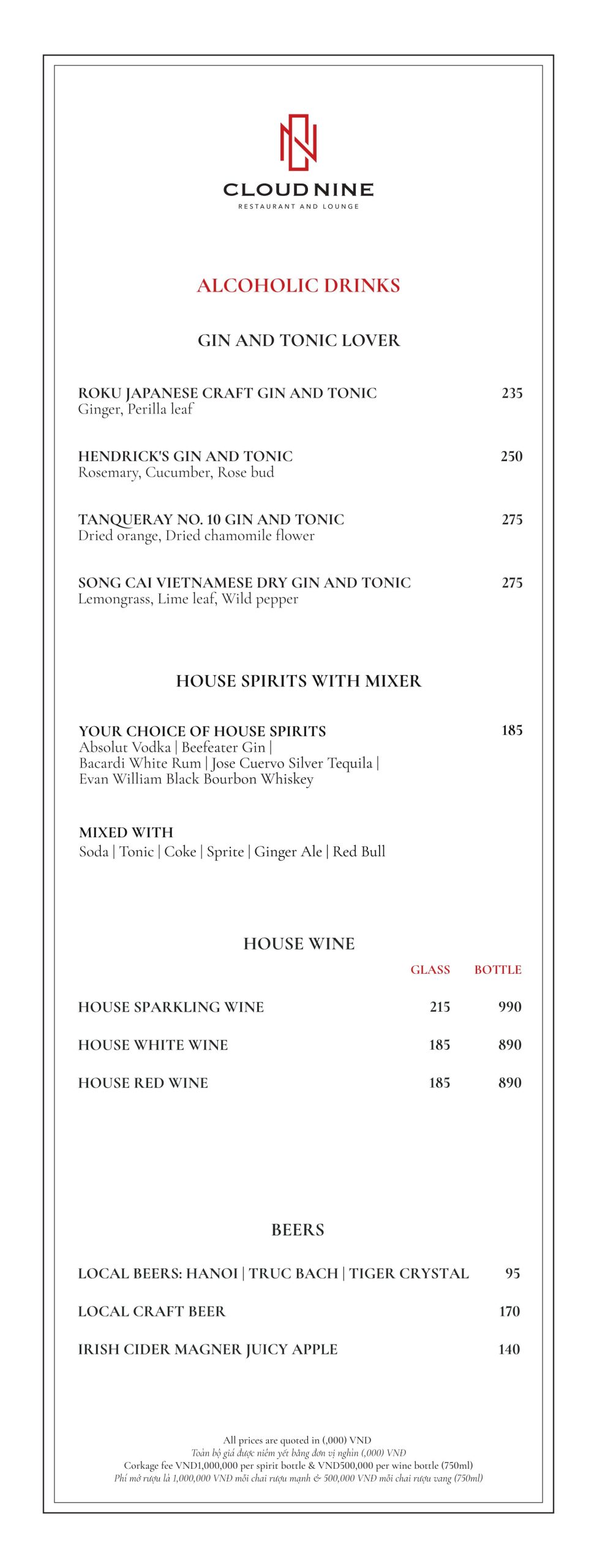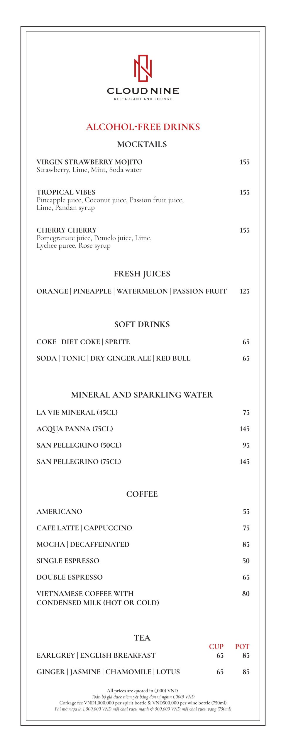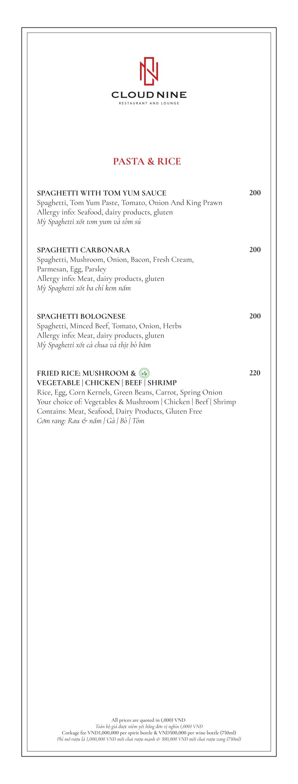 Cloud Nine Restaurant nổi tiếng với nền ẩm thực châu Âu lừng lẫy. Thực đơn tại nhà hàng vô cùng đa dạng. Với các món ăn hấp dẫn như: Bò nướng ống tre, Tôm khoai môn, Salad hoàng đế với tôm nướng, Cá hồi Nauy, Thăn bò Úc nướng với gan ngỗng ăn kèm sốt nấm,…