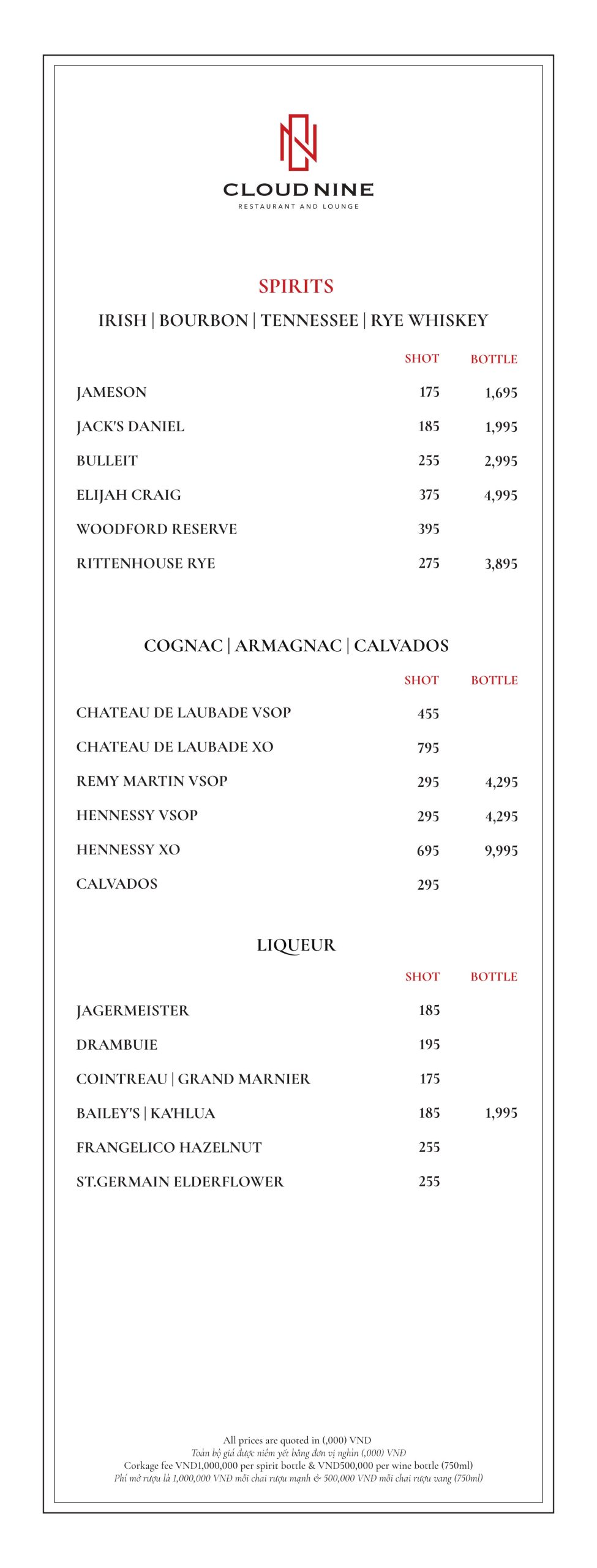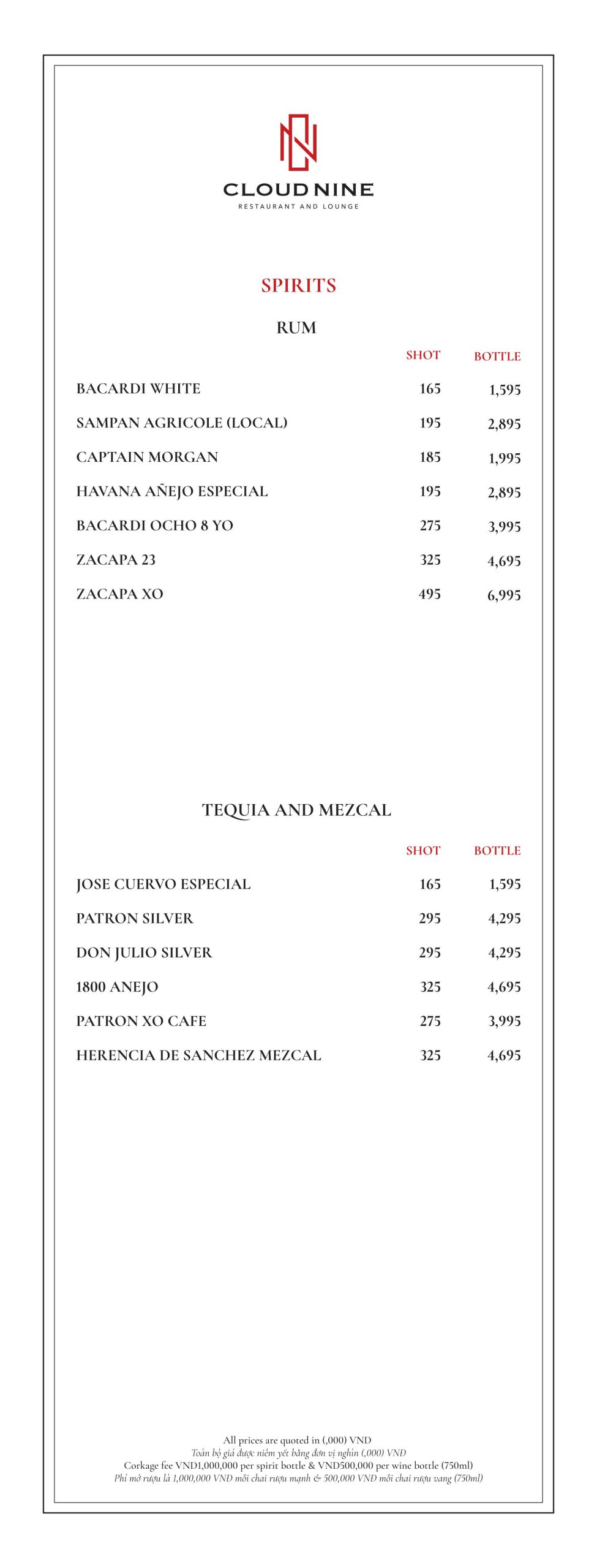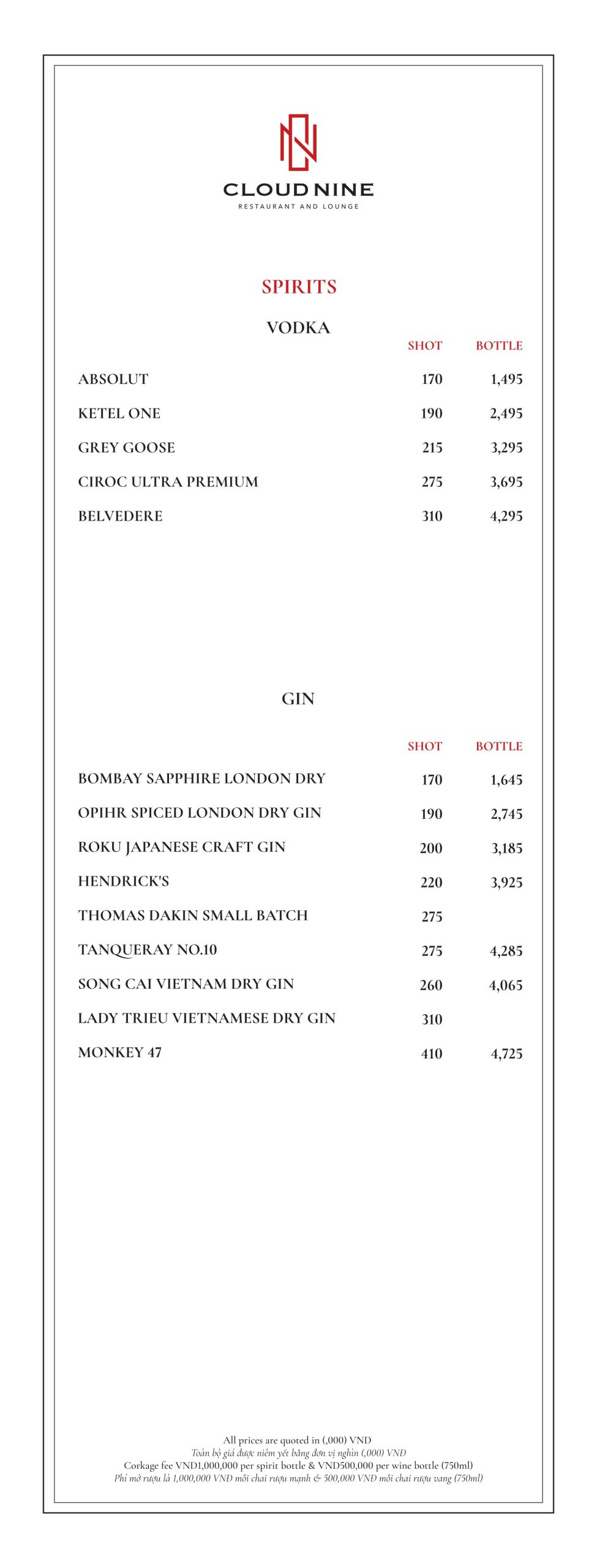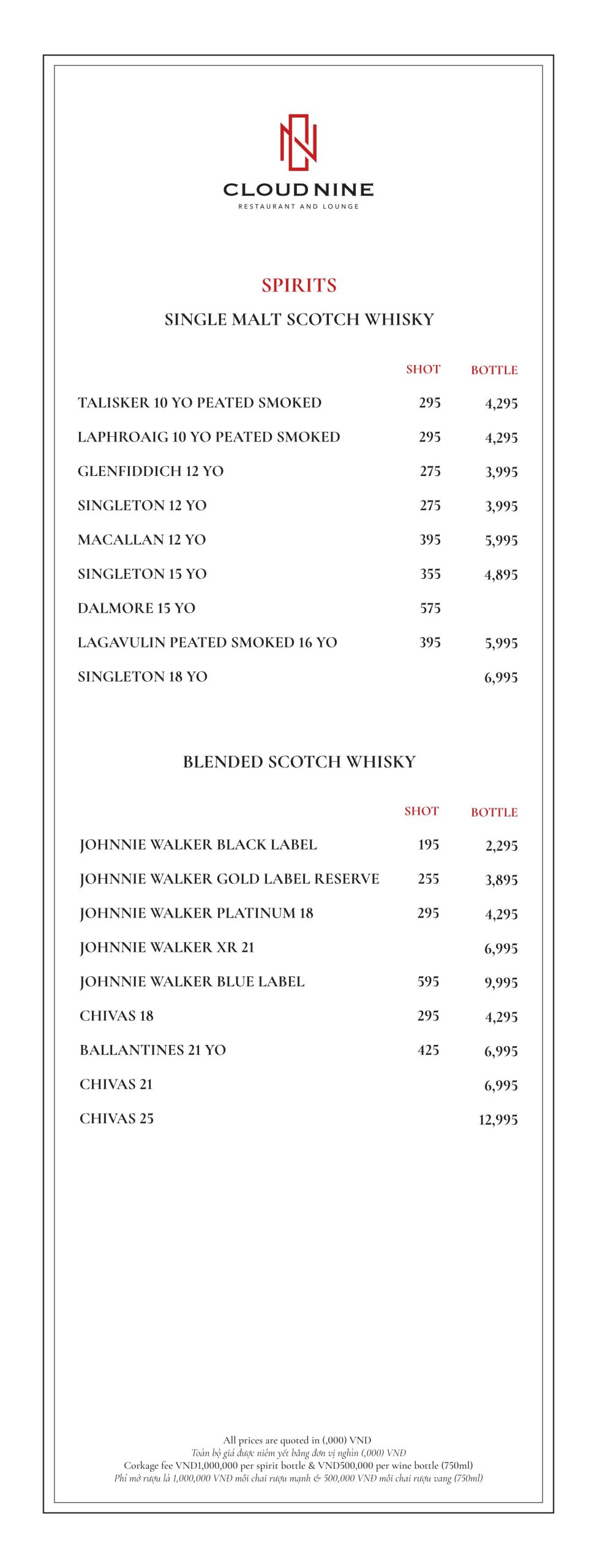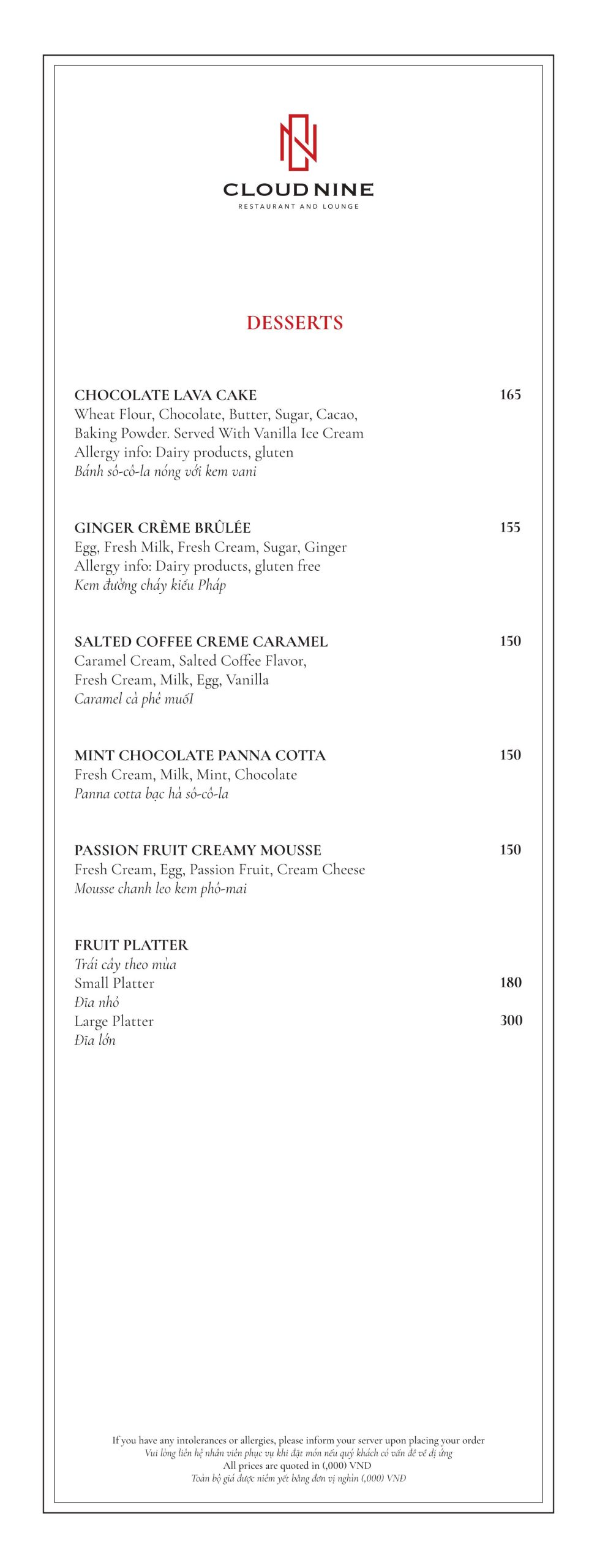 Cloud Nine Restaurant nổi tiếng với nền ẩm thực châu Âu lừng lẫy. Thực đơn tại nhà hàng vô cùng đa dạng. Với các món ăn hấp dẫn như: Bò nướng ống tre, Tôm khoai môn, Salad hoàng đế với tôm nướng, Cá hồi Nauy, Thăn bò Úc nướng với gan ngỗng ăn kèm sốt nấm,…