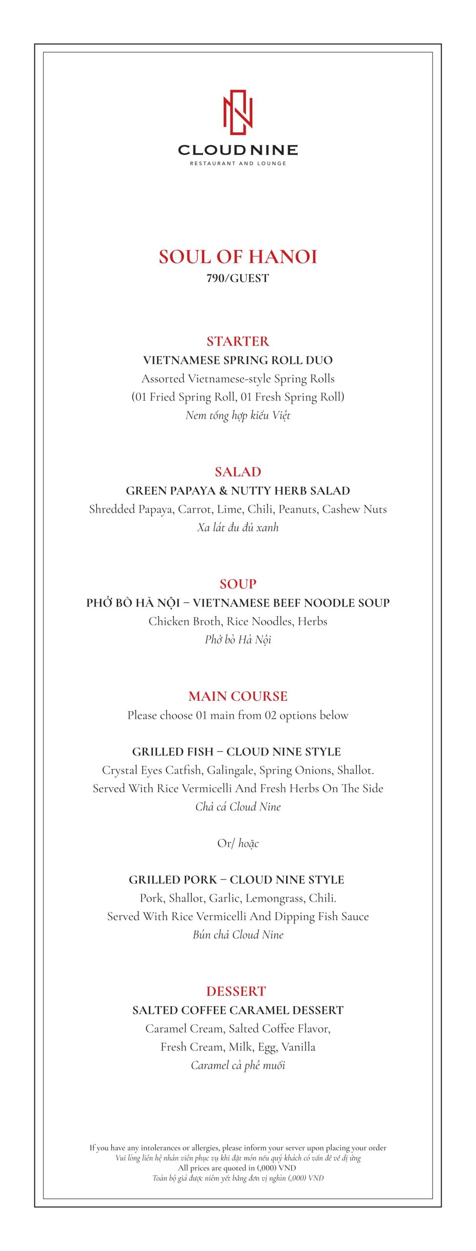 Ngoài ra, nhà hàng không chỉ độc đáo bởi những món ăn châu Âu hấp dẫn. Mà tại nhà hàng, vẫn sở hữu món phở truyền thống của người Việt – món ăn không thể thiếu khi bạn đặt chân đến thành phố Hà Nội. Để làm được một bát phở chuẩn vị. Đội ngũ đầu bếp chuyên Âu vẫn không thể nào quên được cách hầm nước dùng được ông cha ta truyền lại. Nước dùng của phở tại Cloud Nine Restaurant có một điểm rất đặc biệt. Đó chính là nước hầm xương tại đây được giữ trong một lò sưởi suất 24h. Khi mang ra phục vụ, nước dùng sẽ được đổ từ từ vào bát ở một độ cao nhất định. Điều này giúp làm đánh thức các giác quan của thực khách với mùi hương đặc biệt này trước khi thưởng thức món Phở truyền thống.