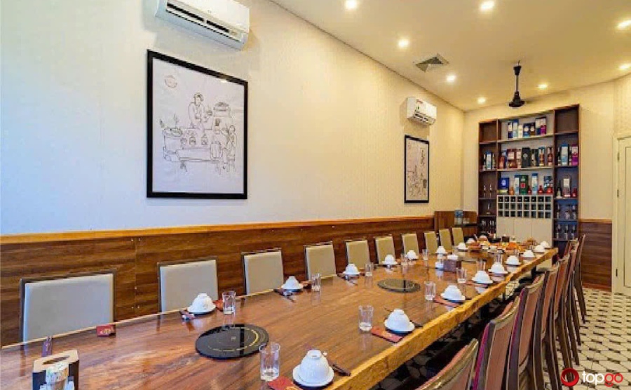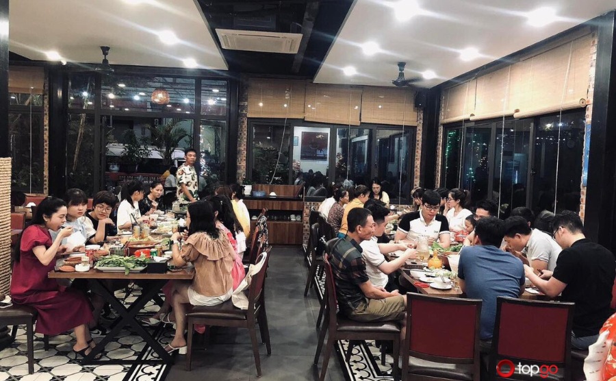 Ánh đèn vàng nhẹ nhàng cùng nội thất gỗ mộc mạc mang đến bầu không khí ấm áp. Bàn ghế được sắp xếp hợp lý, giữ sự riêng tư vừa đủ nhưng vẫn gắn kết. Thực khách thường ví bữa ăn tại nhà hàng giống như một mâm cơm gia đình, nơi mọi người quây quần trong tiếng cười thân thiện.