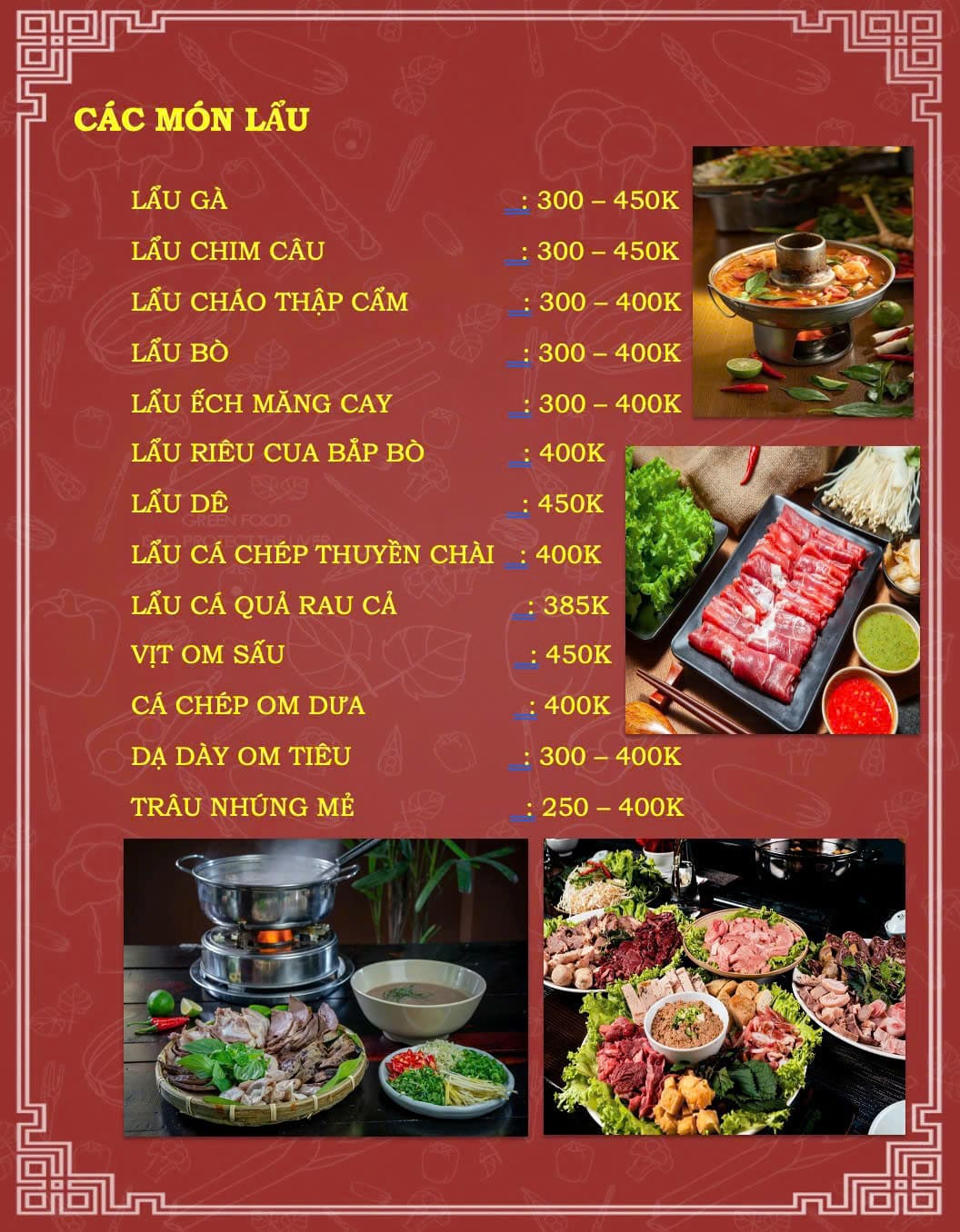 Trong thực đơn của Nhà Hàng Cơm Quê Mai Về, lẩu là món không thể thiếu. Hai món lẩu được thực khách yêu thích nhất là lẩu cháo và lẩu riêu đồng quê. Lẩu cháo mang hương vị thanh nhẹ và ấm áp. Nồi cháo nóng hổi kết hợp cùng các nguyên liệu tươi ngon tạo nên trải nghiệm rất đặc biệt. Lẩu riêu đồng quê lại đậm đà hơn. Nước lẩu thơm mùi riêu cua, vị chua thanh nhẹ và rất dễ ăn. Mức giá dao động từ 250.000 đến 450.000 đồng cho một nồi lẩu. Đây là lựa chọn phù hợp cho nhóm bạn hoặc gia đình.