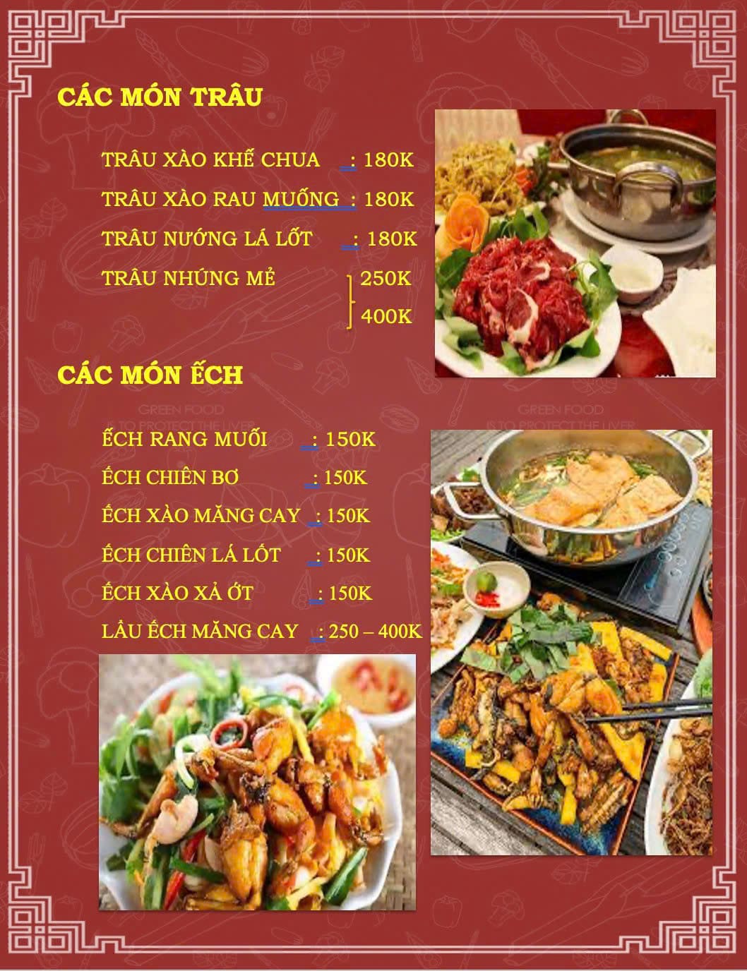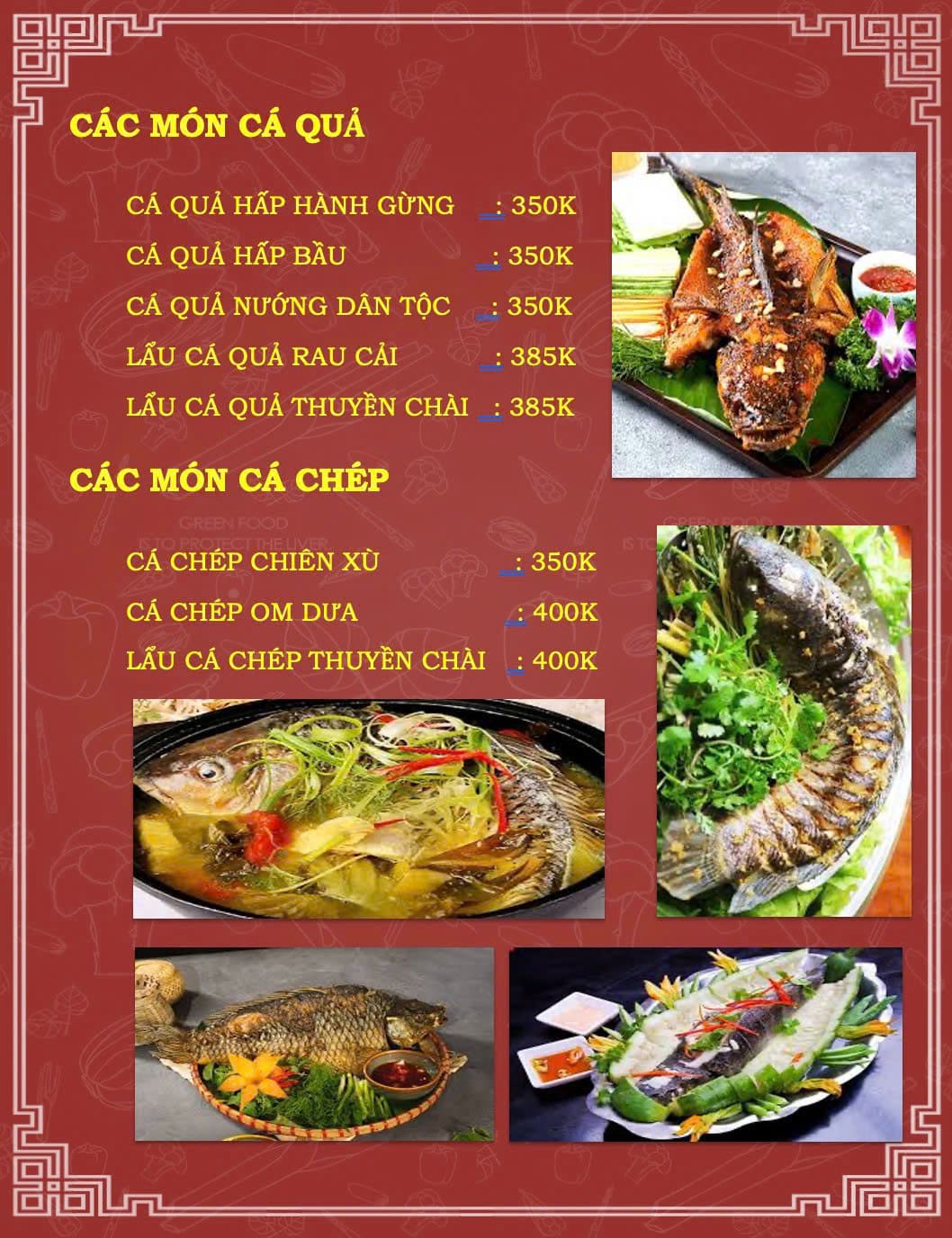 - Món nổi bật: Cá sông đủ món, cá tầm, cá lăng, ba ba, gà chọi, lẩu cháo, lẩu riêu đồng quê, các món đồng quê dân dã