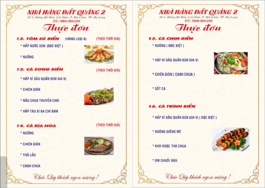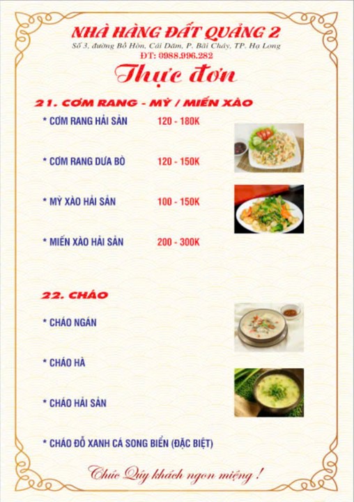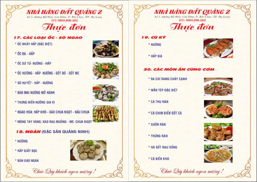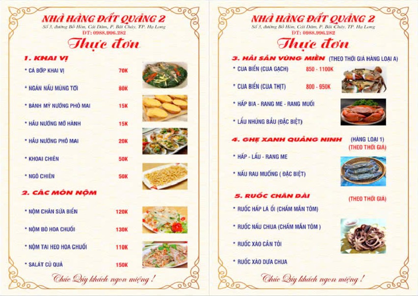 Thực đơn của Nhà hàng Đất Quảng 2 được xây dựng để dễ lựa chọn cho nhóm khách đông. Các món ăn có thể kết hợp linh hoạt theo số lượng người.