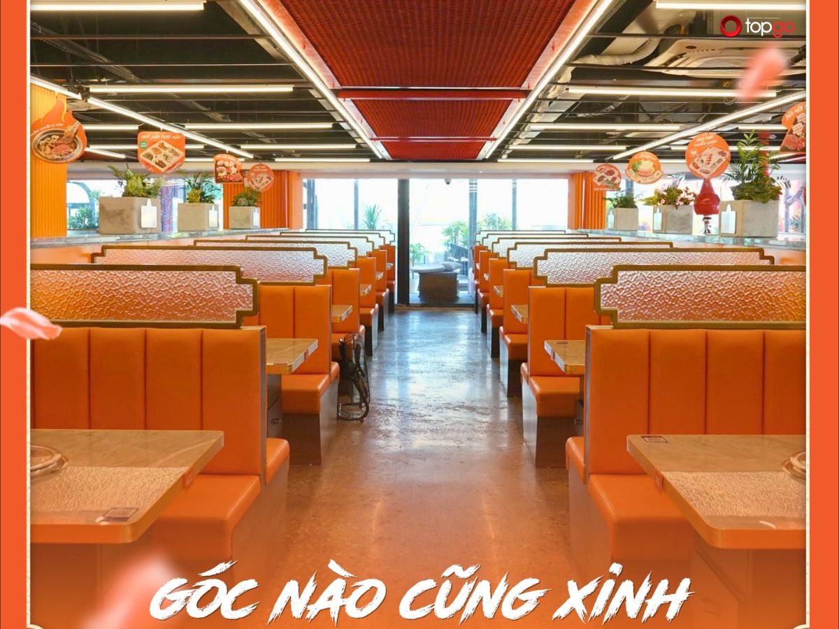 Không gian được thiết kế rộng và thoáng. Bàn ghế bố trí theo cụm, phù hợp cho nhóm từ nhỏ đến lớn. Trần cao và ánh sáng tốt giúp không bị bí dù đông khách.