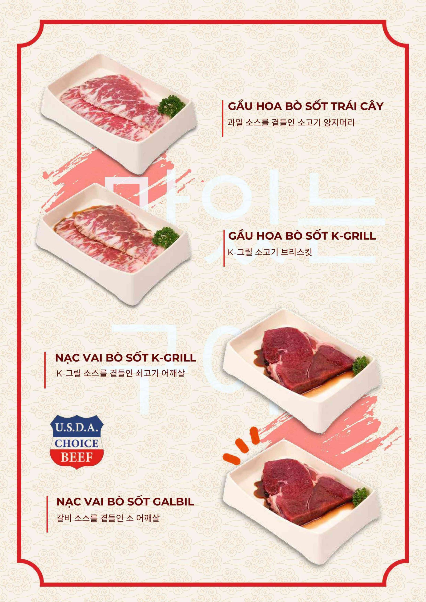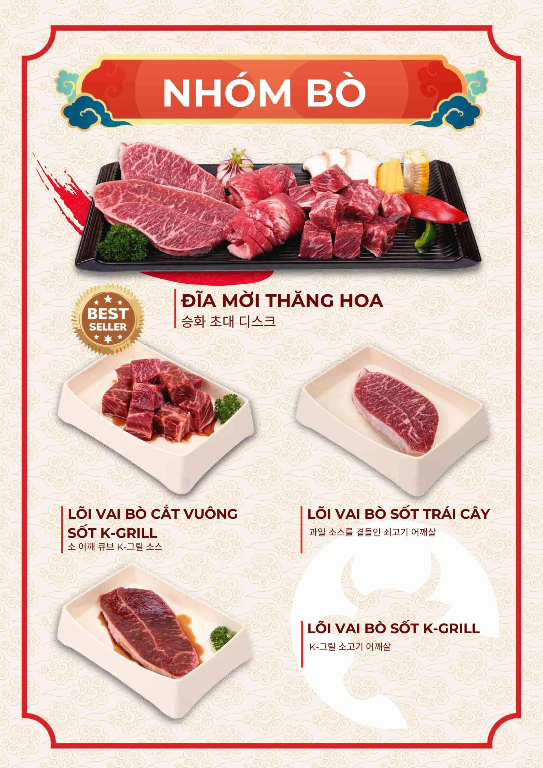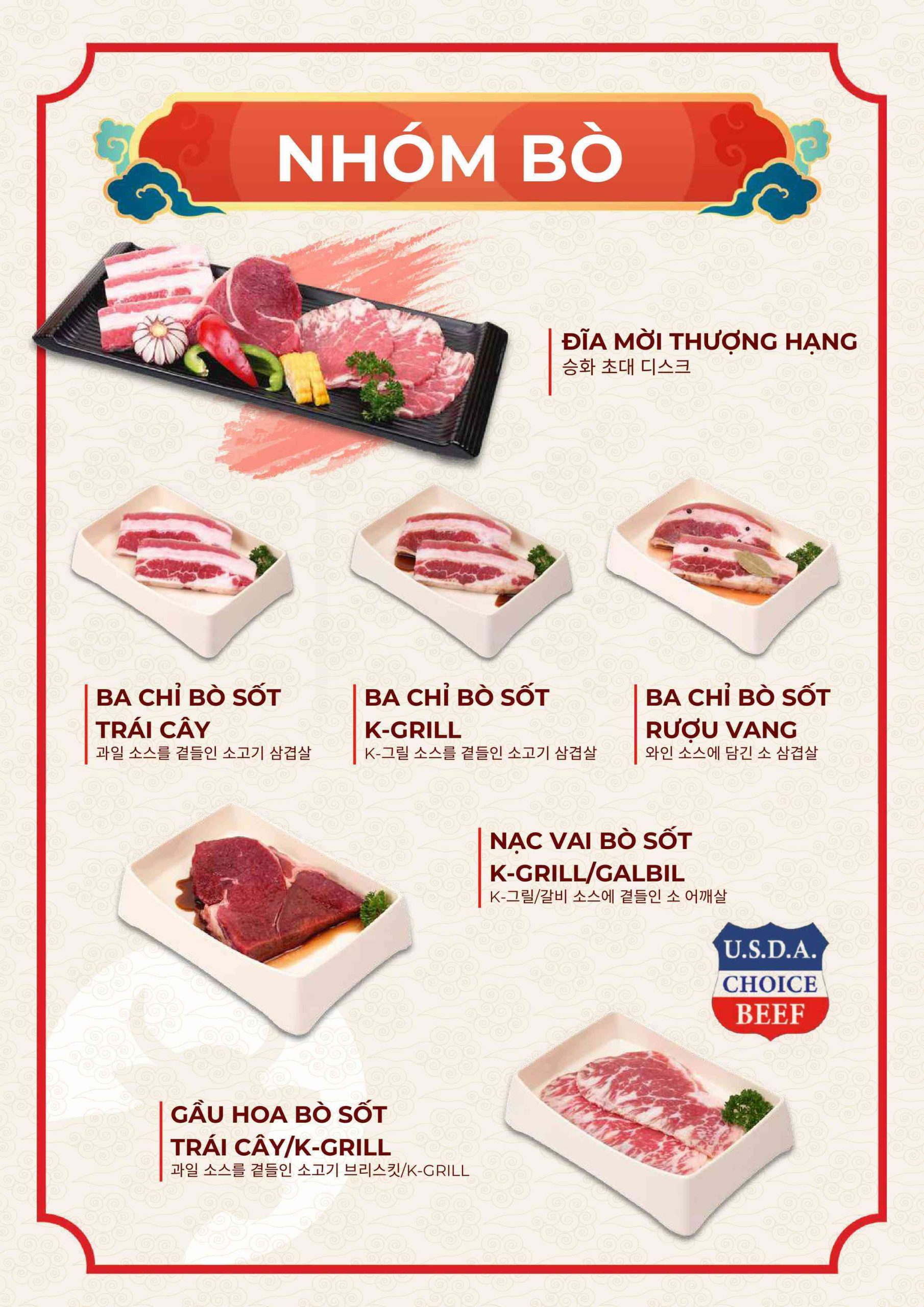 Thực đơn tại Nhà hàng K-Grill đi theo hướng quen thuộc nhưng được tối ưu cho trải nghiệm nhóm.