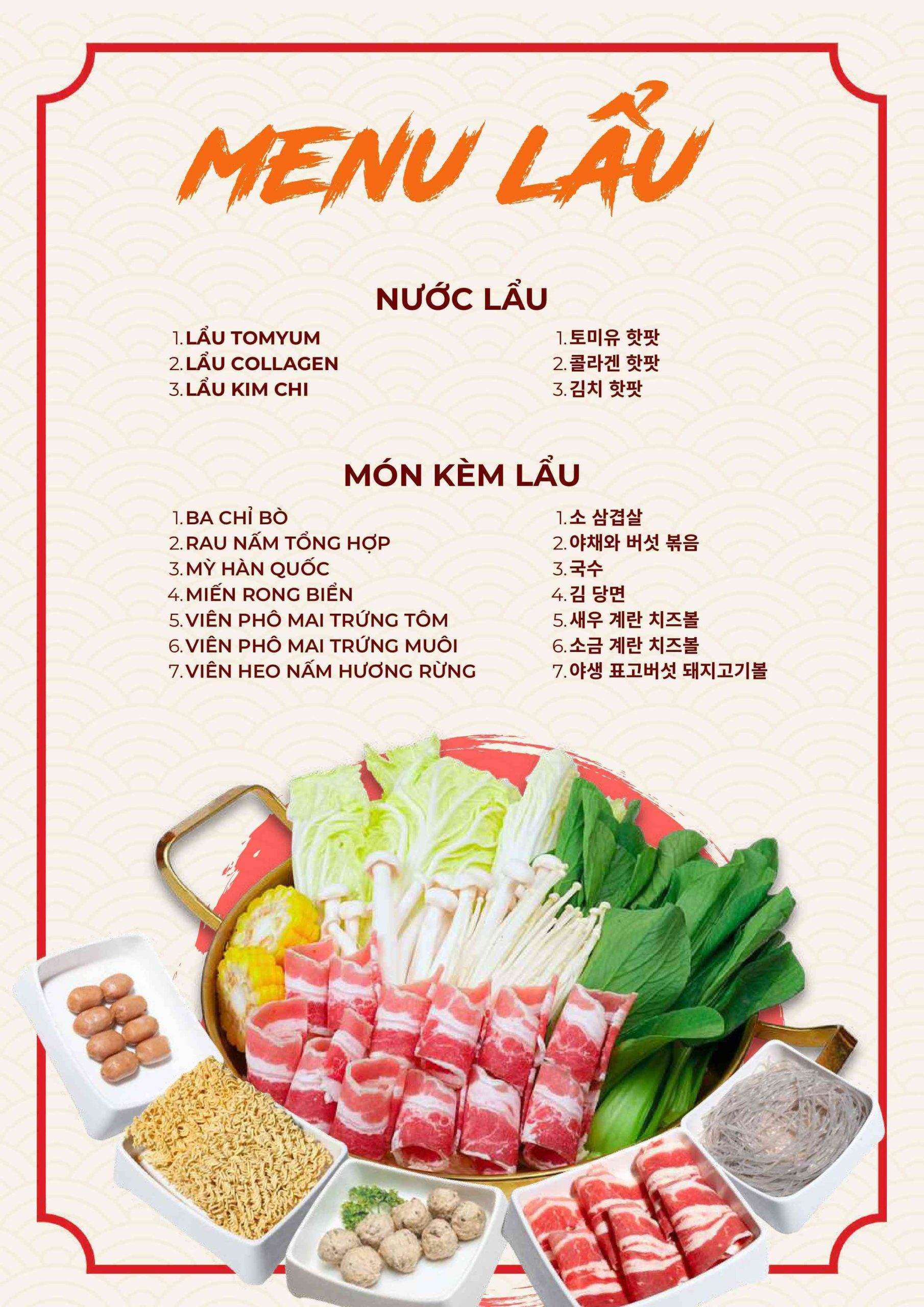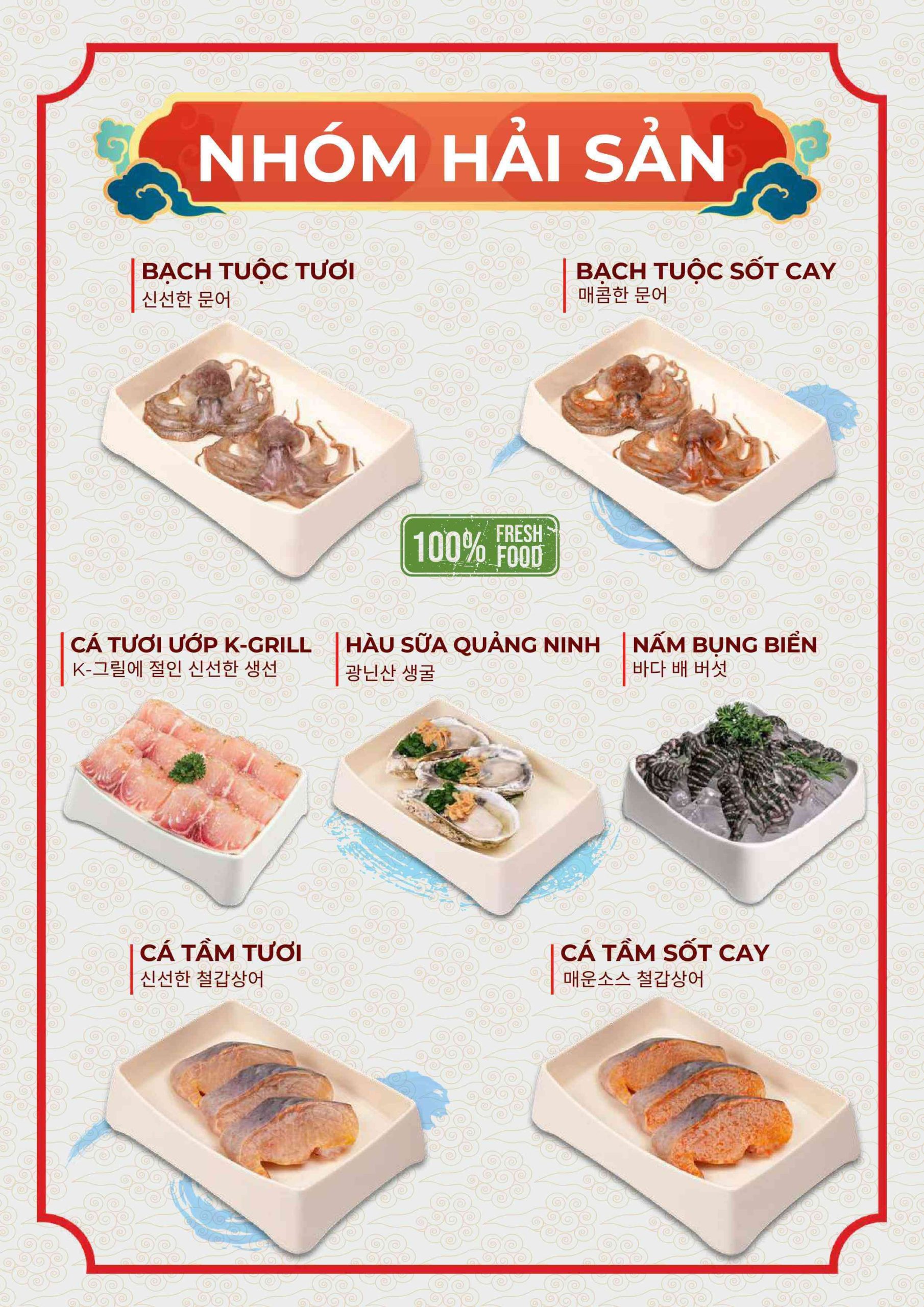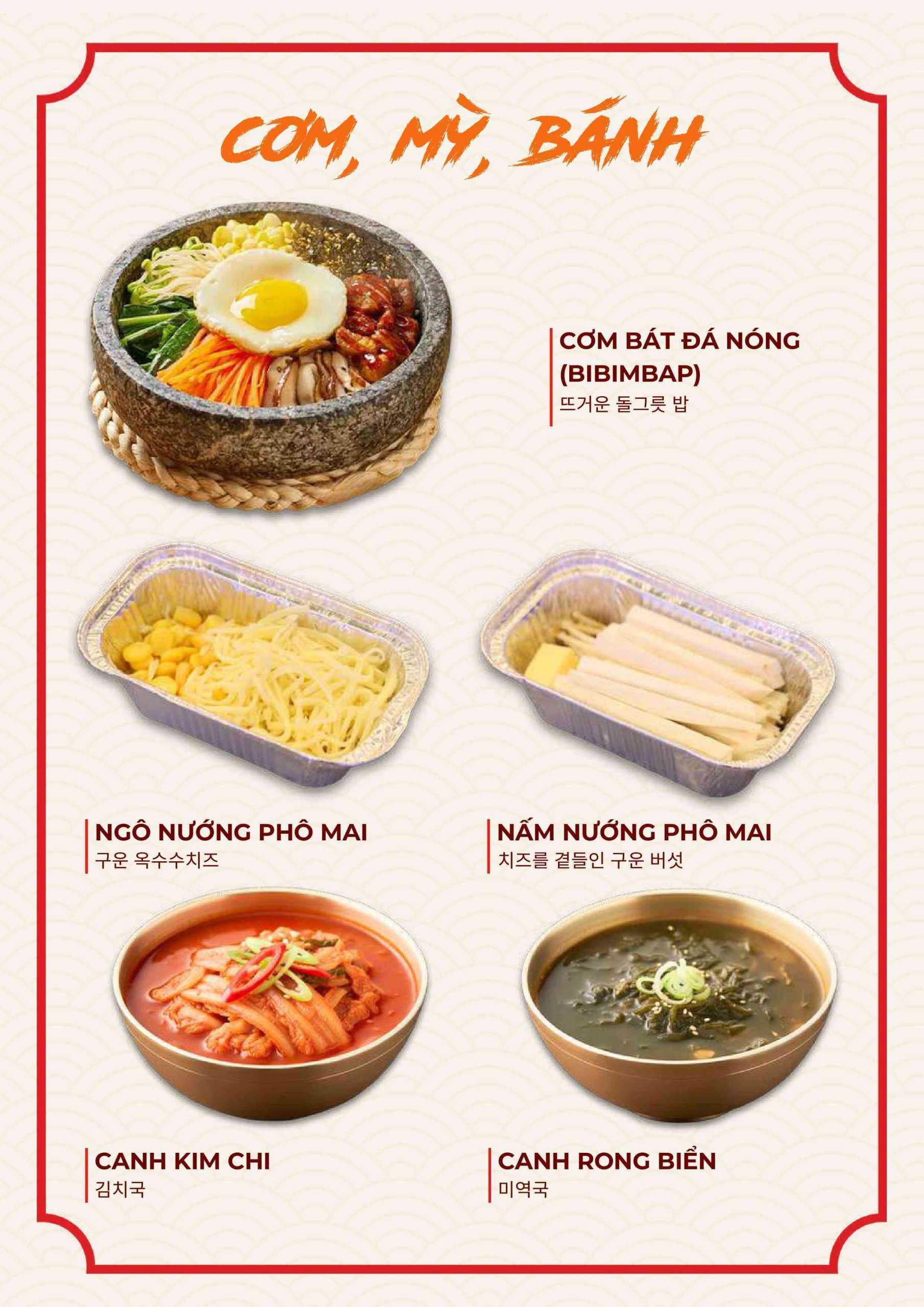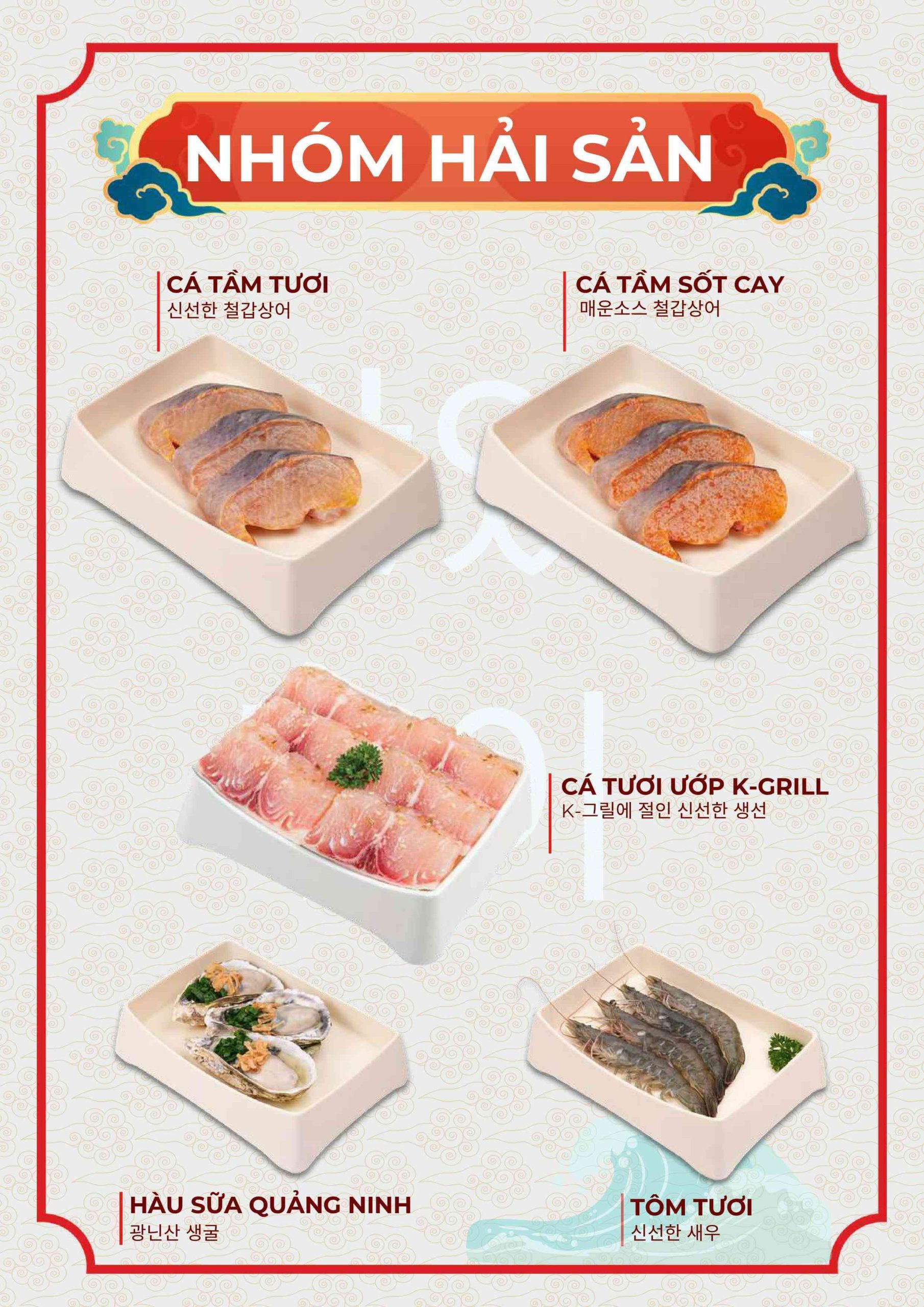 Menu tập trung vào các món nướng và lẩu phong cách Hàn. Ngoài ra còn có nhiều món ăn kèm và món nóng. Điều này giúp bữa ăn không bị đơn điệu.