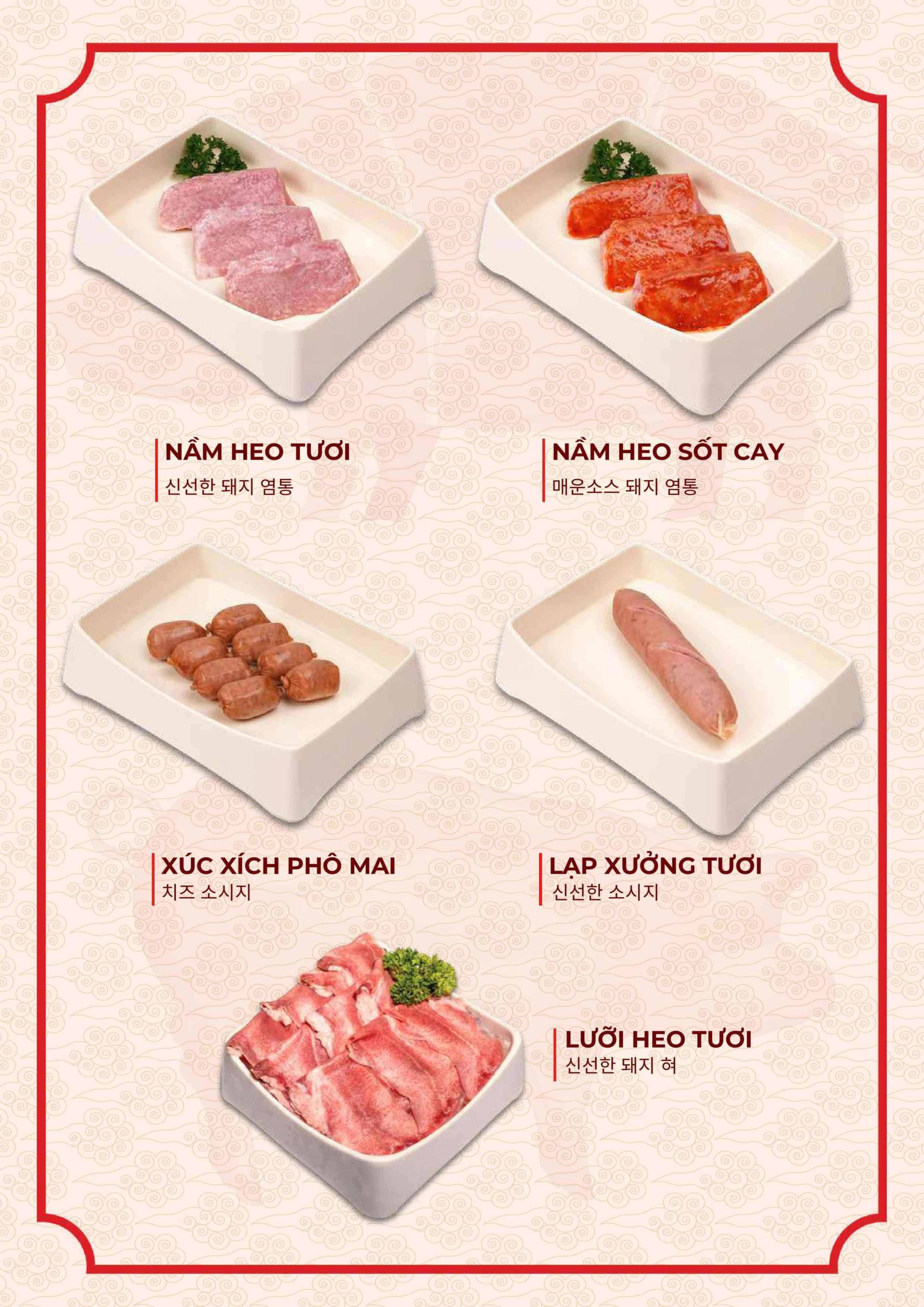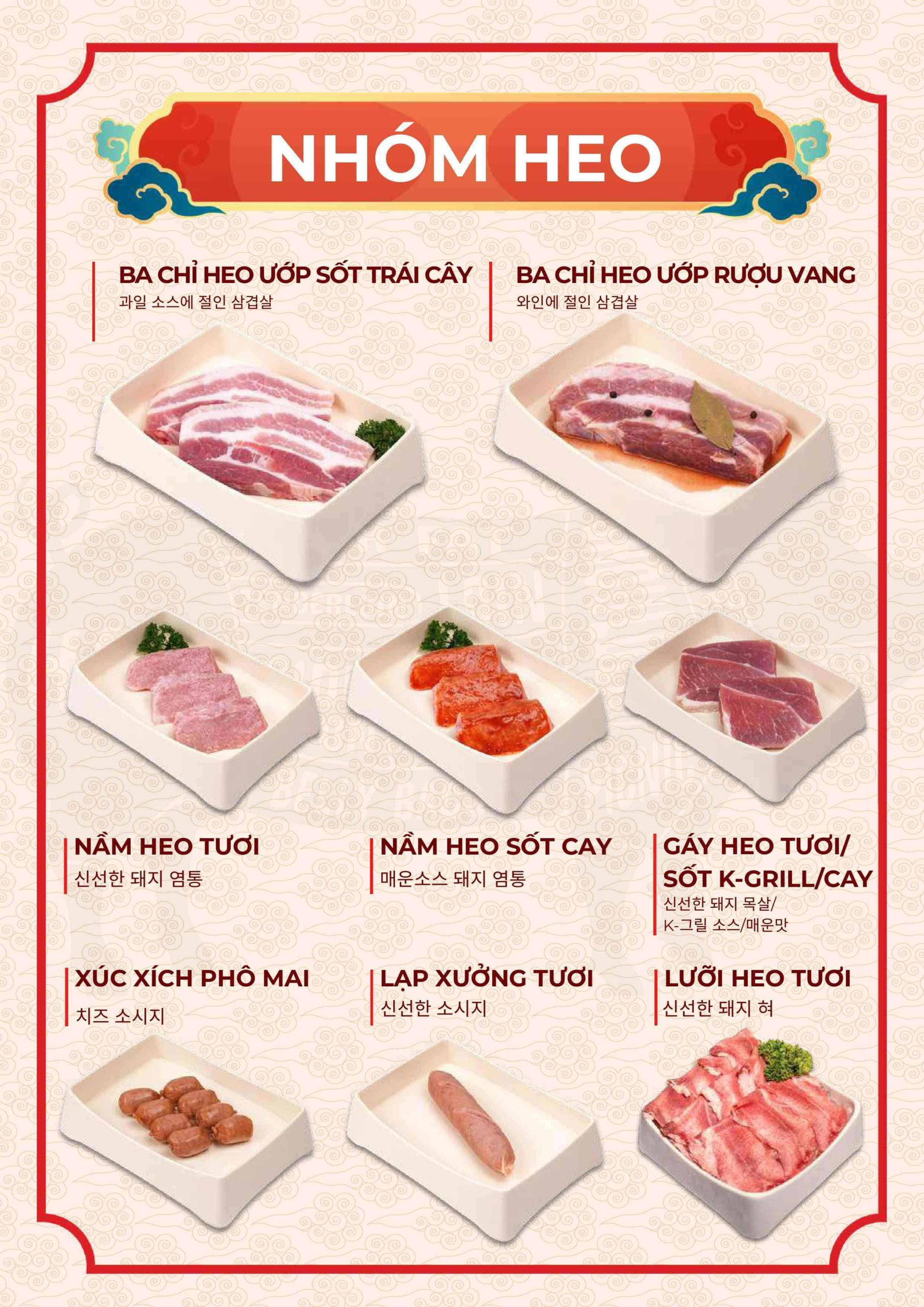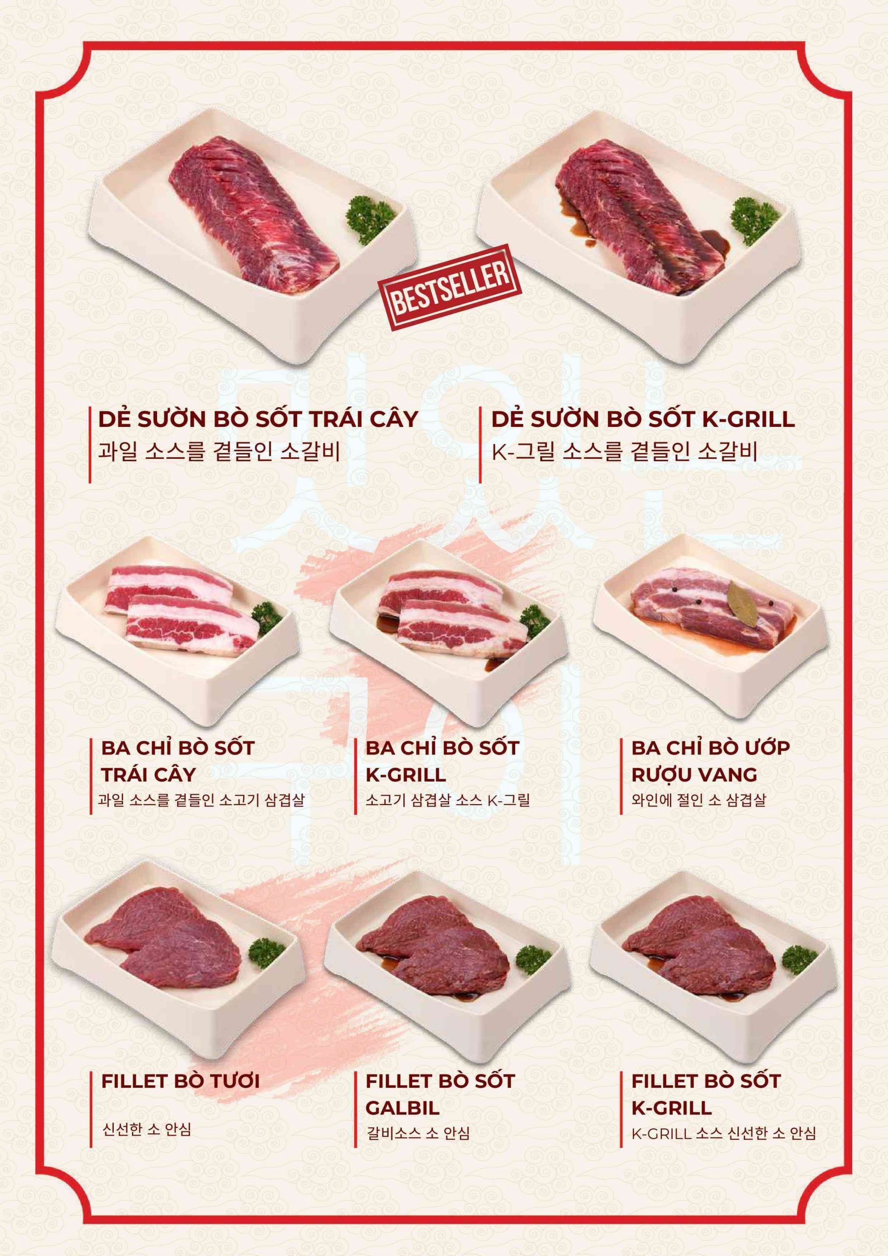 Menu tập trung vào các món nướng và lẩu phong cách Hàn. Ngoài ra còn có nhiều món ăn kèm và món nóng. Điều này giúp bữa ăn không bị đơn điệu.