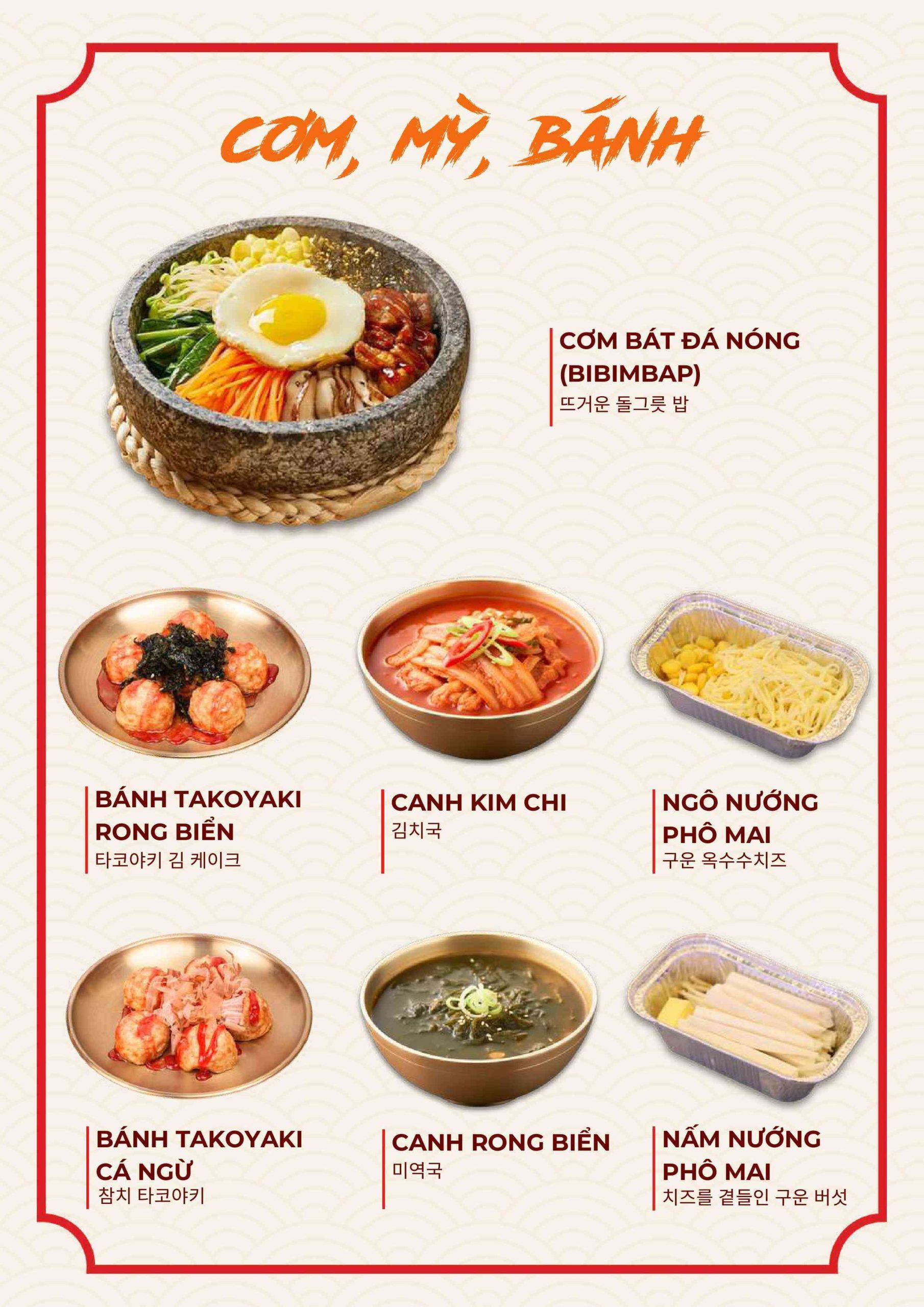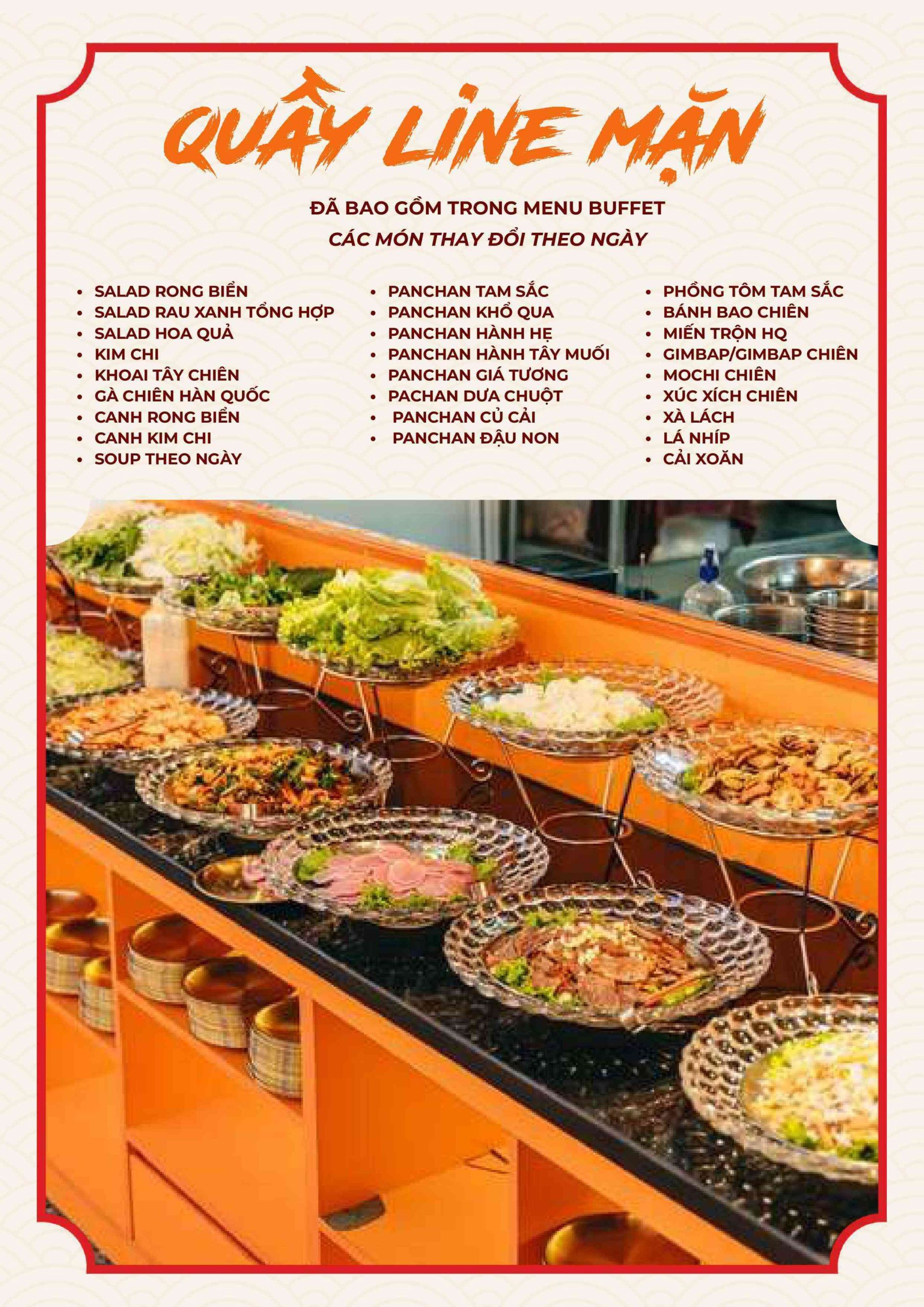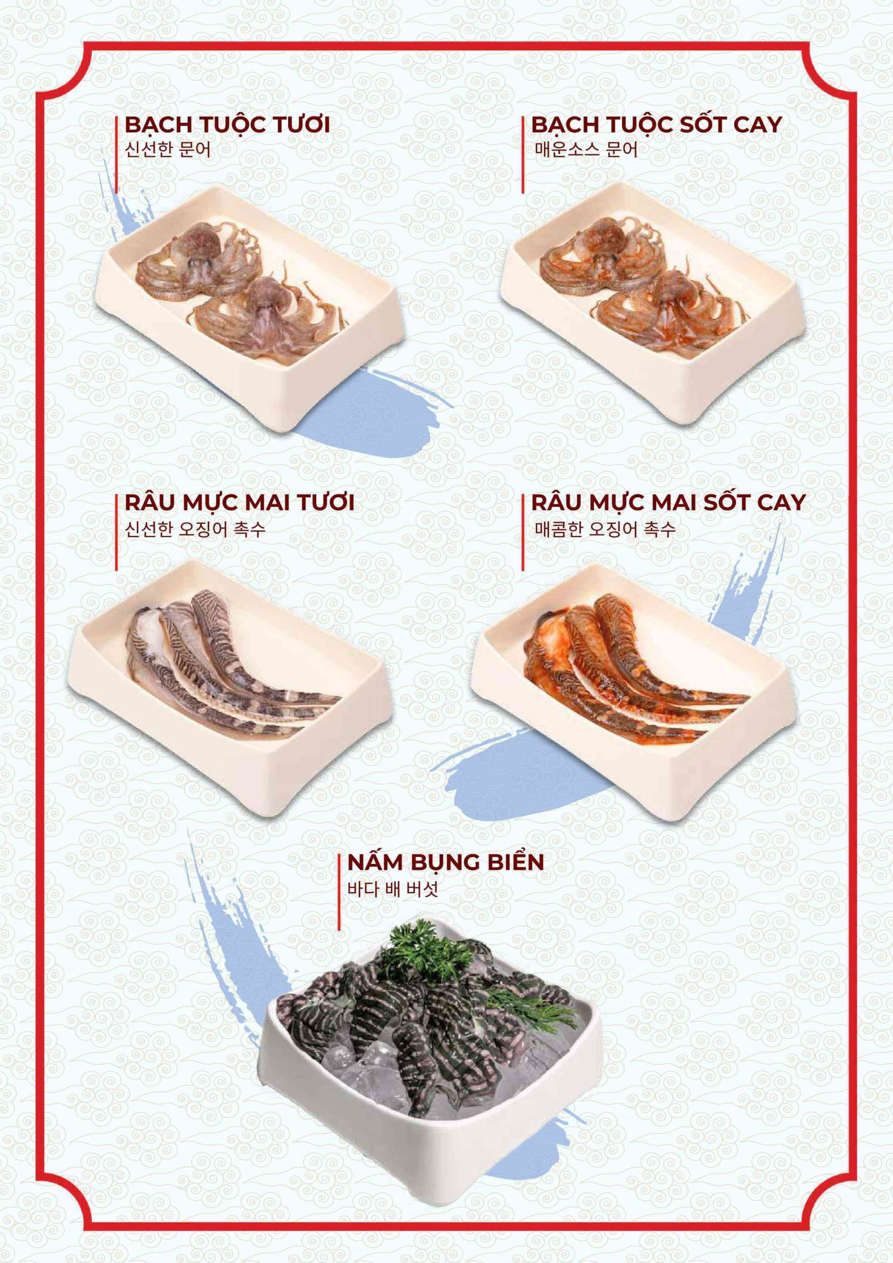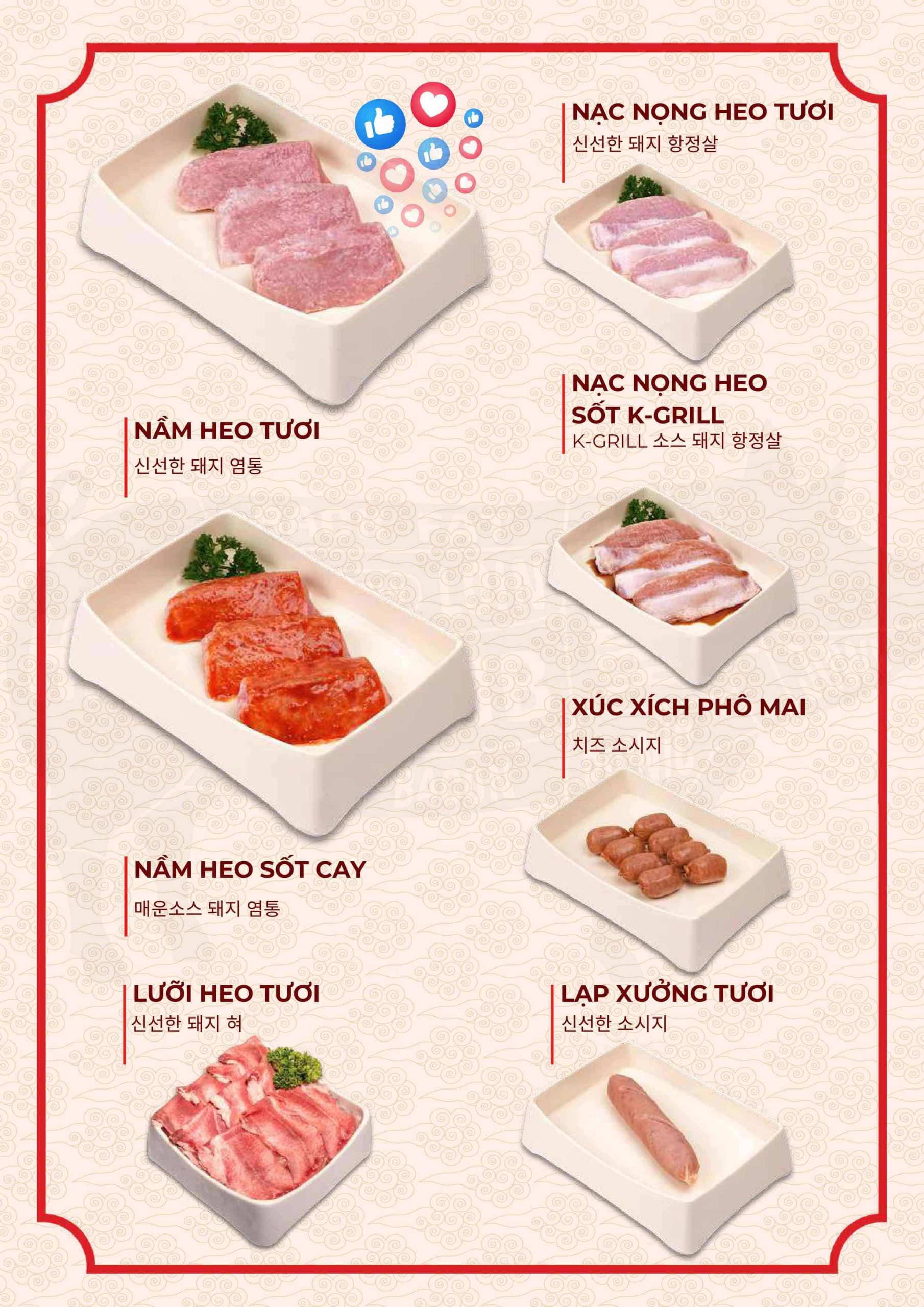 Menu tập trung vào các món nướng và lẩu phong cách Hàn. Ngoài ra còn có nhiều món ăn kèm và món nóng. Điều này giúp bữa ăn không bị đơn điệu.