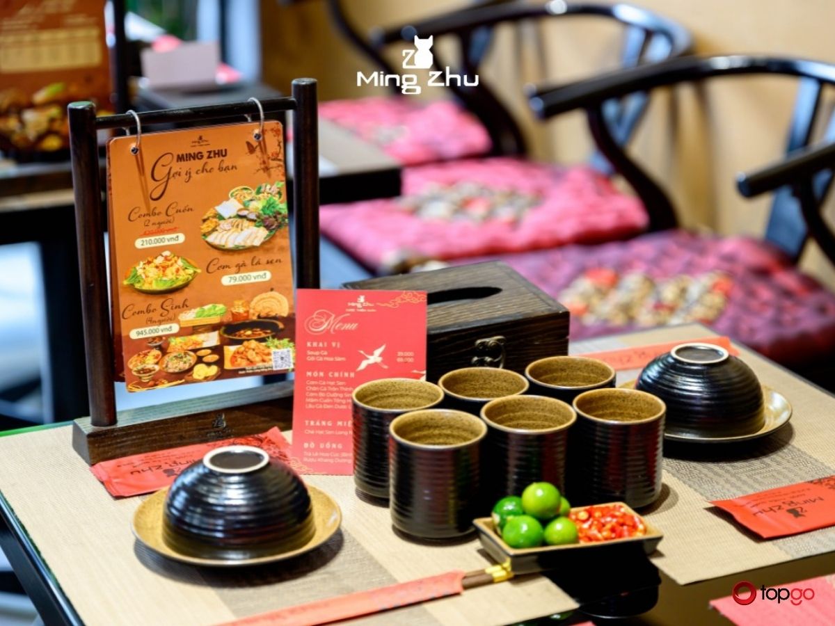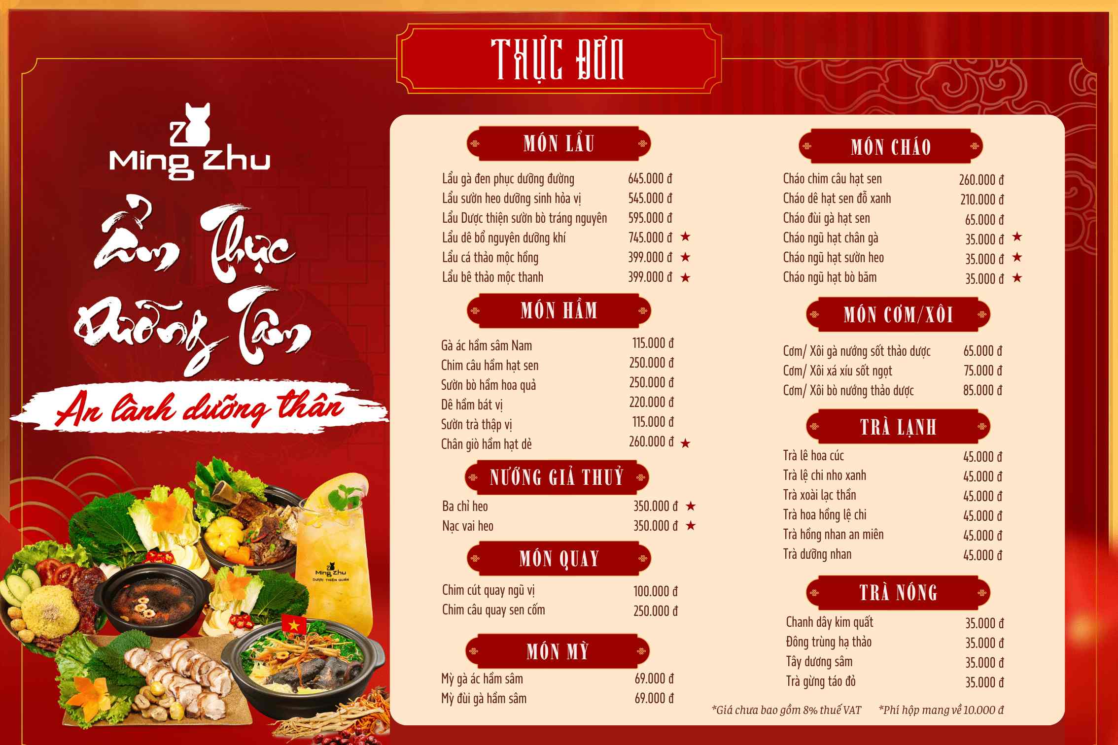 Thực đơn Ming Zhu được xây dựng phong phú và khoa học. Nhà hàng chú trọng các món hầm và món nước. Mỳ sen tươi gà ác hầm sâm là món tiêu biểu. Hương vị thanh nhẹ và dễ ăn. Chân giò hầm hạt dẻ mang cảm giác ấm bụng. Lẩu sườn bò Trạng Nguyên phù hợp cho bữa ăn quây quần. Cháo ngũ hạt giúp cơ thể nhẹ nhàng. Xôi gà nướng sốt thảo dược tạo dấu ấn riêng.