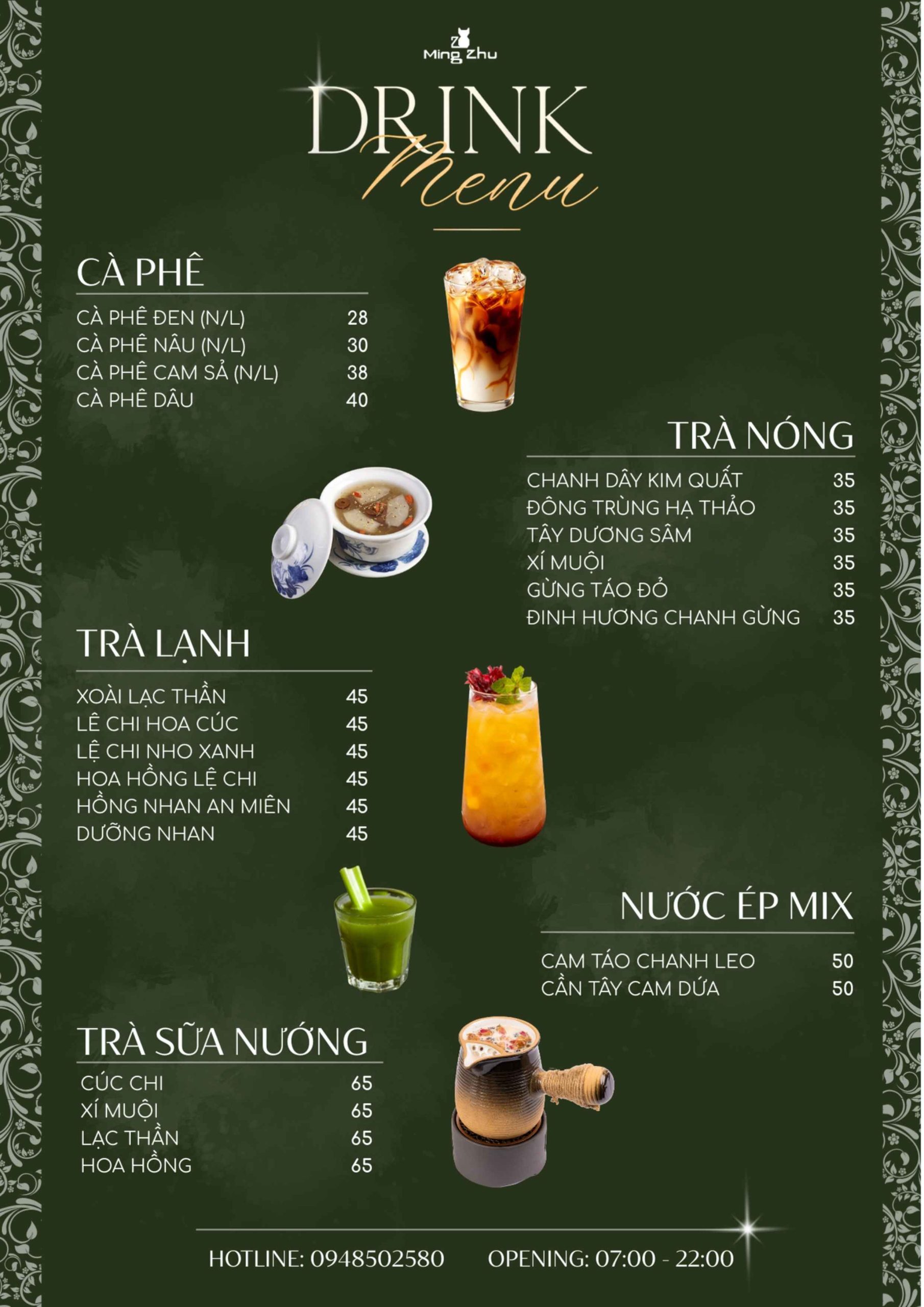 Đồ uống tại Ming Zhu đóng vai trò quan trọng trong trải nghiệm. Nhà hàng phục vụ nhiều loại trà dưỡng sinh. Trà lê hoa cúc mang vị thanh mát tự nhiên. Cà phê cam sả tạo cảm giác tỉnh táo nhẹ nhàng. Trà sữa nướng Vân Nam mang hương vị đặc trưng. Trà xí muội giúp cân bằng vị giác sau bữa ăn. Đồ uống được thiết kế không lấn át món chính. Sự kết hợp mang lại cảm giác trọn vẹn.