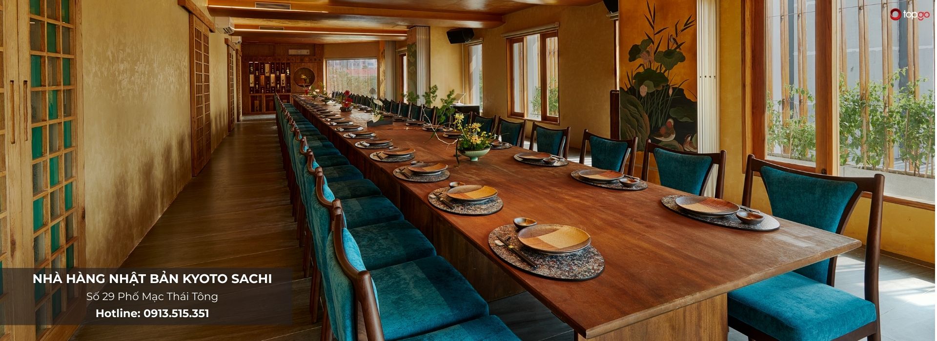 Hãy liên hệ TopGo/0913515351 để được giữ chỗ đẹp, chọn phòng riêng và tư vấn Omakase theo nhu cầu tại Nhà hàng Nhật Bản Kyoto Sachi.