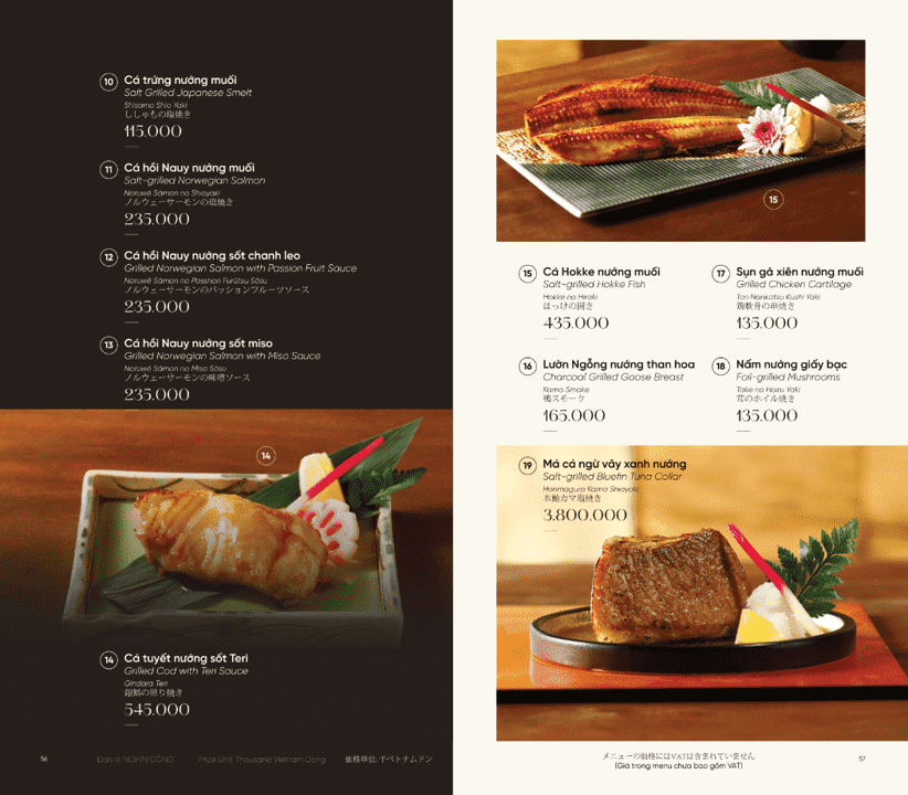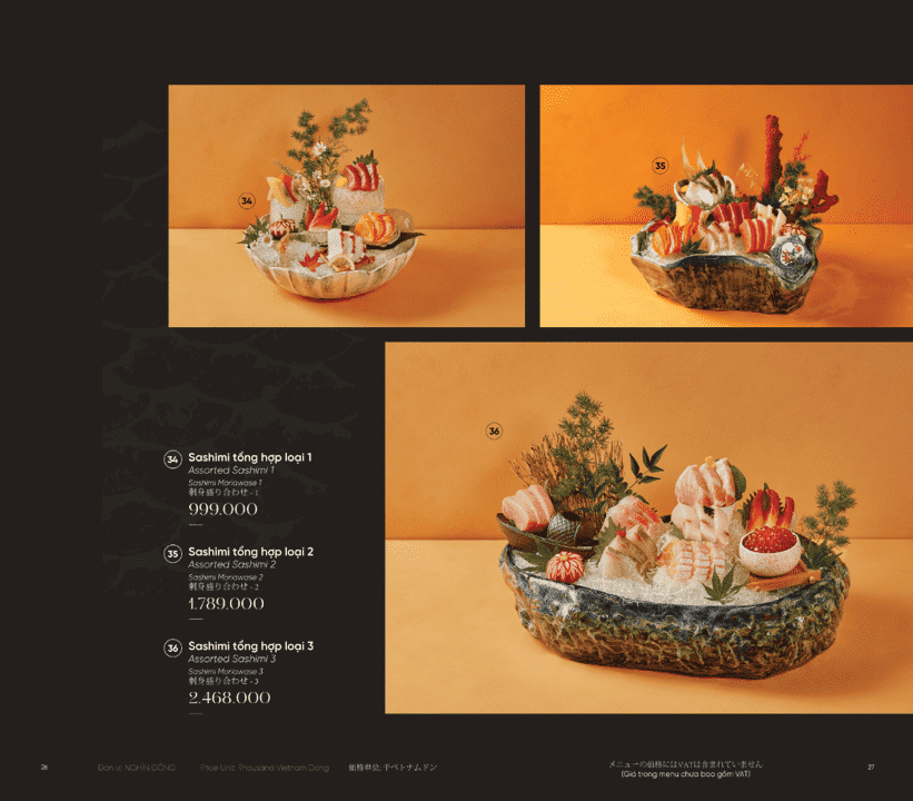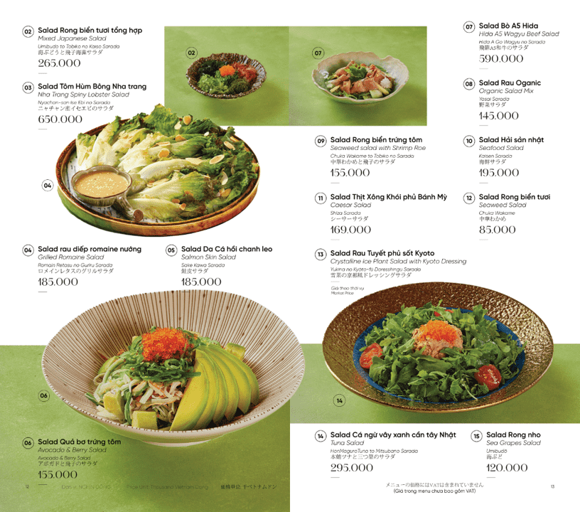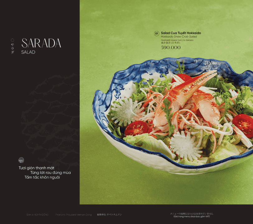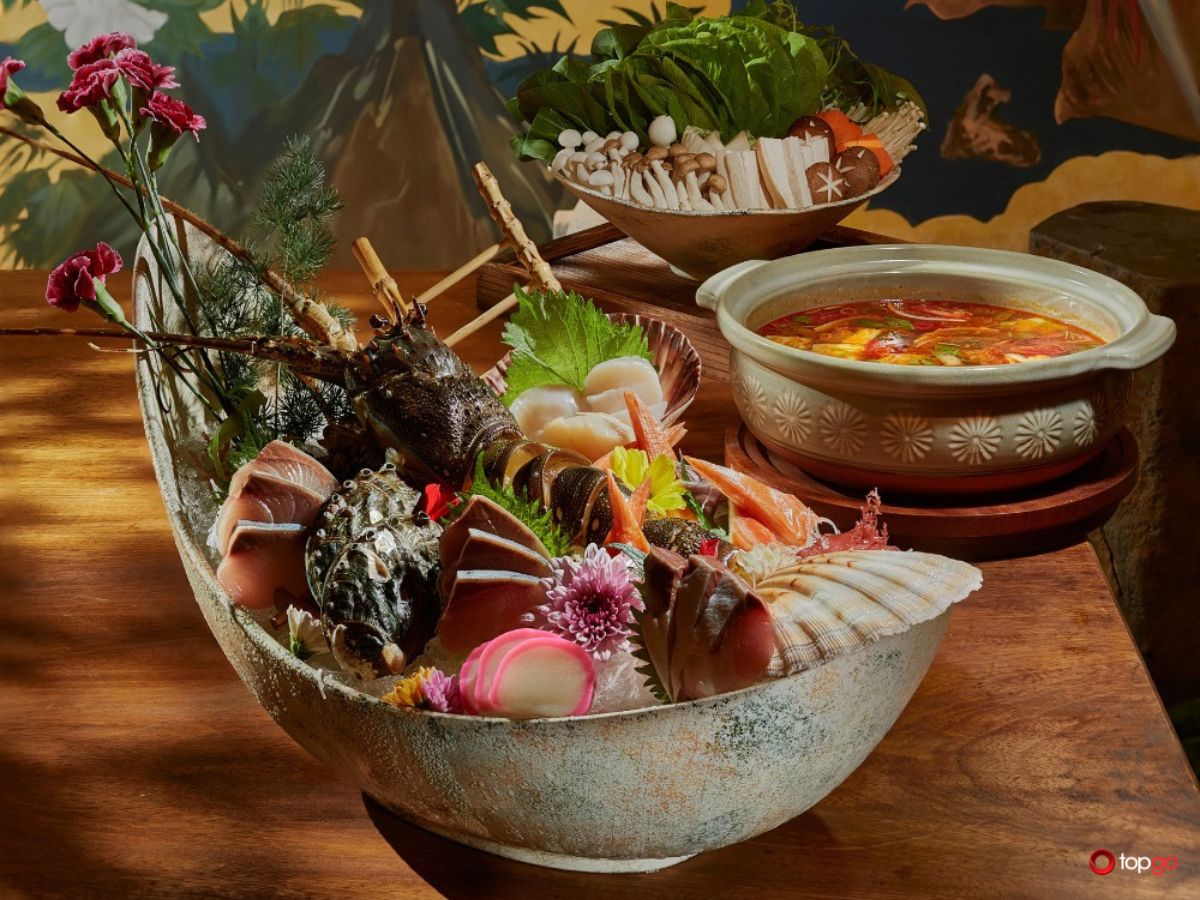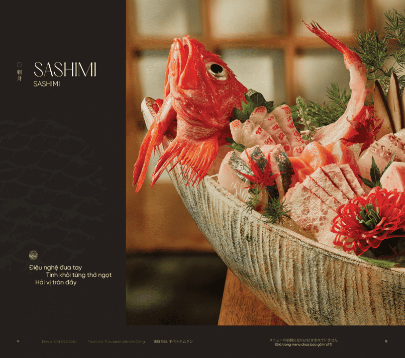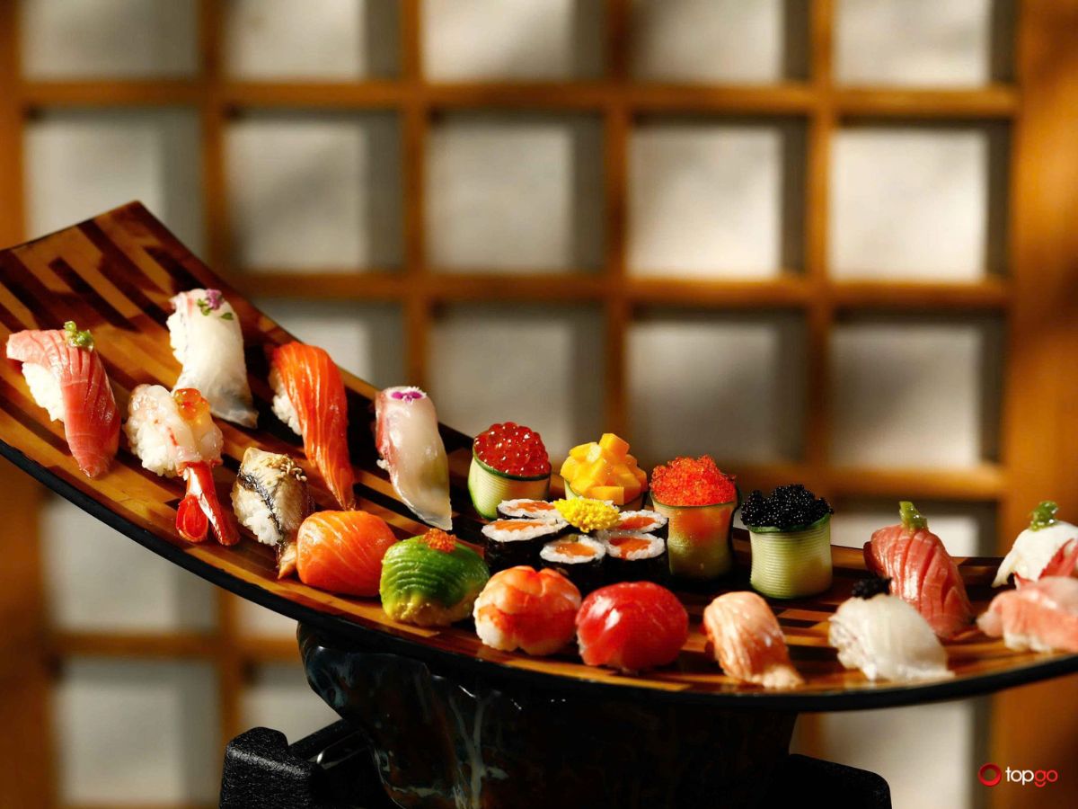 - Món nổi bật: Omakase cao cấp, Sushi & Sashimi tươi sống, Cá hồi King Salmon, Bò Nhật Hida A5, Hải sản Nhật nhập khẩu, Lẩu hải sản Nhật,…